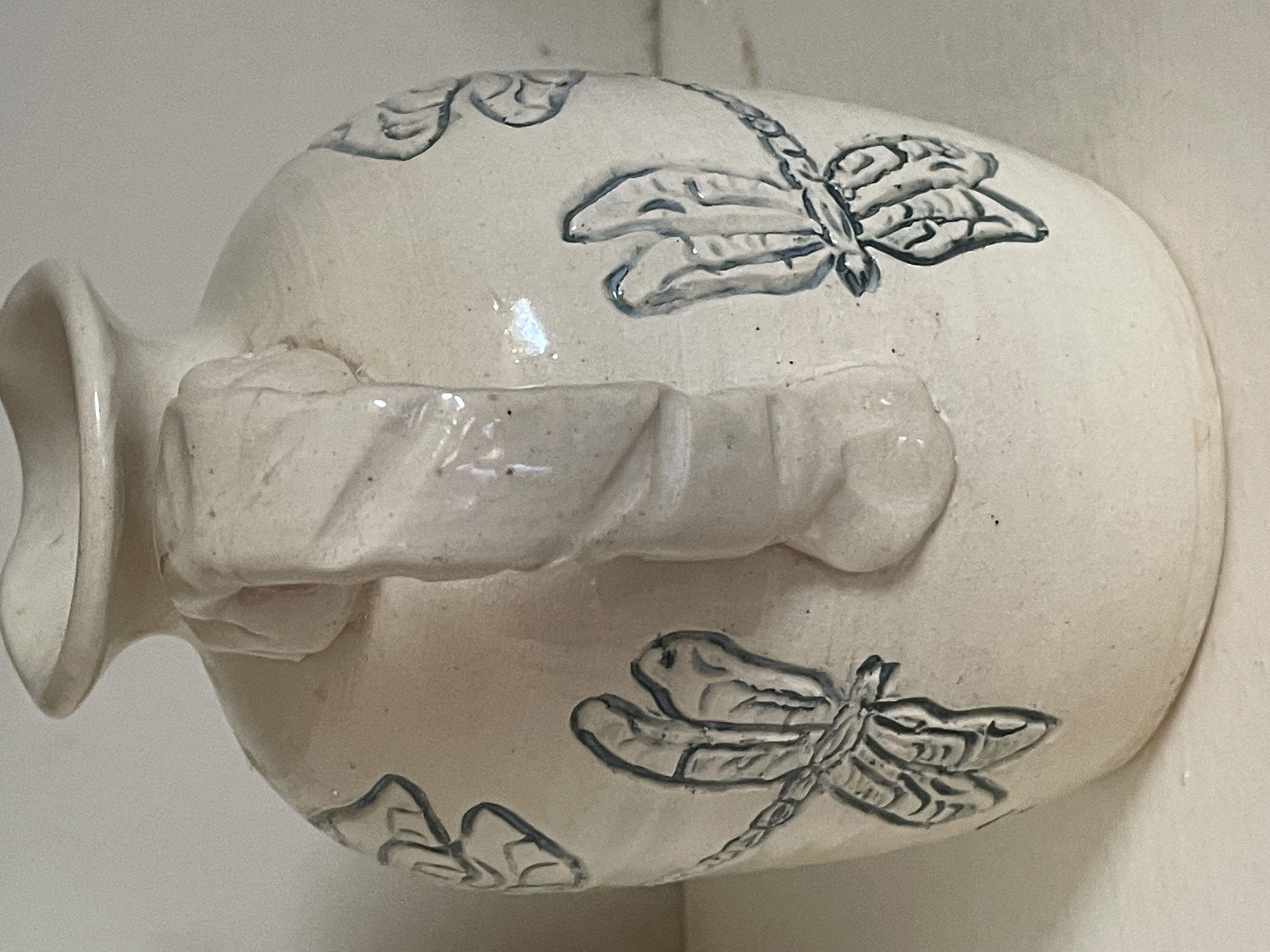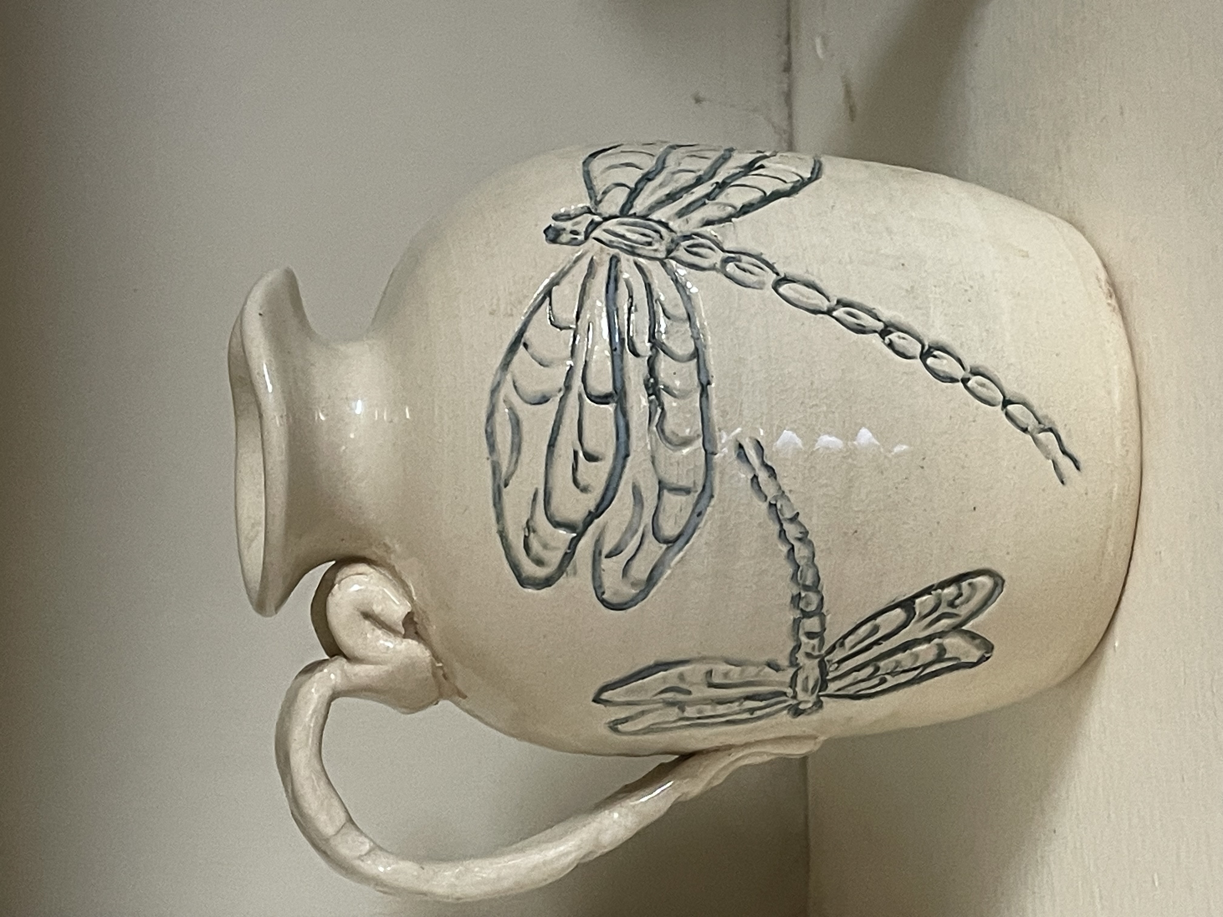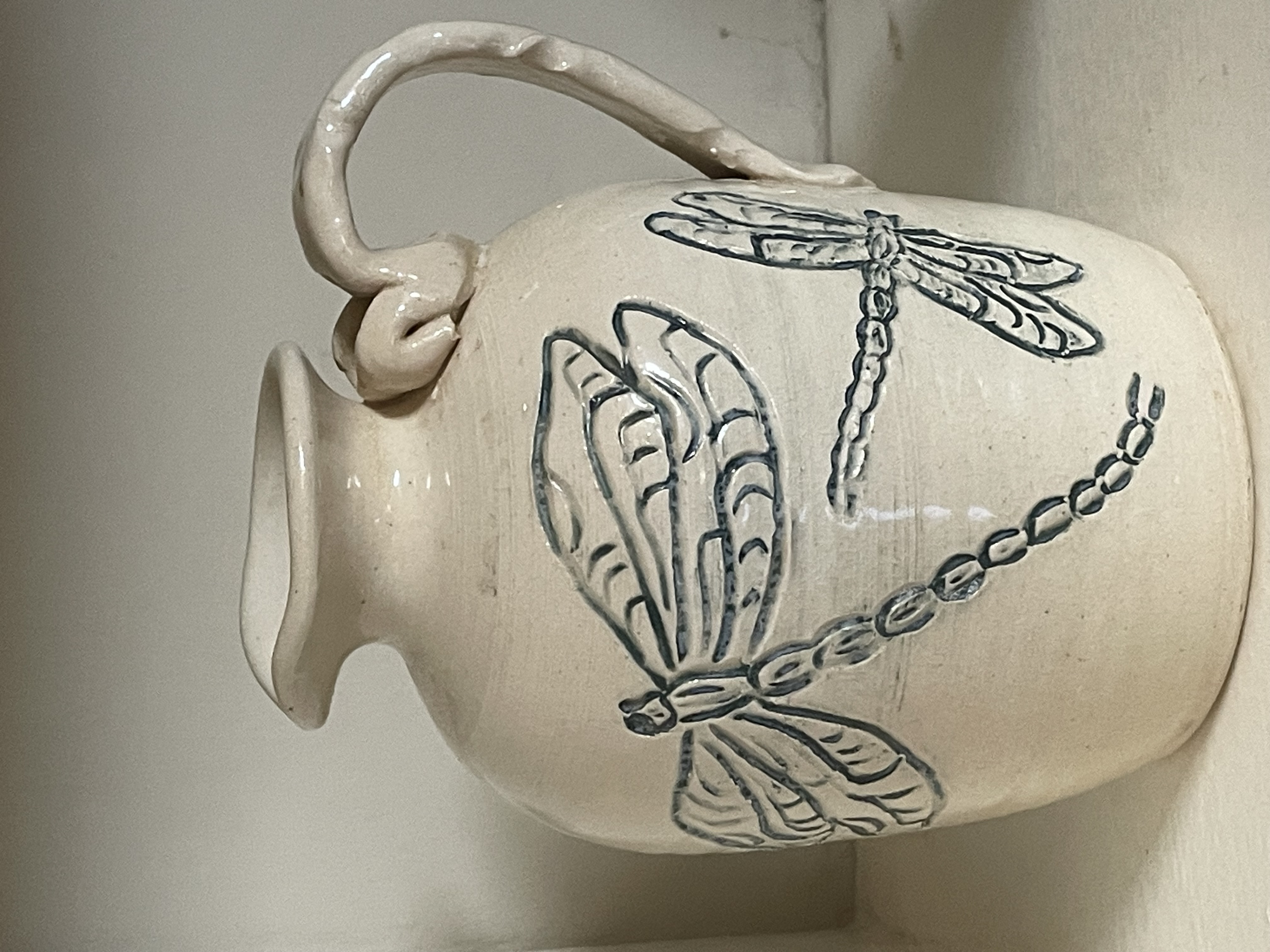 A single ceramic pitcher or jug, likely studio pottery, featuring a broad, rounded body and a thick, pulled handle. The vessel is covered in an off-white or cream-colored glossy glaze. The exterior decoration consists of multiple stylized dragonflies rendered in low relief and detailed with a grayish-blue underglaze or slip. The insects are visually connected by segmented, chain-like bodies that wrap around the circumference of the vessel. The rim is lightly pinched to form a spout. The unglazed base displays evidence of firing support marks and minor reddish-brown flecks. The base is marked with incised, illegible initials and a distinctive, incised impression resembling a small insect or dragonfly mark. Measures approximately 5.5″ tall.