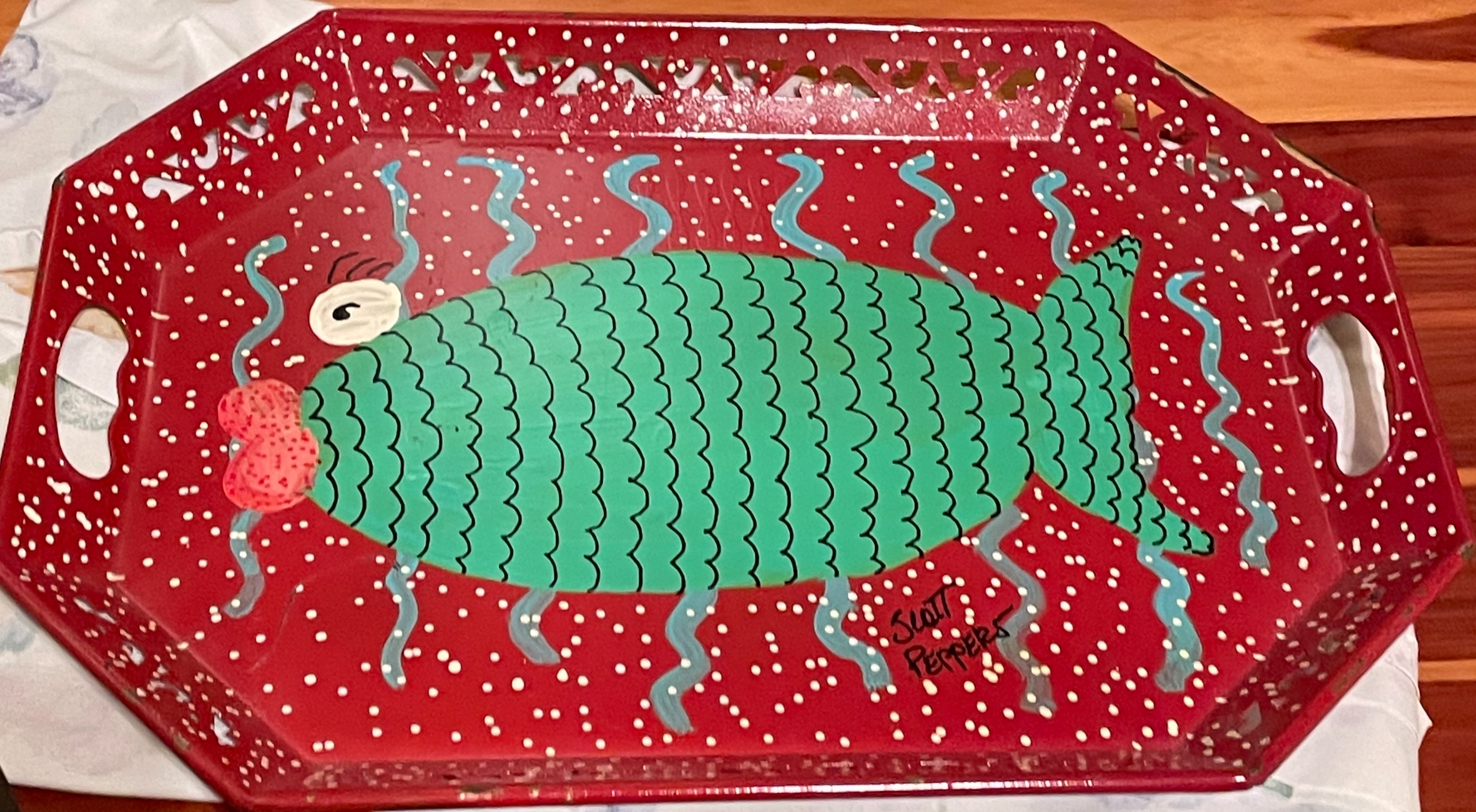 A single octagonal serving tray attributed to Scott Peppers Folk Art. The tray is constructed of painted metal or composite material, featuring integrated side handles and a decorative cut-out repeating pattern along the rim. The interior surface is finished in a speckled bright red base with numerous white dots. The surface is dominated by a large central design of a stylized green fish marked with black scales, a red mouth, and a large eye. Blue wavy lines rise from the fish’s body. The piece is signed “Scott Peppers” in black script near the tail of the fish. This piece is characteristic of the artist’s whimsical folk art style.