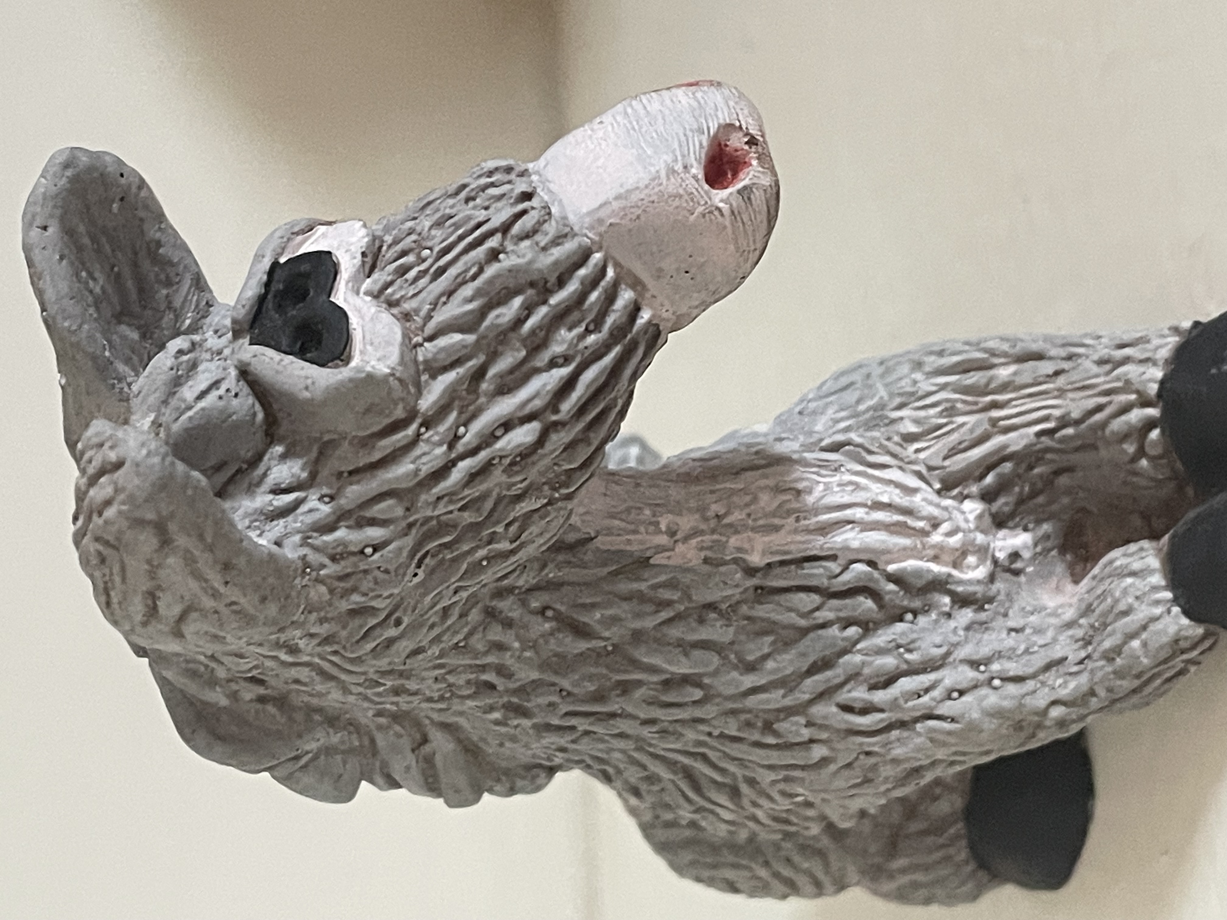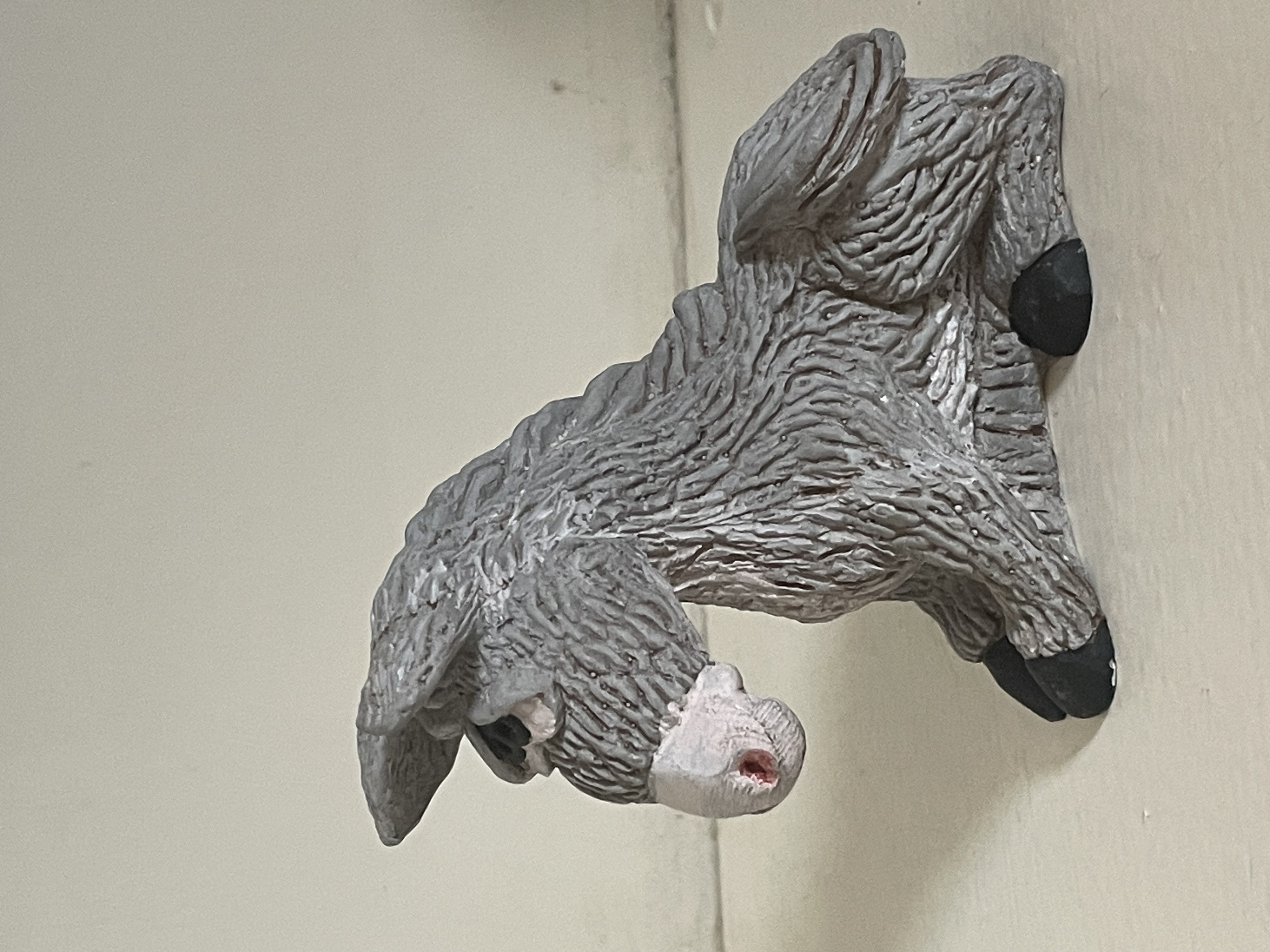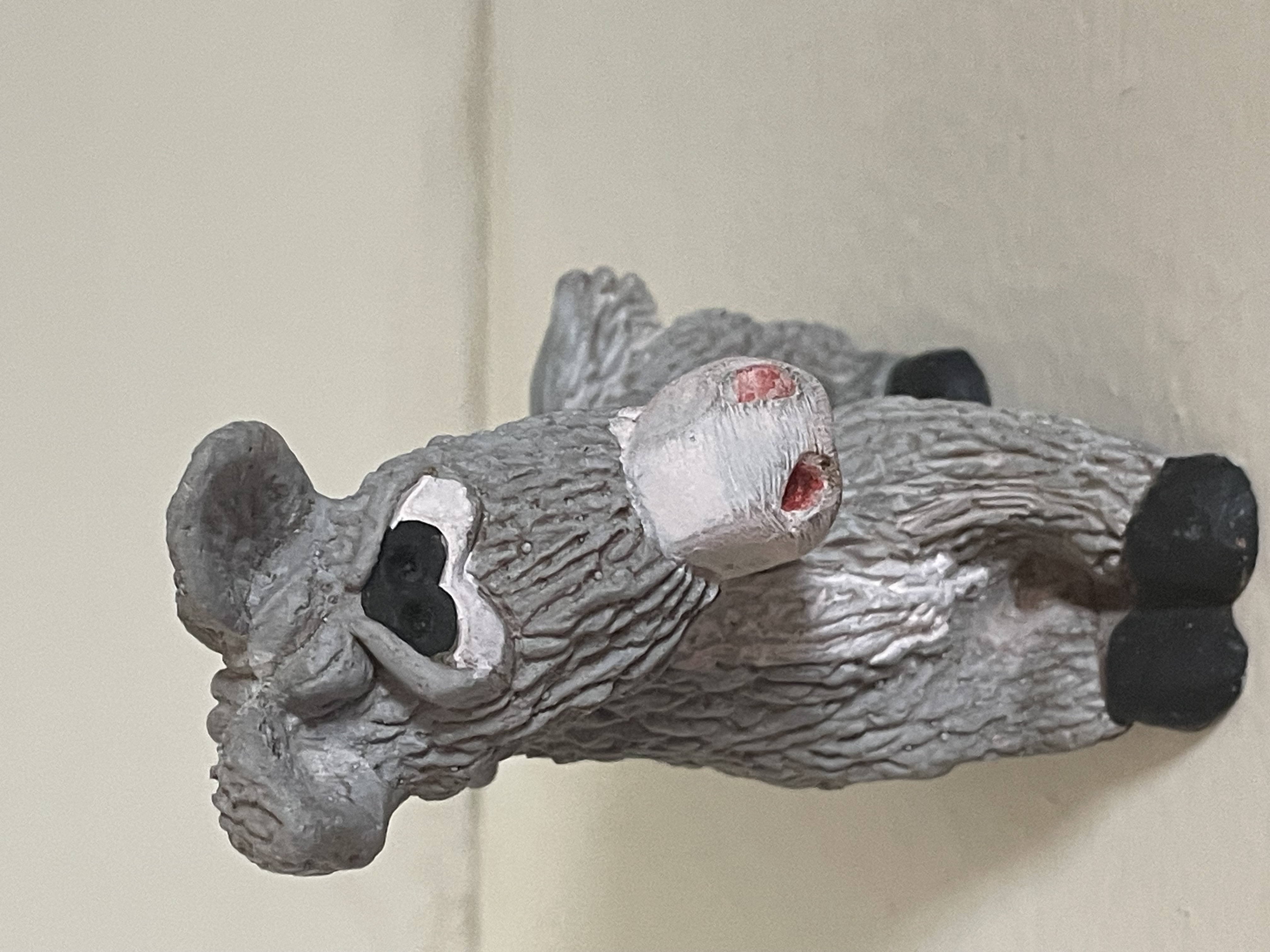 A single molded figurine depicting a seated donkey or burro. The construction material is likely painted ceramic or resin. The surface features heavy texture designed to mimic coarse animal fur. The figurine is painted predominantly gray, with details including a white snout, black hooves, and black-accented eyes. Minor pink or red paint is used to highlight the nostrils. The style suggests it may have been intended as a component of a Nativity (presepio) set or used as a standalone decorative piece. No visible maker’s marks, stamps, or inscriptions are present. Measures approximately 4″ tall.