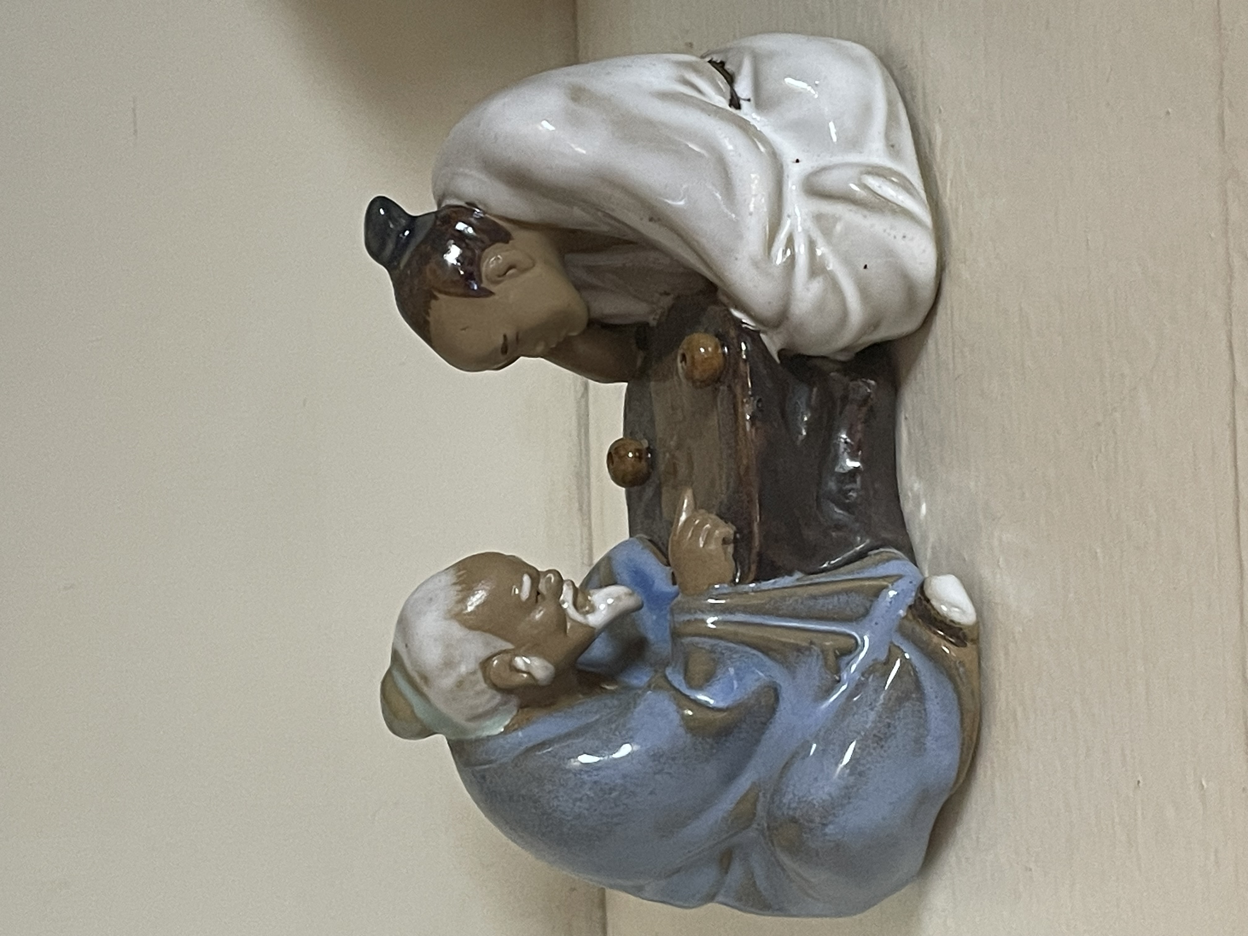 A single glazed ceramic figural sculpture identified through market consensus as Shiwan Mud men pottery. The piece depicts two seated East Asian figures engaged in a board game, likely Go or Weiqi. The figure on the left is portrayed as an elder with a white beard, wearing a speckled blue glaze robe, and is shown pointing toward the game surface. Opposite him, the second figure wears a glossy white glaze robe and leans contemplatively on his hand. The low, organically shaped table is finished in a dark brown glaze. Three small, rounded game pieces are visible on the playing surface. The sculpture employs variegated and glossy glazes characteristic of decorative Shiwan ceramics. No maker’s marks or inscriptions are visible. Measures approximately 3.5″x 5″.