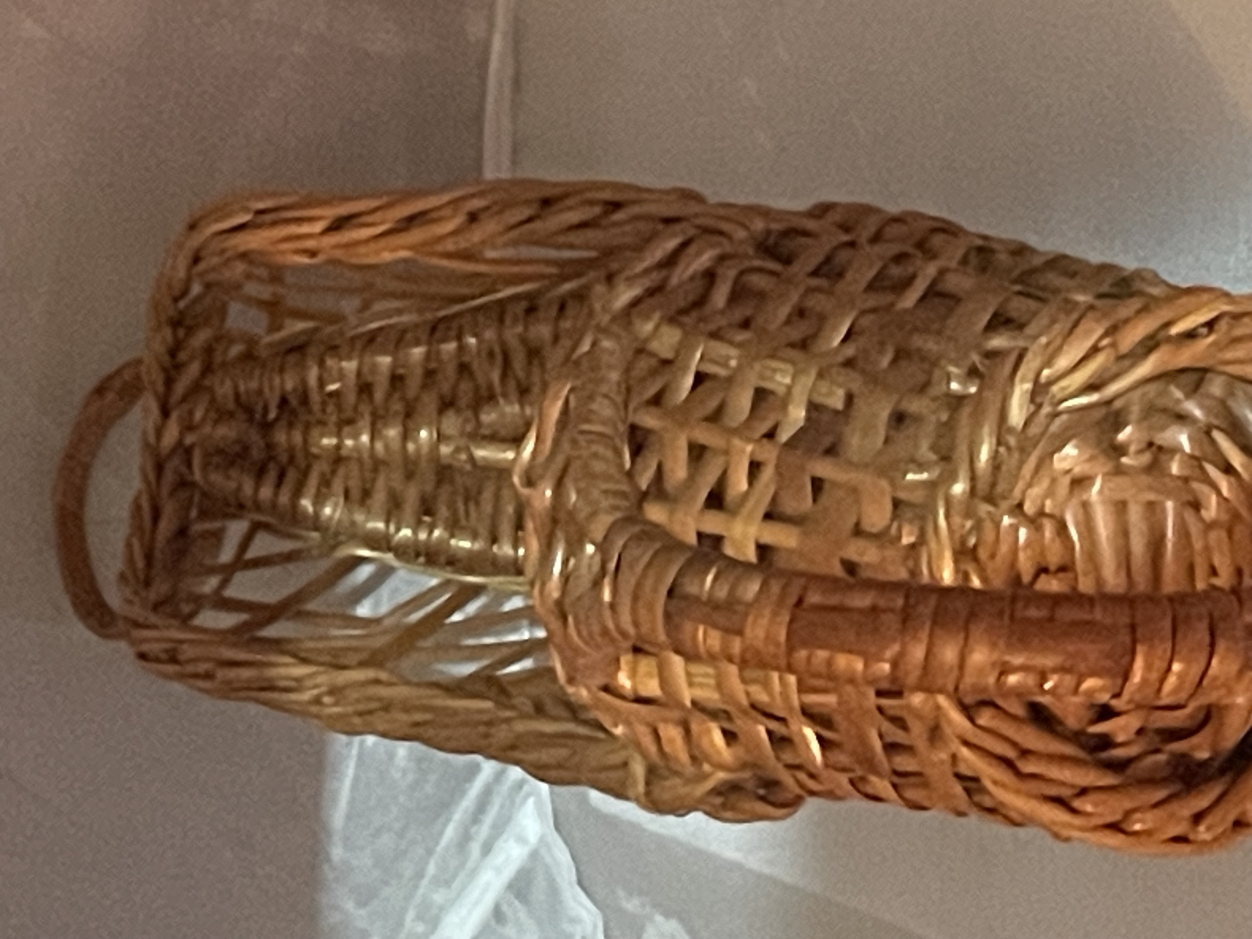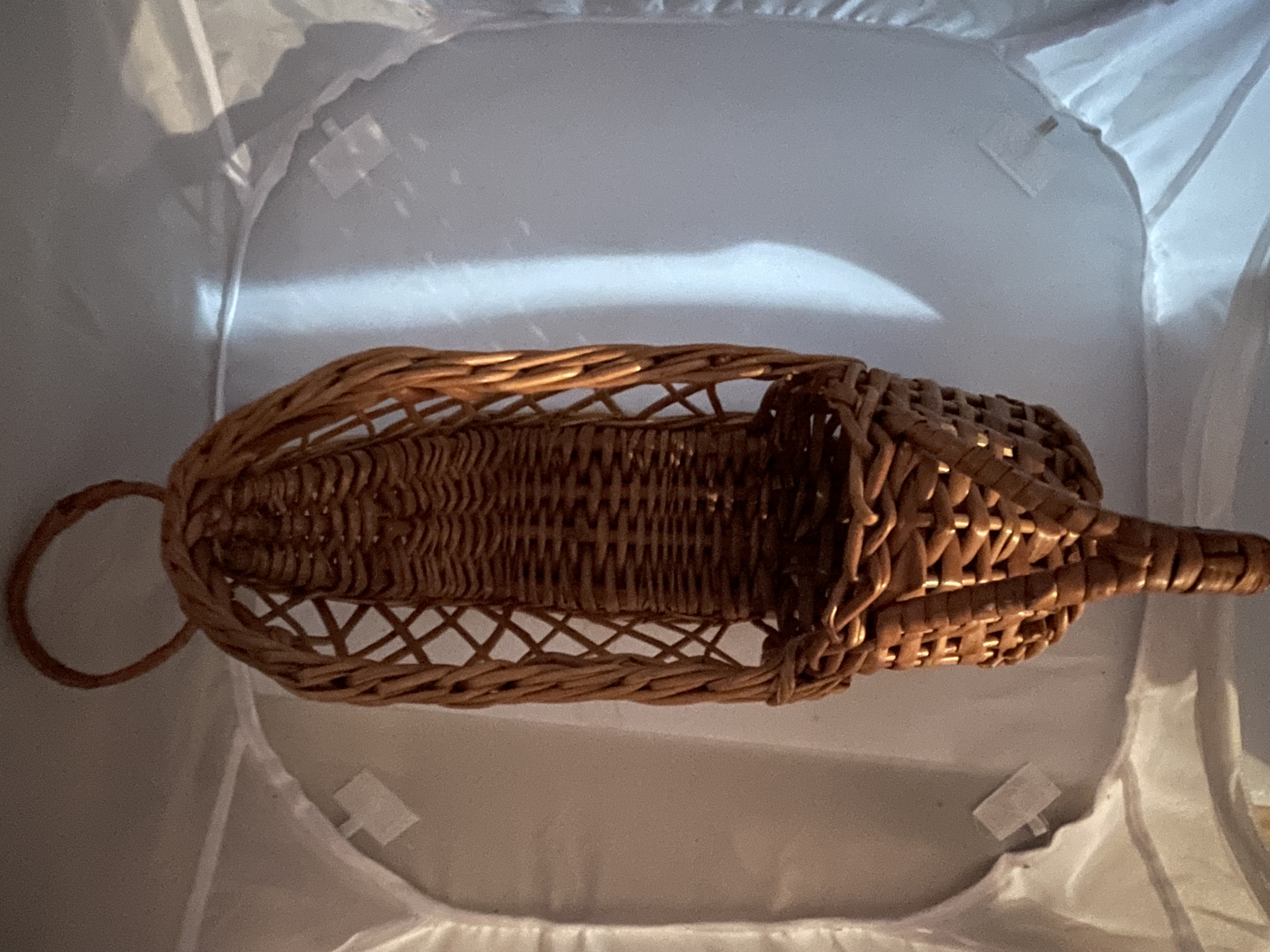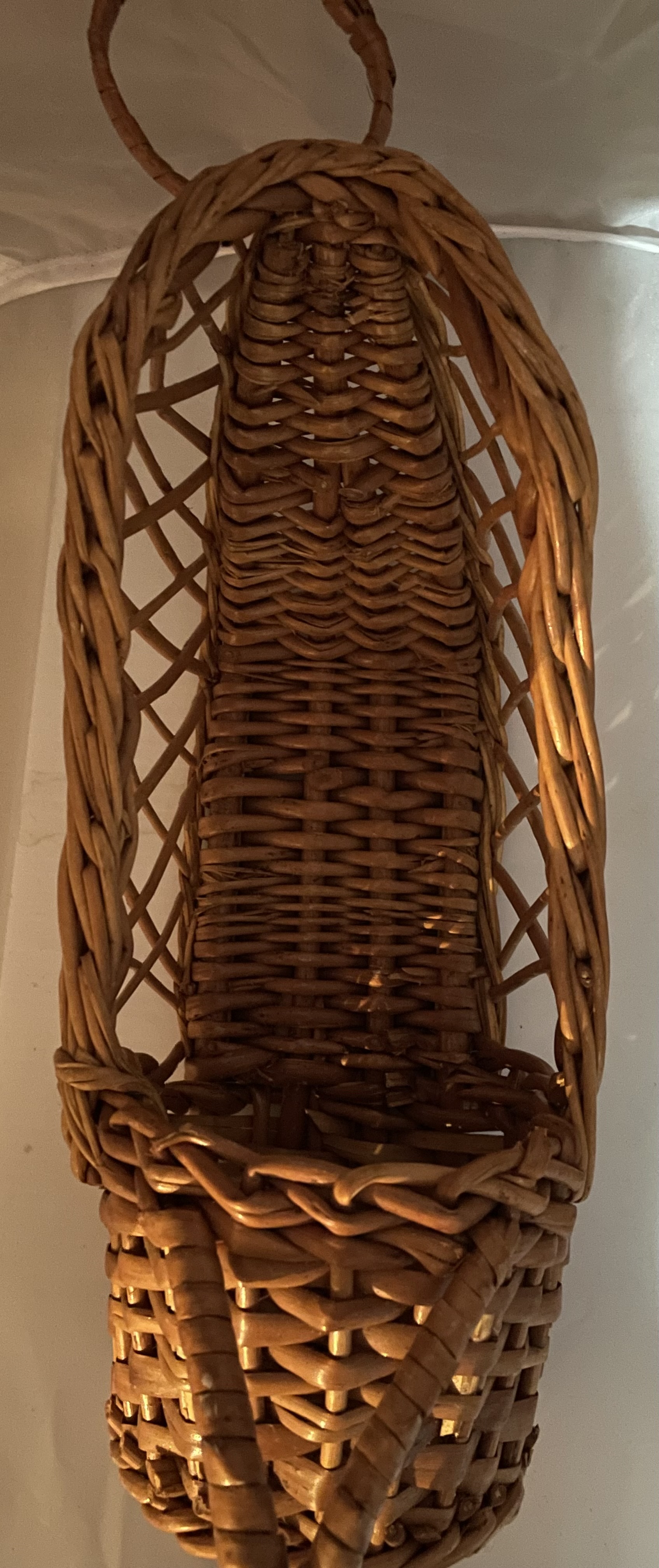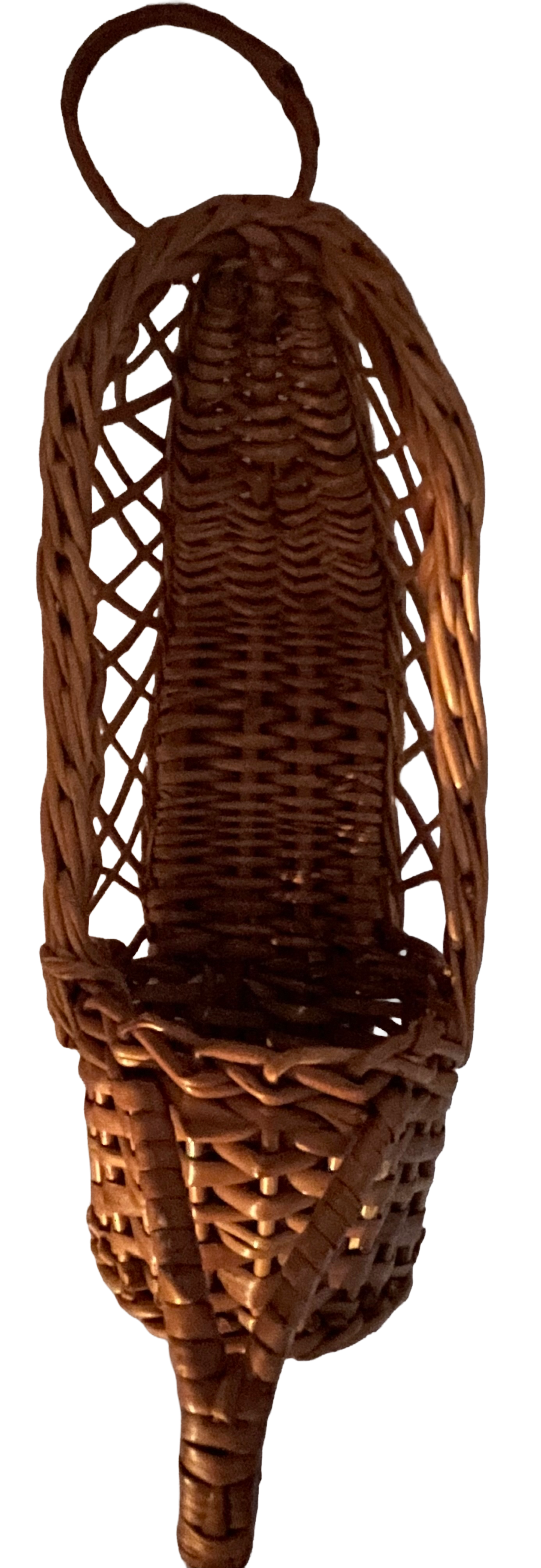 A vintage hand-woven wicker or rattan specialty basket designed to function as a wine or Chianti bottle holder or carrier. The object is constructed from natural woven material, displaying a warm brown tone. The form resembles a deep slipper or boot, featuring a tightly woven, solid central base and open, cross-hatched latticework forming the sides. The structure is reinforced by thick, braided coils forming the rim and frame. A small woven loop is present at the tapered top, and another loop is visible at the toe or base, suggesting it is designed for vertical hanging or display. The style is traditional rustic basketry. No visible text or markings are present.