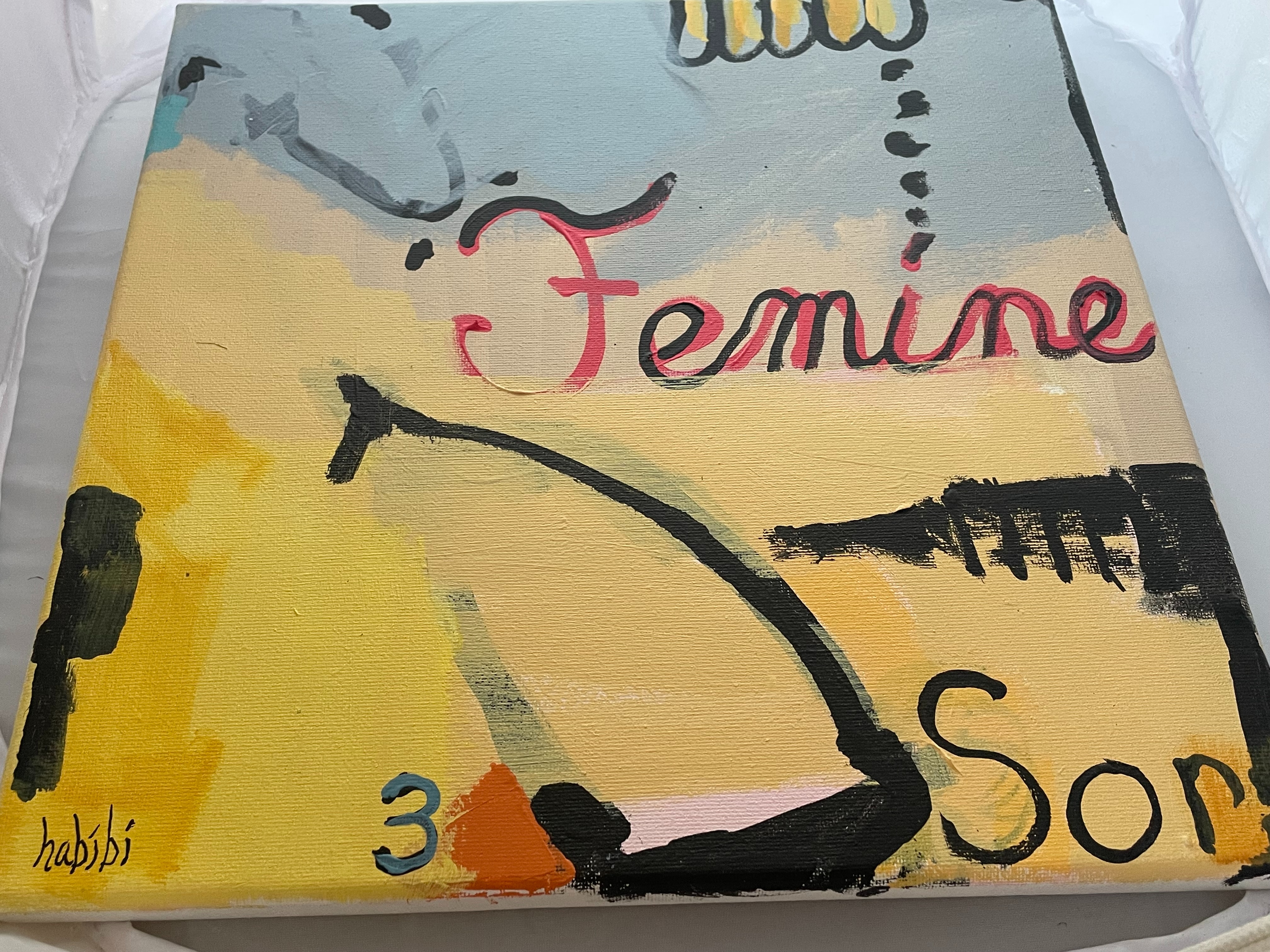 This is an original abstract painting by the artist Christina Habibi, executed in acrylic on stretched canvas. The composition features large fields of color, primarily bright yellow, light blue-grey, and black, applied with expressionistic brushstrokes. The work incorporates both figurative and textual elements, including the central script word “Femine” rendered in pink. Additional inscriptions include the partial black text “Sor,” the blue number “3,” and the Arabic word “habibi” (meaning “my love” or “my darling”) visible in the lower-left corner and along the upper edge, likely serving as a signature or title component. The painting is presented on a standard gallery-wrapped canvas.