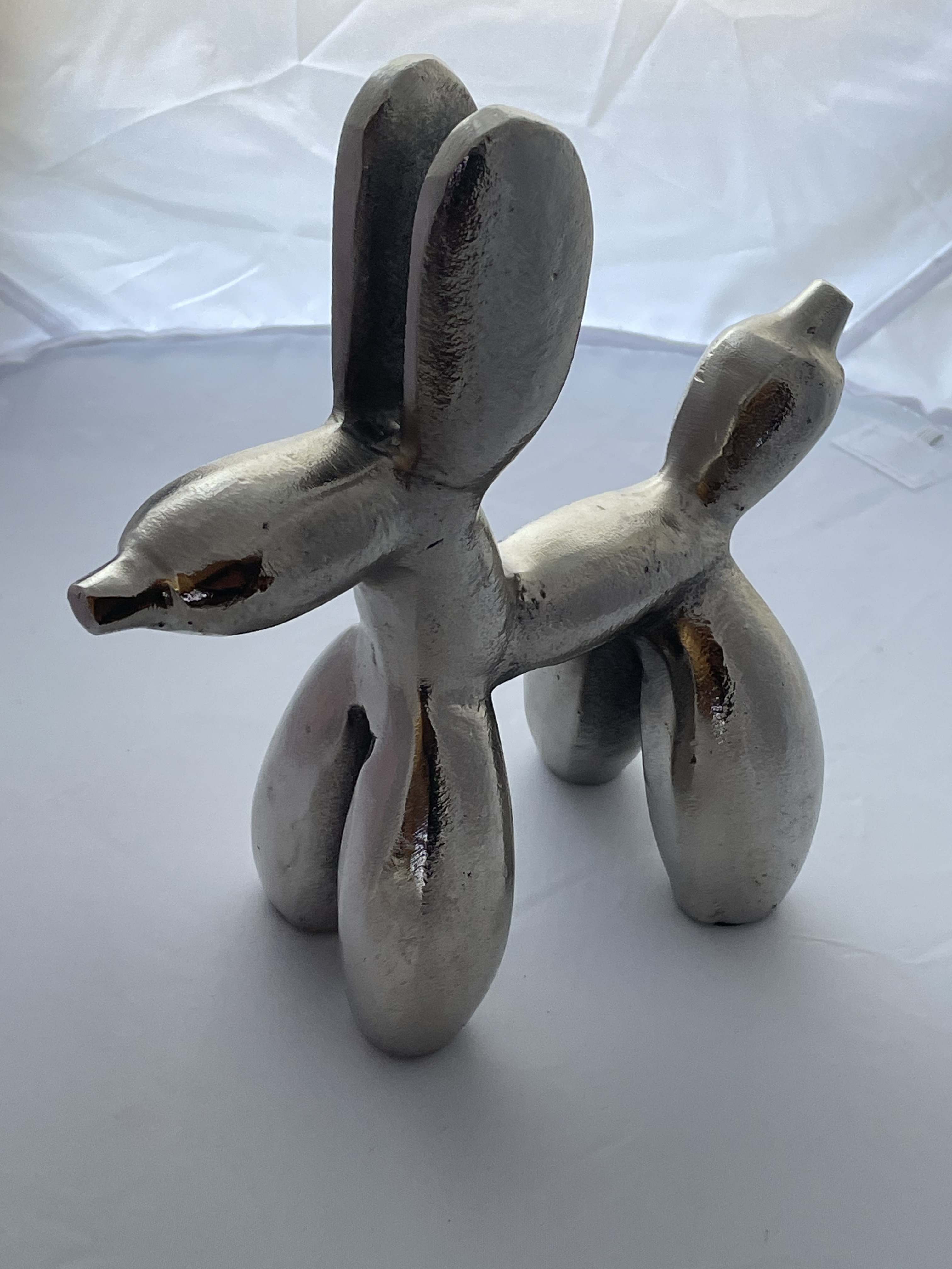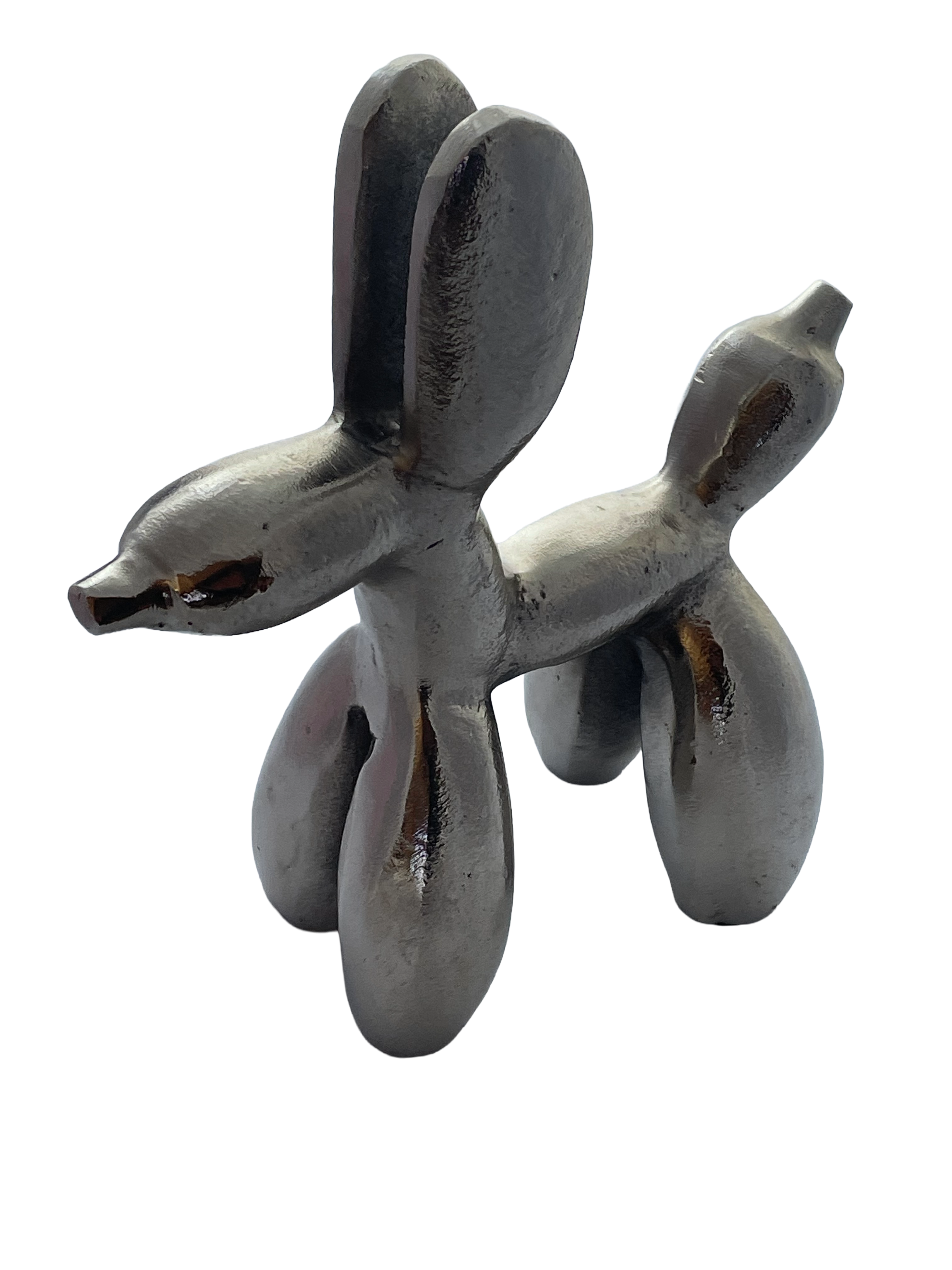 A single decorative sculpture executed in the style of contemporary Pop Art, depicting a stylized balloon dog. The object is constructed from a substantial, textured core material, likely resin or ceramic, and finished with a highly reflective, polished metallic silver coating. This item is representative of mass-produced modern home decor accents and is commonly marketed as a small animal figurine or desktop decoration. No manufacturer markings, signatures, or foundry stamps are visible. Approximately 8″ tall.