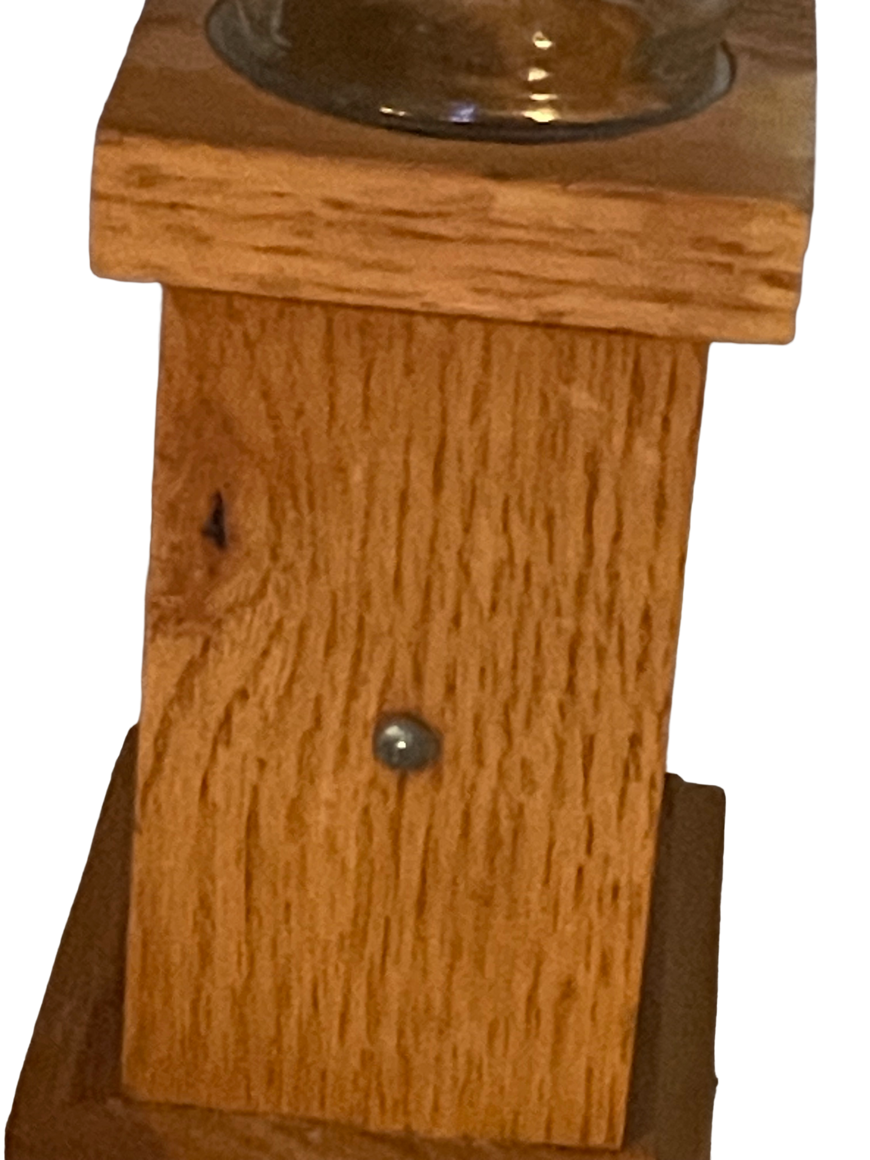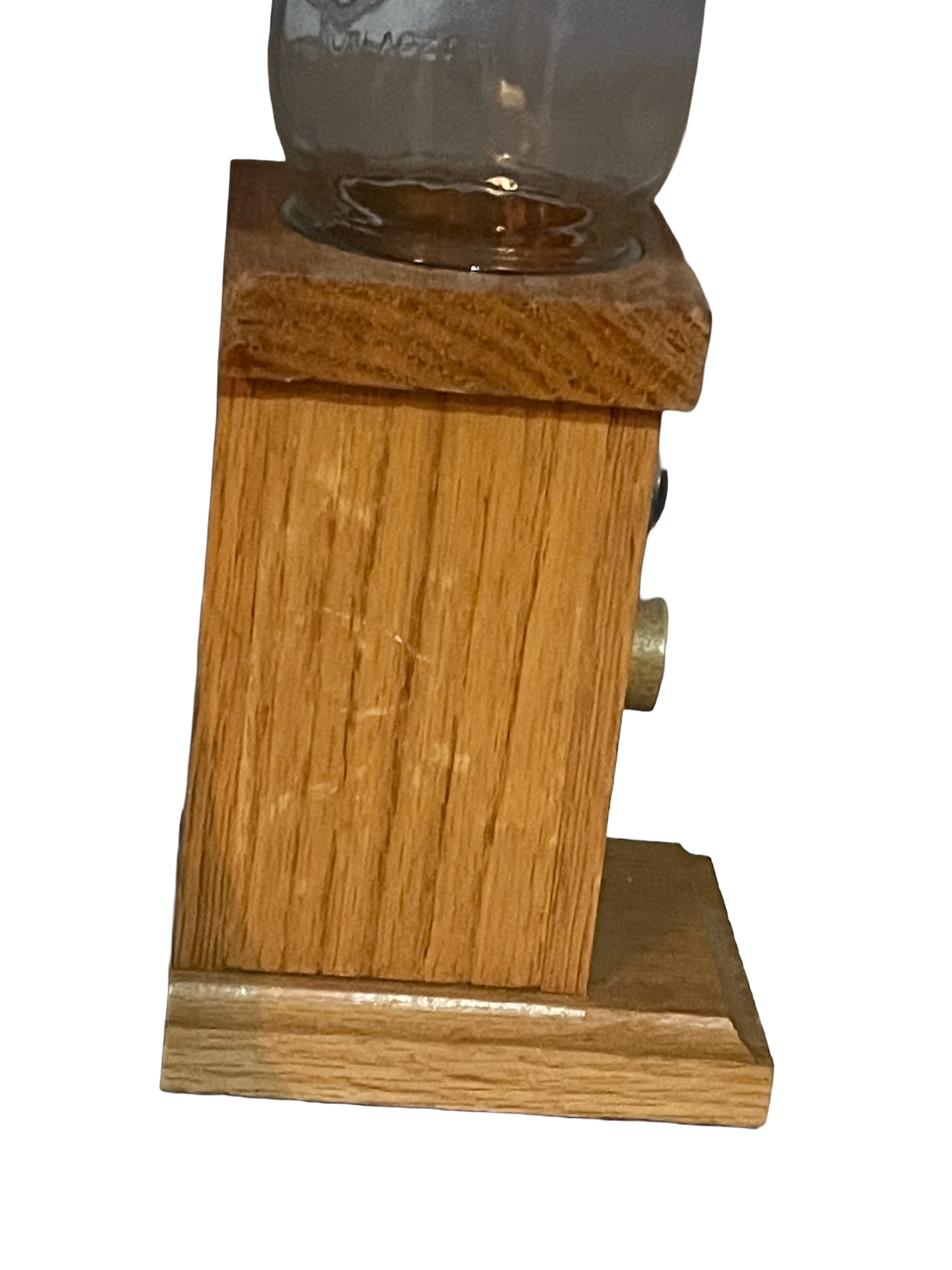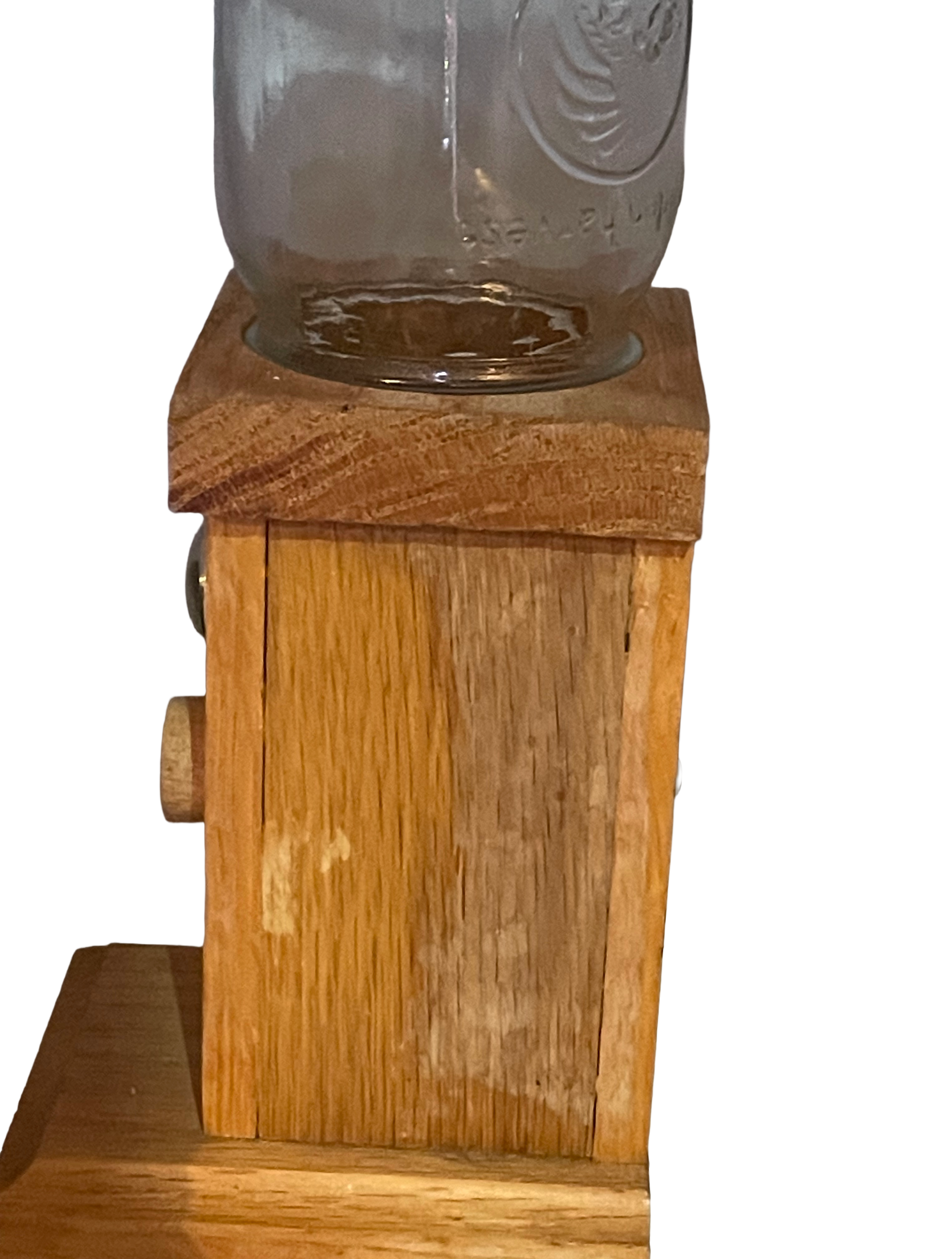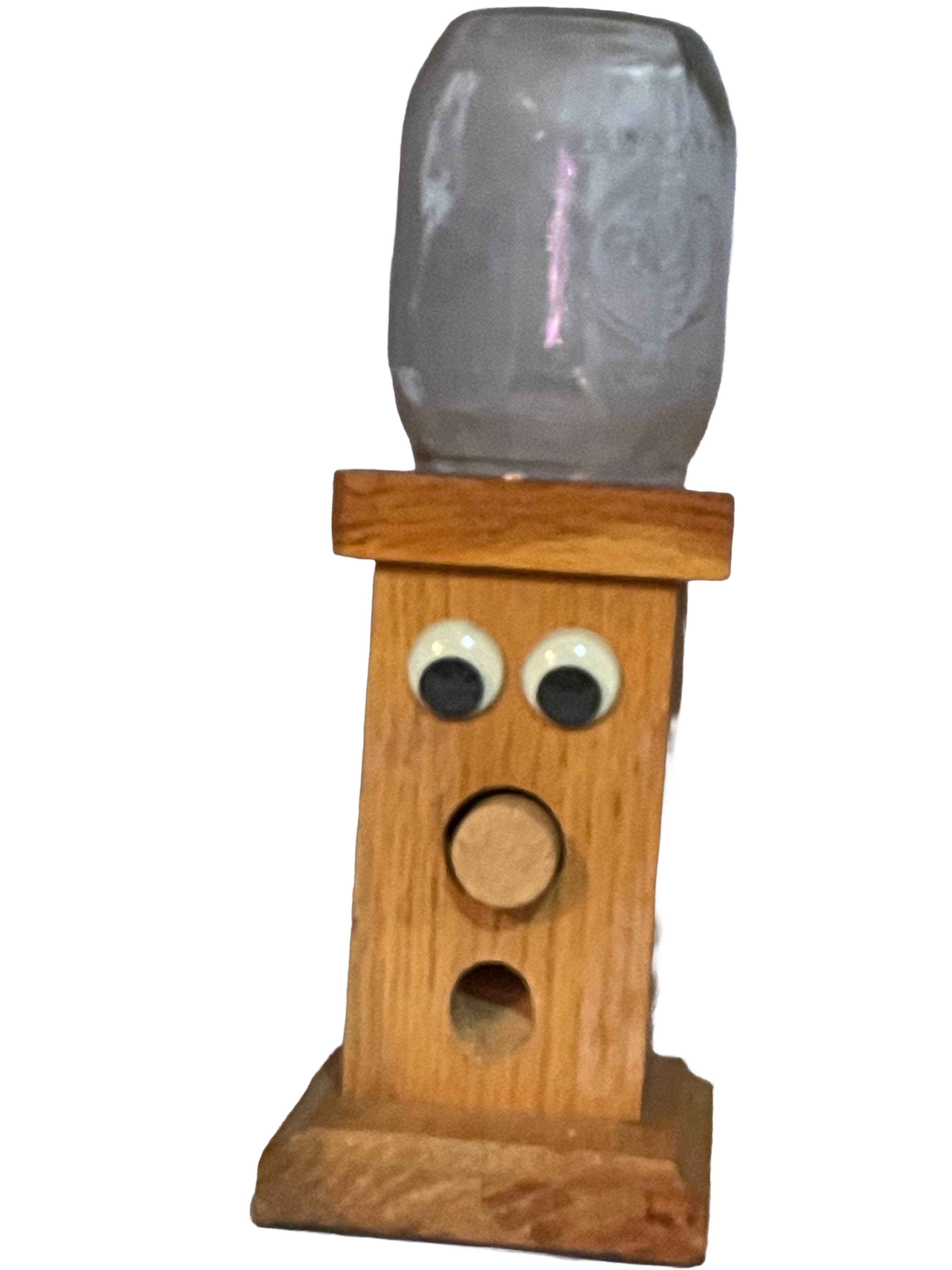 A single vintage handmade wooden gumball and candy dispenser, crafted in the folk art style. The structure is constructed from light-toned wood, forming a rectangular body set upon a stepped base. The dispenser is anthropomorphized with a face featuring two plastic googly eyes and a circular wooden plug serving as a nose. The front panel includes a circular dispensing or collection hole. The reservoir consists of an inverted clear glass jar, likely of the Mason type, which displays indistinct molded text near its base. A small wooden dowel or plug is visible on the side, suggesting a rudimentary dispensing mechanism for nuts, candy, or gumballs. Visible construction includes surface-mounted metal fasteners.