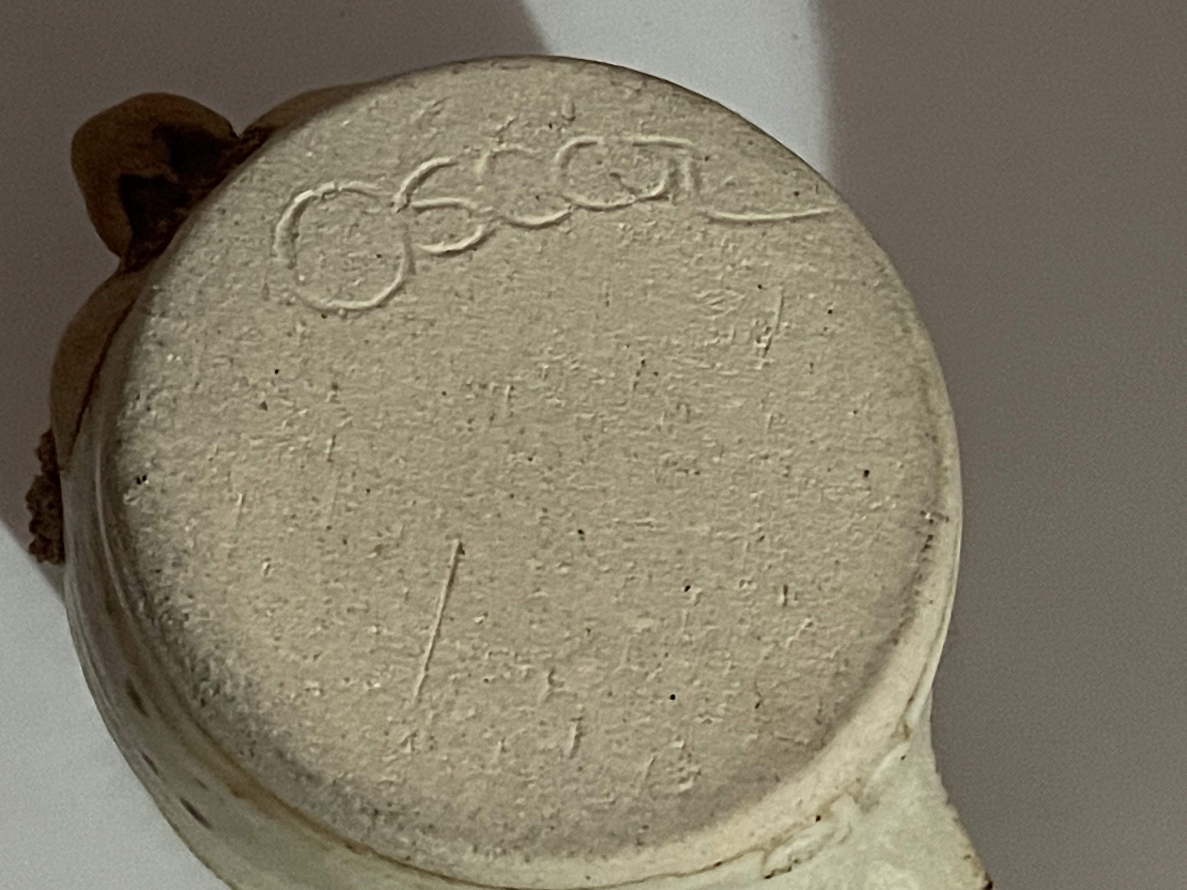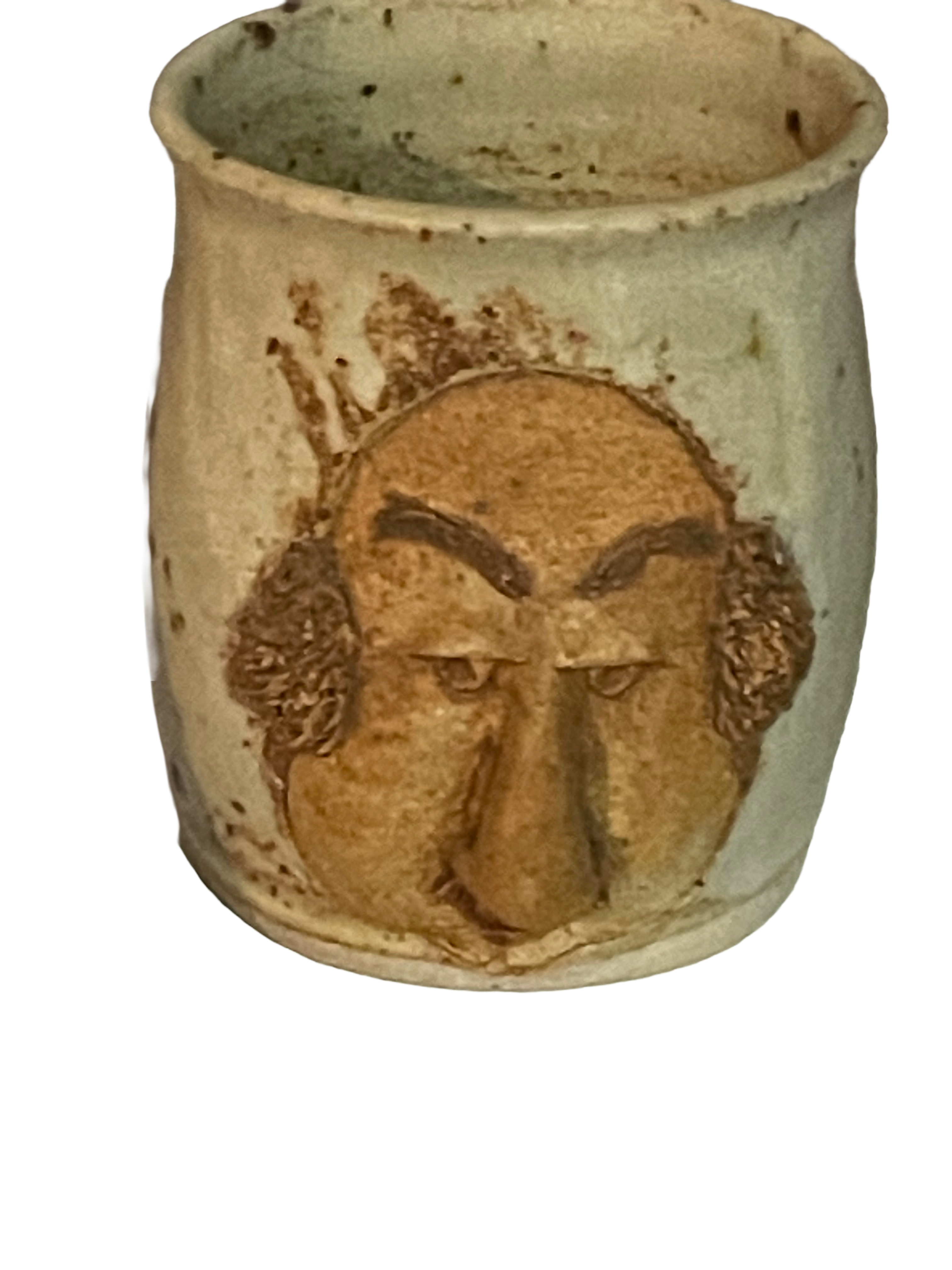 A single stoneware face mug, identified by the incised signature “OSCAR” on the base. The vessel is crafted from speckled stoneware pottery with an off-white or cream ground glaze. The cylindrical body slightly bulges, terminating in a flared rim. The decoration features a grotesque male face applied in relief, utilizing reddish-brown iron-oxide or manganese accents to highlight prominent features, including textured hair, heavy brows, and a large nose, characteristic of folk art studio pottery face mug designs. This item is a single cup.