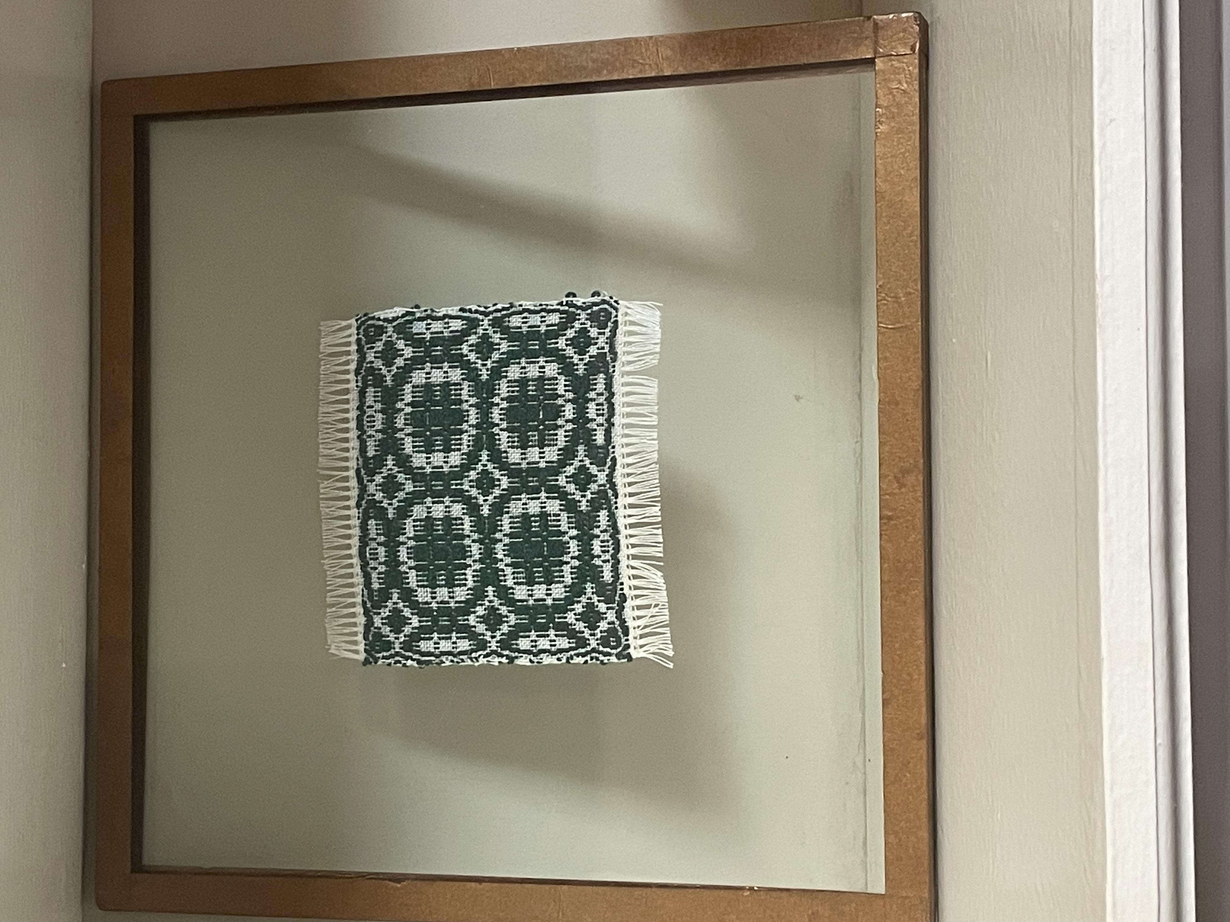A single textile specimen encased within a metal frame. The item is identified through market consensus as a Framed Hand-Knotted Moroccan Rug Wall Art fragment. The textile material, likely wool or cotton/linen thread, is woven in a dense, two-color geometric pattern, utilizing dark forest green and white threads to create repeating medallion, quatrefoil, and diamond motifs. The weaving technique is consistent with an overshot or supplementary weft style. The top and bottom edges of the fragment display intact white fringe.