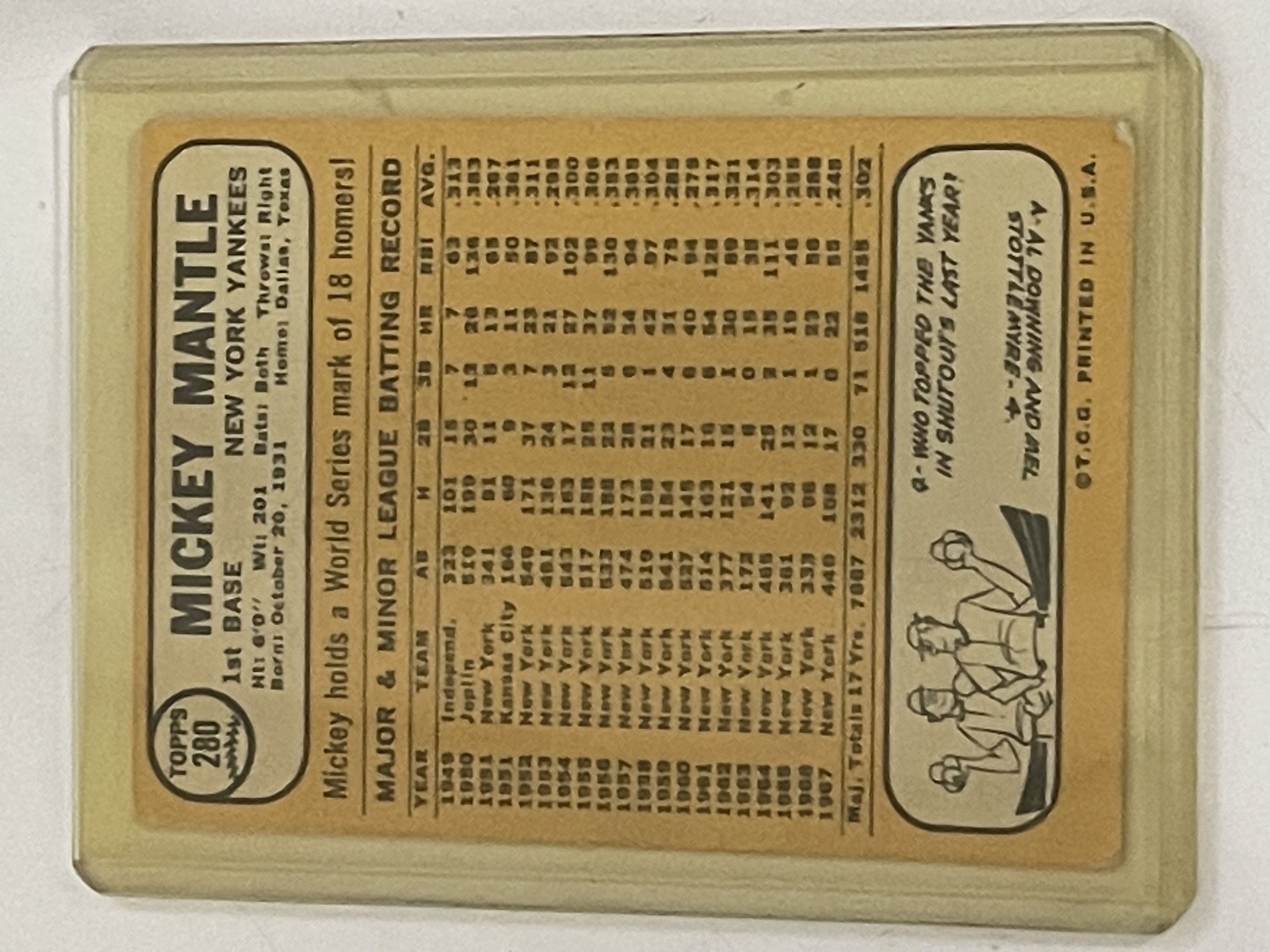 A single vintage baseball trading card featuring New York Yankees legend Mickey Mantle. This is the 1968 Topps card, identified by card number 280. The card is printed on cardstock and utilizes the distinctive 1968 Topps design, characterized by a textured tan/gold border framing a color action photograph of Mantle holding a bat. The front displays the player’s name, MICKEY MANTLE, and position/team text, 1st BASE YANKEES. The reverse side features the card number 280, biographical details, and comprehensive career statistics covering the years 1950 through 1967. The reverse also includes the copyright mark “©T.C.G. PRINTED IN U.S.A.” and a quiz cartoon panel.