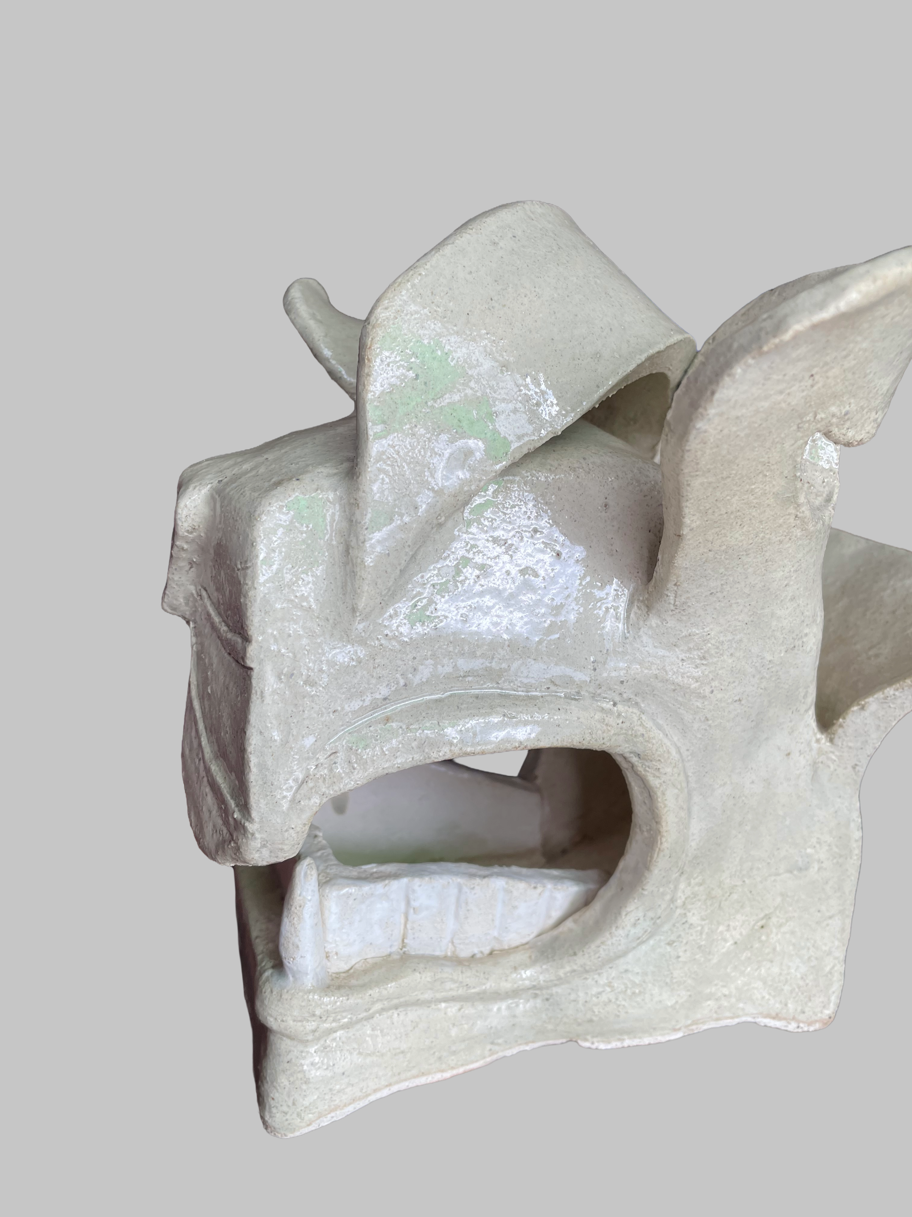 A single contemporary studio pottery ceramic sculpture, constructed from stoneware. The piece is highly stylized, depicting an abstract animal head, characterized by large, rounded ears and a prominent, blocky muzzle. The mouth reveals large, rectangular teeth. The sculpture is covered primarily in a speckled, semi-matte off-white glaze which highlights the texture of the clay body. The interior sections and the teeth are finished in a starker white glaze. Faint pooling of glaze with a subtle light green tint is visible in recessed areas, particularly on the sides and ears. The form suggests use as a decorative vessel or mask. No visible maker’s marks or signatures are present.