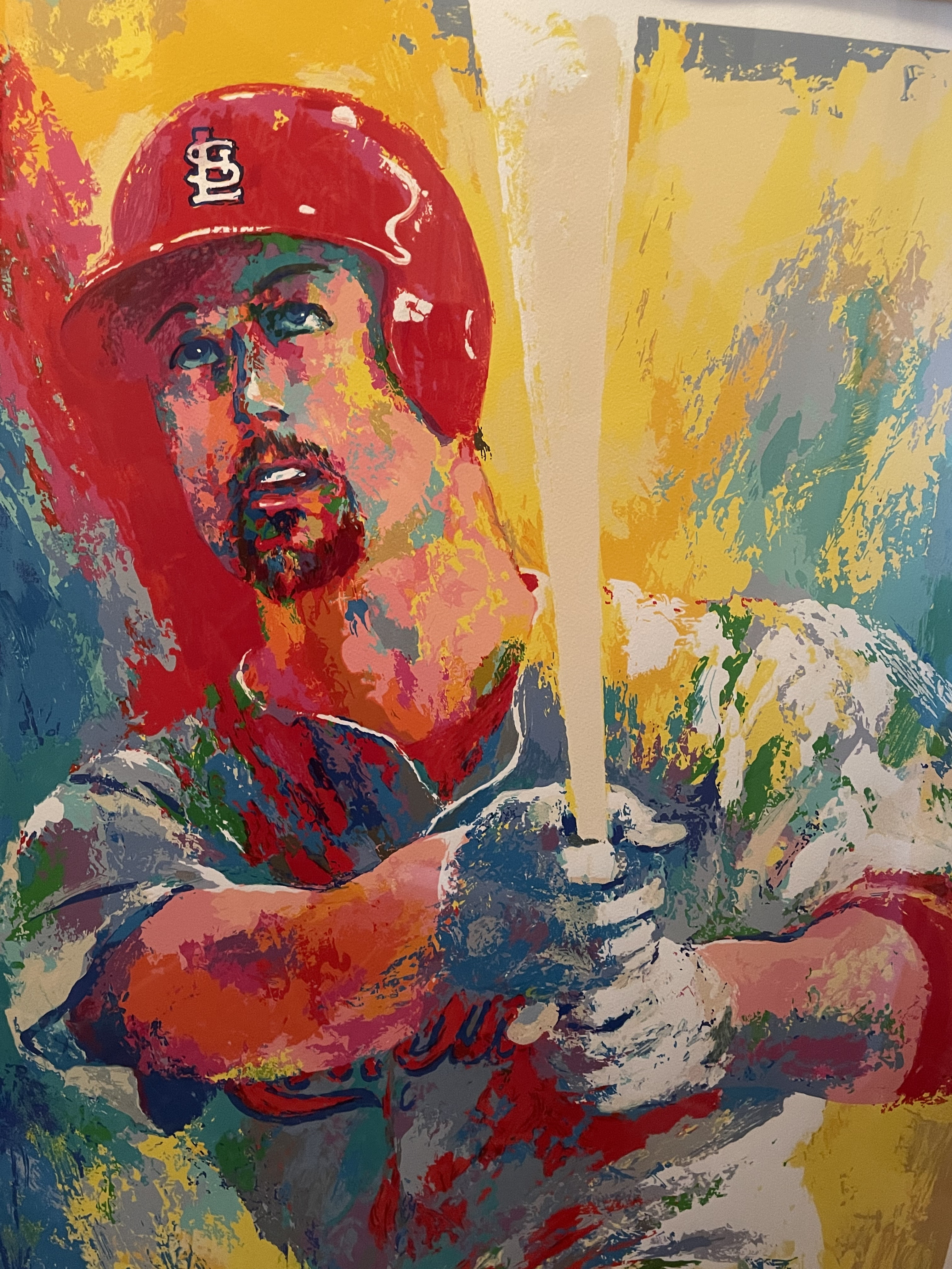 A single framed limited edition print attributed to LeRoy Neiman, titled “Mark McGwire.” The work is an expressionistic sports portrait depicting the St. Louis Cardinals baseball player Mark McGwire in a dynamic batting stance, wearing a red helmet marked with the distinctive “StL” logo. The composition utilizes broad, high-saturation brushstrokes in primary and secondary colors, characteristic of Neiman’s style. The print is presented under glazing with a broad white mat board inside a simple gold-tone frame. Visible markings include a handwritten edition number (appearing as a fraction) and a secondary signature on the lower left margin, and a primary hand-signed signature (attributed to LeRoy Neiman) on the lower right margin.