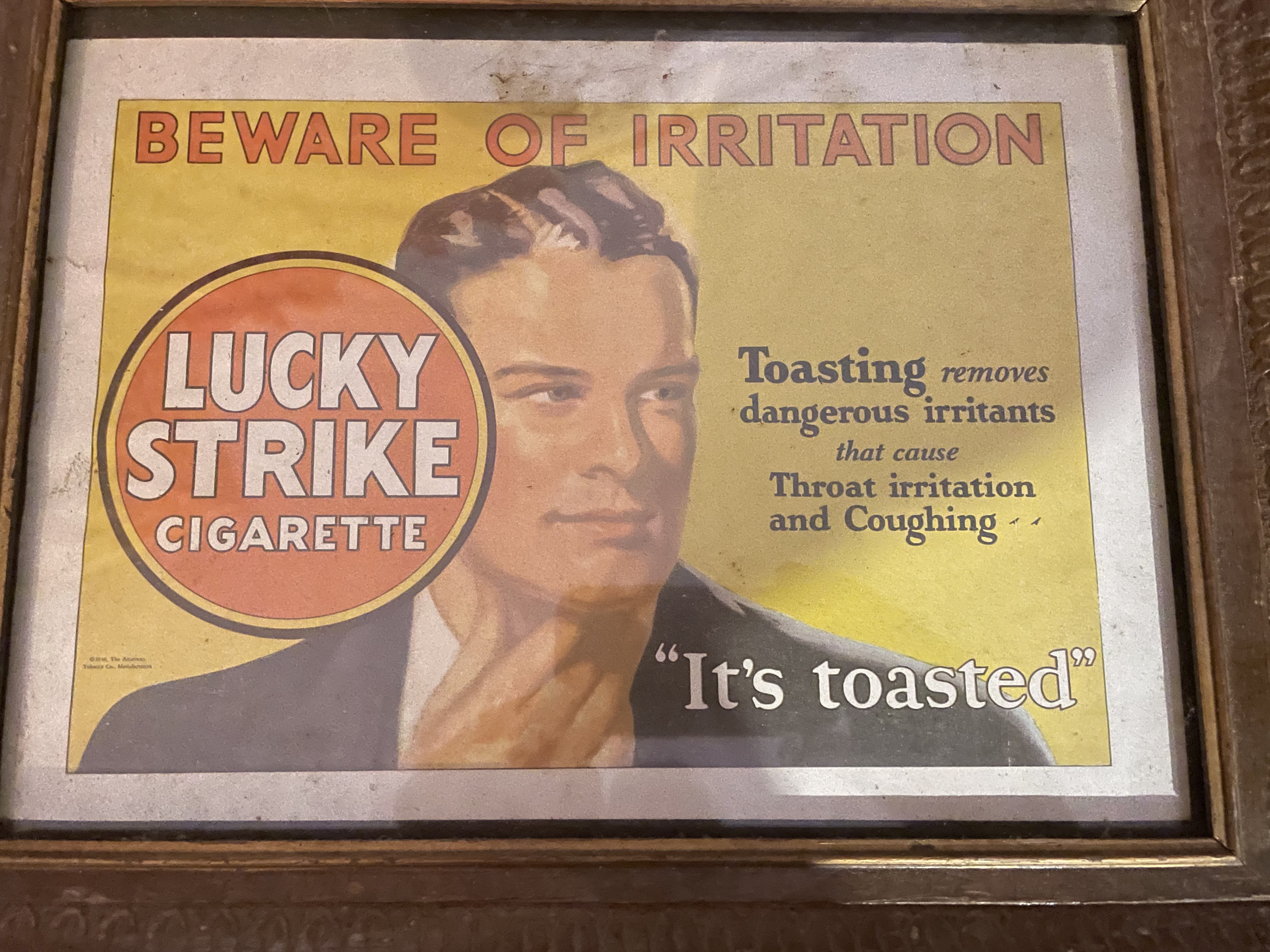 A framed vintage commercial advertisement print for Lucky Strike Cigarettes. The print is executed in color on paper or board and is housed within a dark wood molded frame. Research suggests this advertisement dates to approximately 1931, a period when the brand heavily promoted the “It’s toasted” campaign. The design features a central male figure looking toward the viewer. Dominant text includes the brand name “LUCKY STRIKE CIGARETTE” set within a red circular motif. Key advertising copy includes the warning “BEWARE OF IRRITATION” across the top and the famous slogan “It’s toasted” below. Additional text claims, “Toasting removes dangerous irritants that cause Throat irritation and Coughing.” The print is typical of commercial advertising from the early 1930s. Measures approx. 11″x14″.