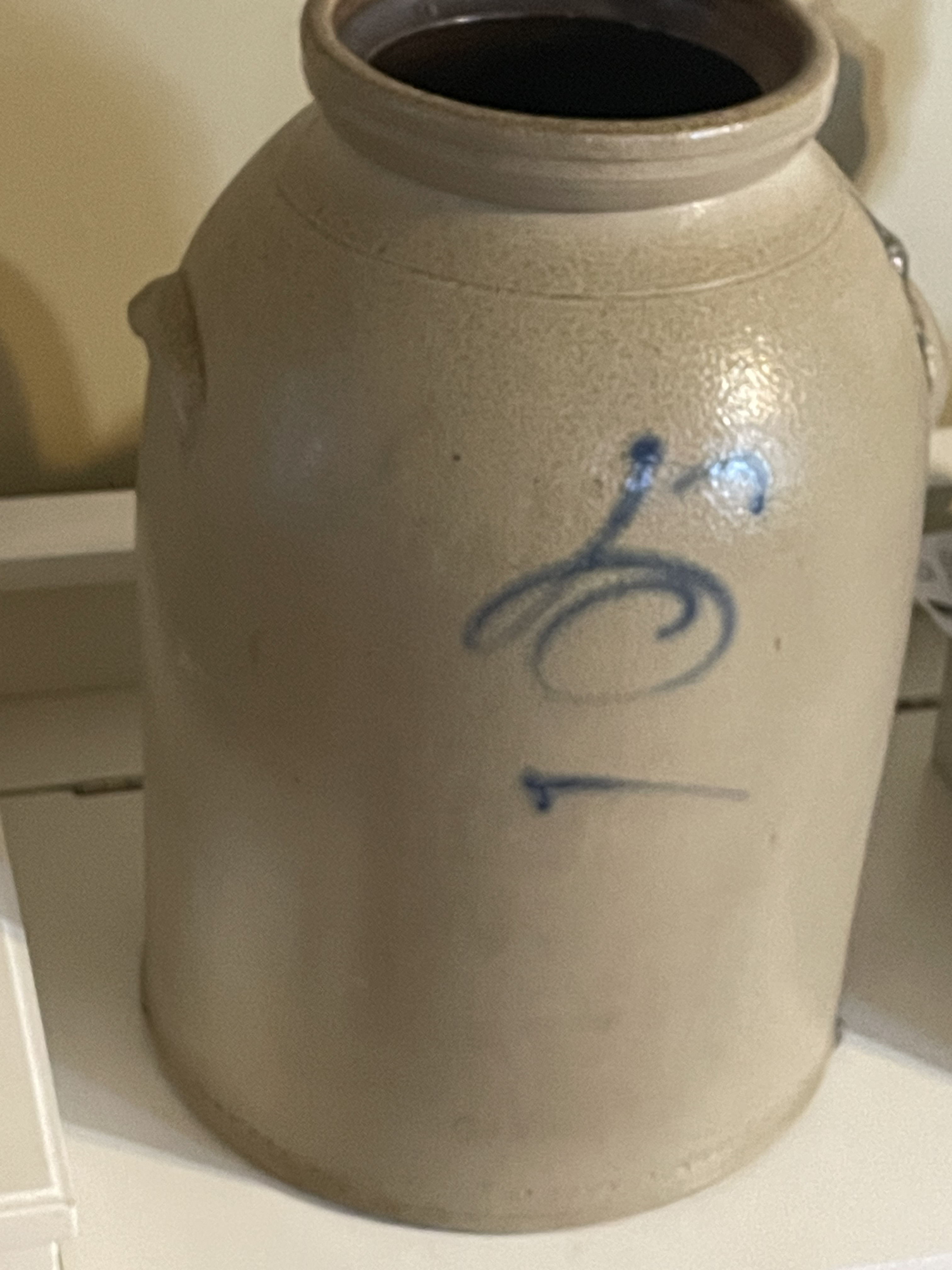 A single antique utilitarian stoneware jug, commonly associated with the beehive or whiskey jug style, featuring a roughly cylindrical body, rounded shoulder, and flared rim. The exterior displays a characteristic light tan/gray speckled salt glaze. The interior is finished with a dark brown glaze, consistent with Albany slip. The front of the vessel is decorated with a hand-painted cobalt blue capacity numeral ‘5’ beneath a decorative scrollwork or flourish, indicating a five-gallon capacity. The jug is fitted with two small applied lug handles located high on the body.