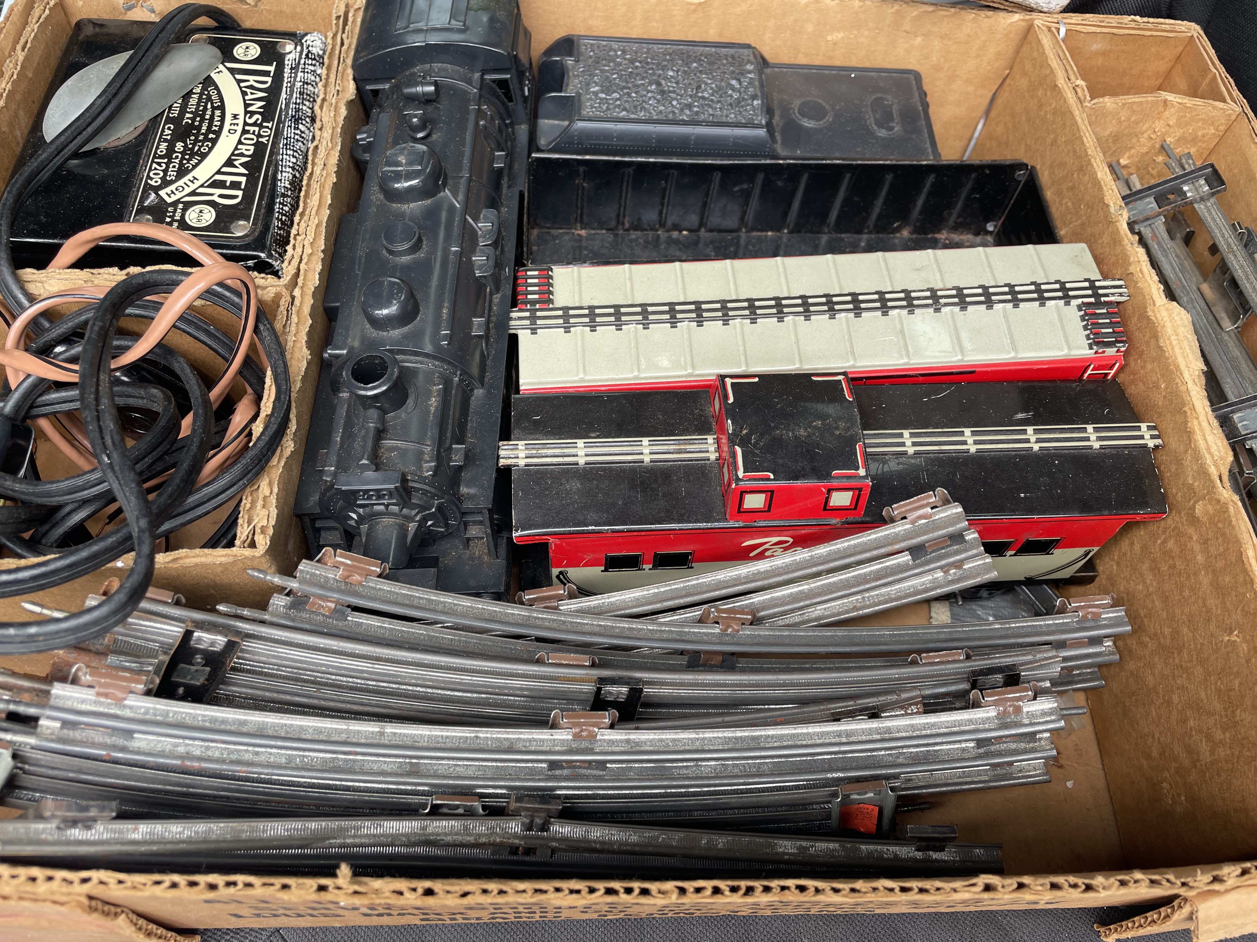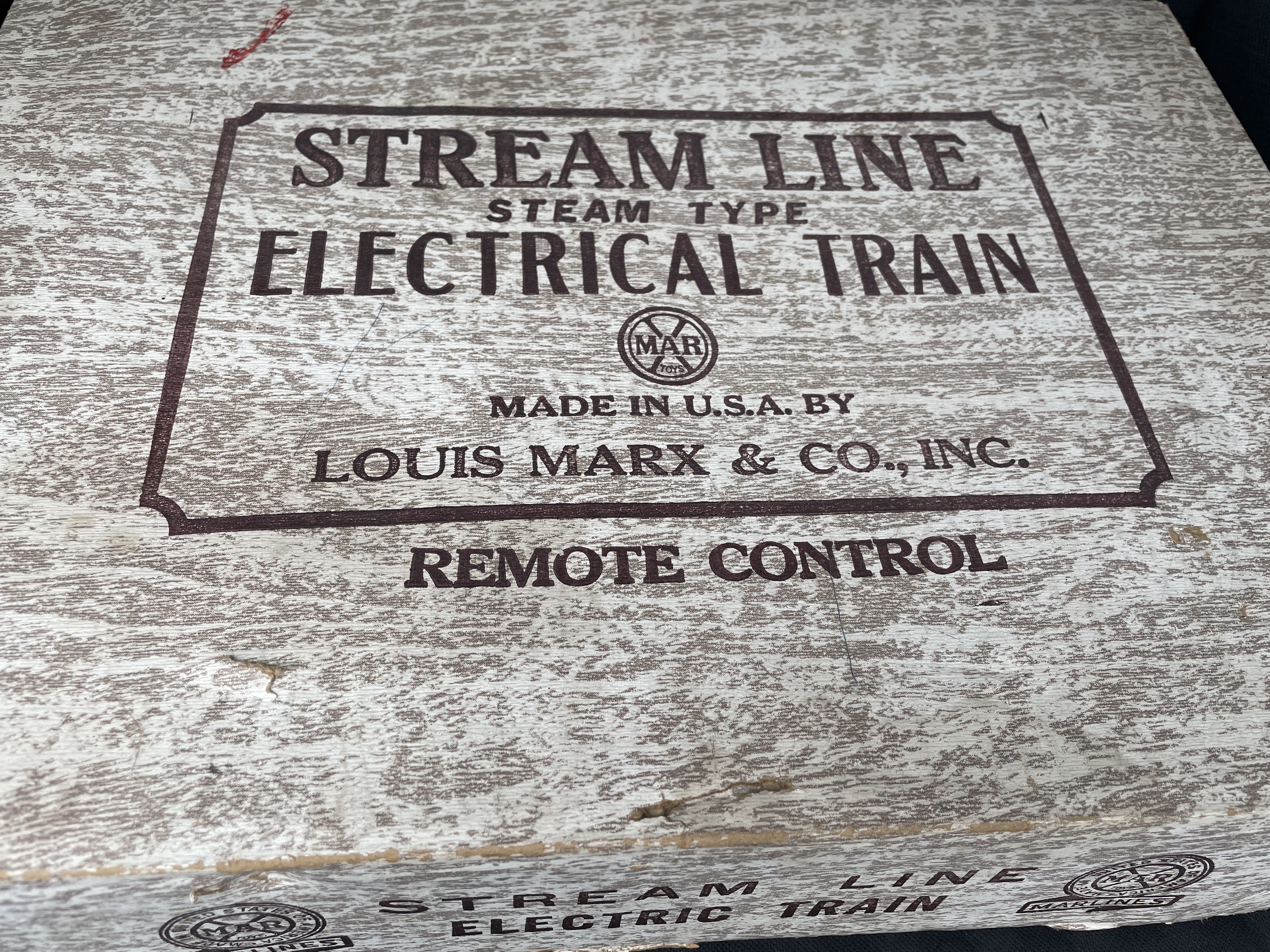 A vintage electric model train set manufactured by Louis Marx & Co., Inc., identified through web consensus as the Stream Line Steam Type Electric Train Set. The collection comprises 25 components housed within its original printed cardboard box. The box lid is marked “STREAM LINE,” “STEAM TYPE ELECTRICAL TRAIN,” “REMOTE CONTROL,” and includes the Louis Marx & Co. “MAR” logo, confirming the maker. The contents include one black plastic steam-type locomotive, four pieces of rolling stock (one black tender car, one black gondola/flat car, one gray/white roof passenger car, and one red/black passenger car), one black cased transformer labeled “TRANSFORMER,” one bundle of coiled wires, and eighteen curved metal track sections. The components are constructed primarily of plastic and painted metal.