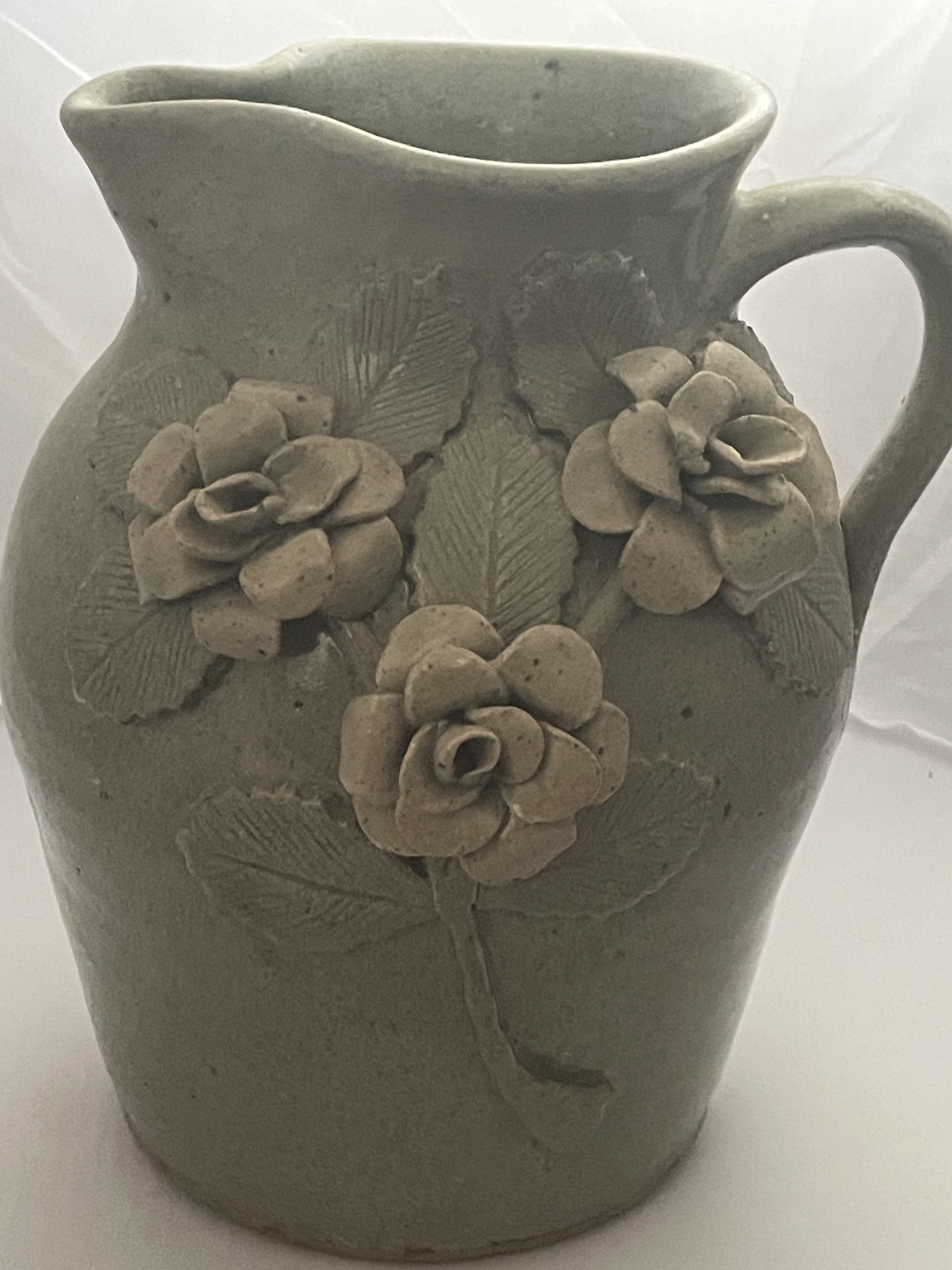 A single ceramic pitcher attributed to Michael Crocker (pitcher) and Pauline Crocker (flowers) crafted from stoneware and covered in a matte, pale olive green or sage glaze exhibiting a slightly speckled texture. The vessel features a wide mouth with a prominent pour spout and a sturdy, applied handle. The body is heavily decorated in high relief with a botanical motif featuring three large, three-dimensional rose flowers accompanied by impressed leaves and stems. This decorative style is consistent with the work of contemporary Georgia potters, including Michael Crocker and Pauline Crocker, who specialize in stoneware forms.Measures approximately 9″ tall.