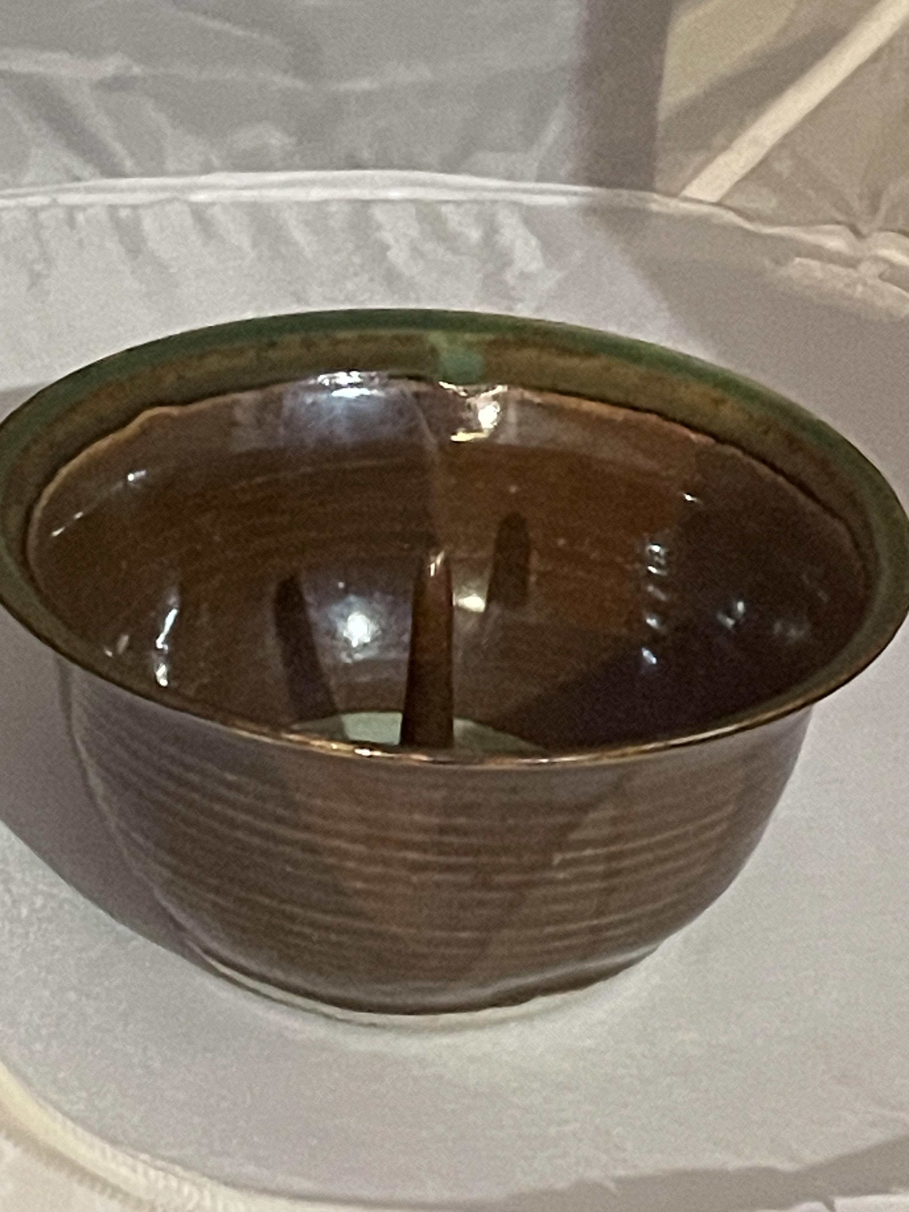A single glazed stoneware specialty bowl, likely intended for use as an apple baker or fruit spiker, characterized by a conical protrusion located centrally within the interior basin. The vessel is constructed of pottery, likely stoneware, featuring decorative horizontal ribbing around the exterior walls. The main body and interior basin are covered in a high-gloss, deep reddish-brown glaze. The wide rim is accented with a contrasting dark emerald green glaze, which bleeds slightly into the interior brown field. The circular area immediately surrounding the central spike is finished with a pale greenish-blue/white glaze. No discernible maker’s marks, text, or signatures are visible.Measures approximately 6″ across.