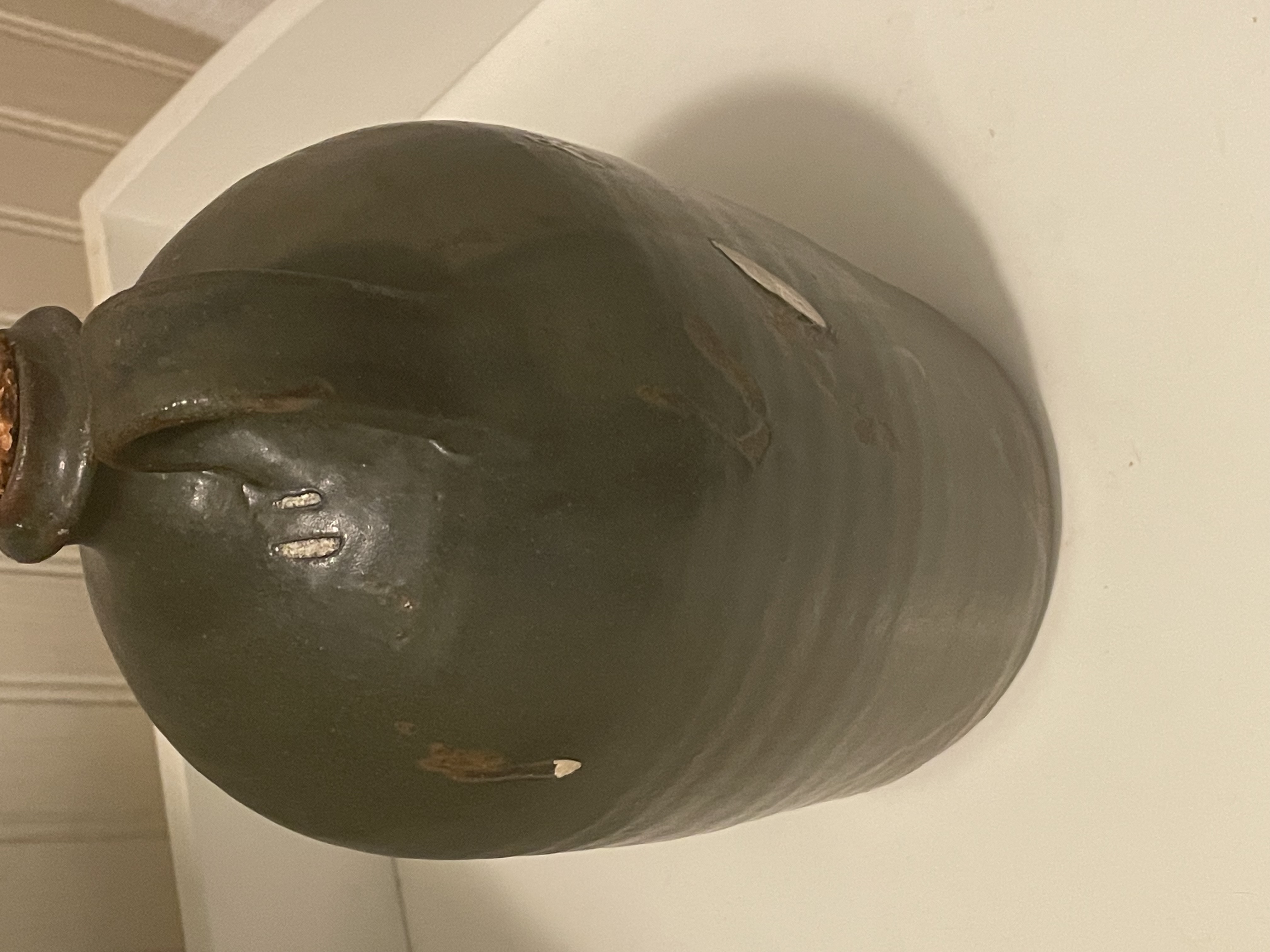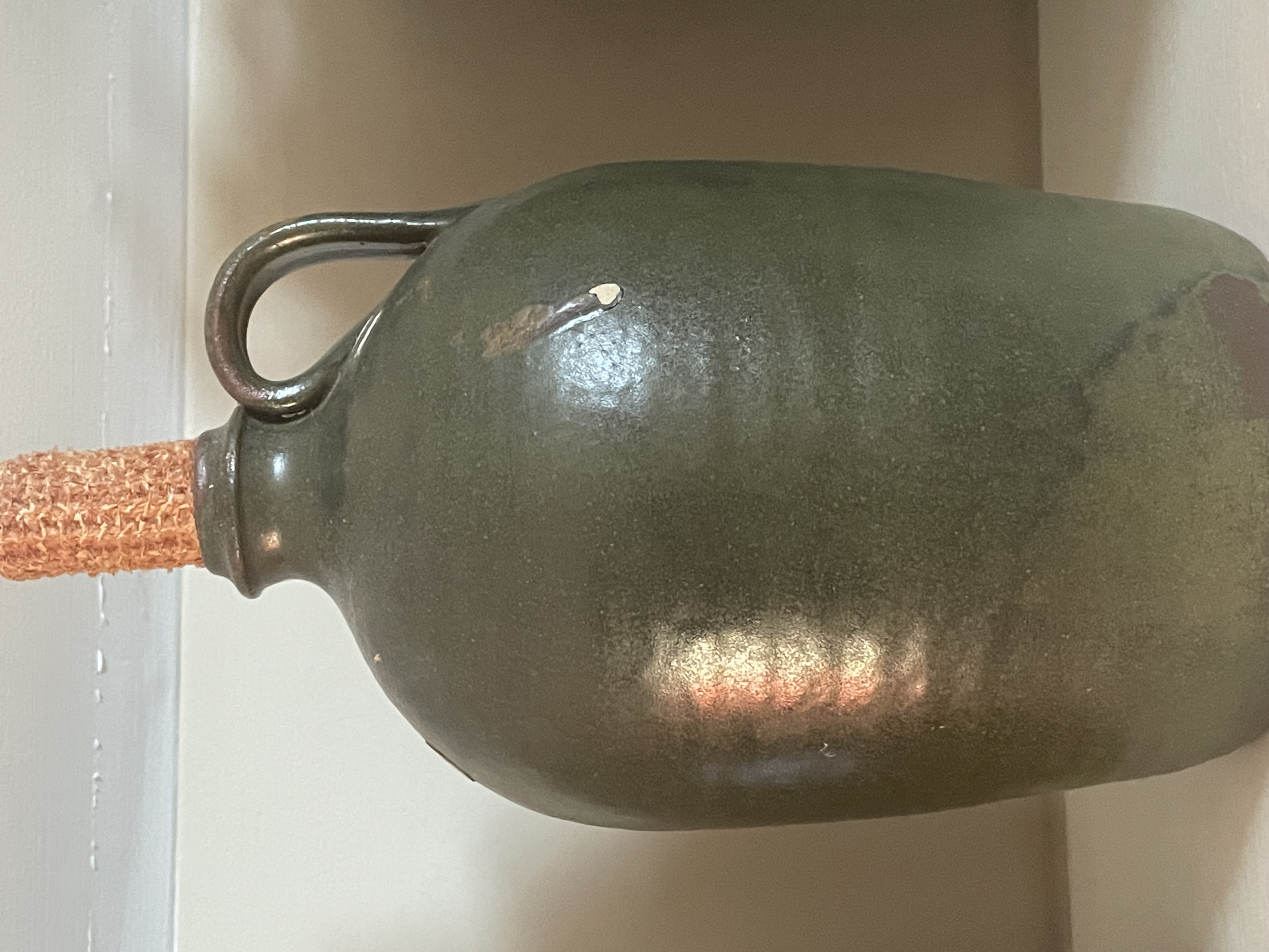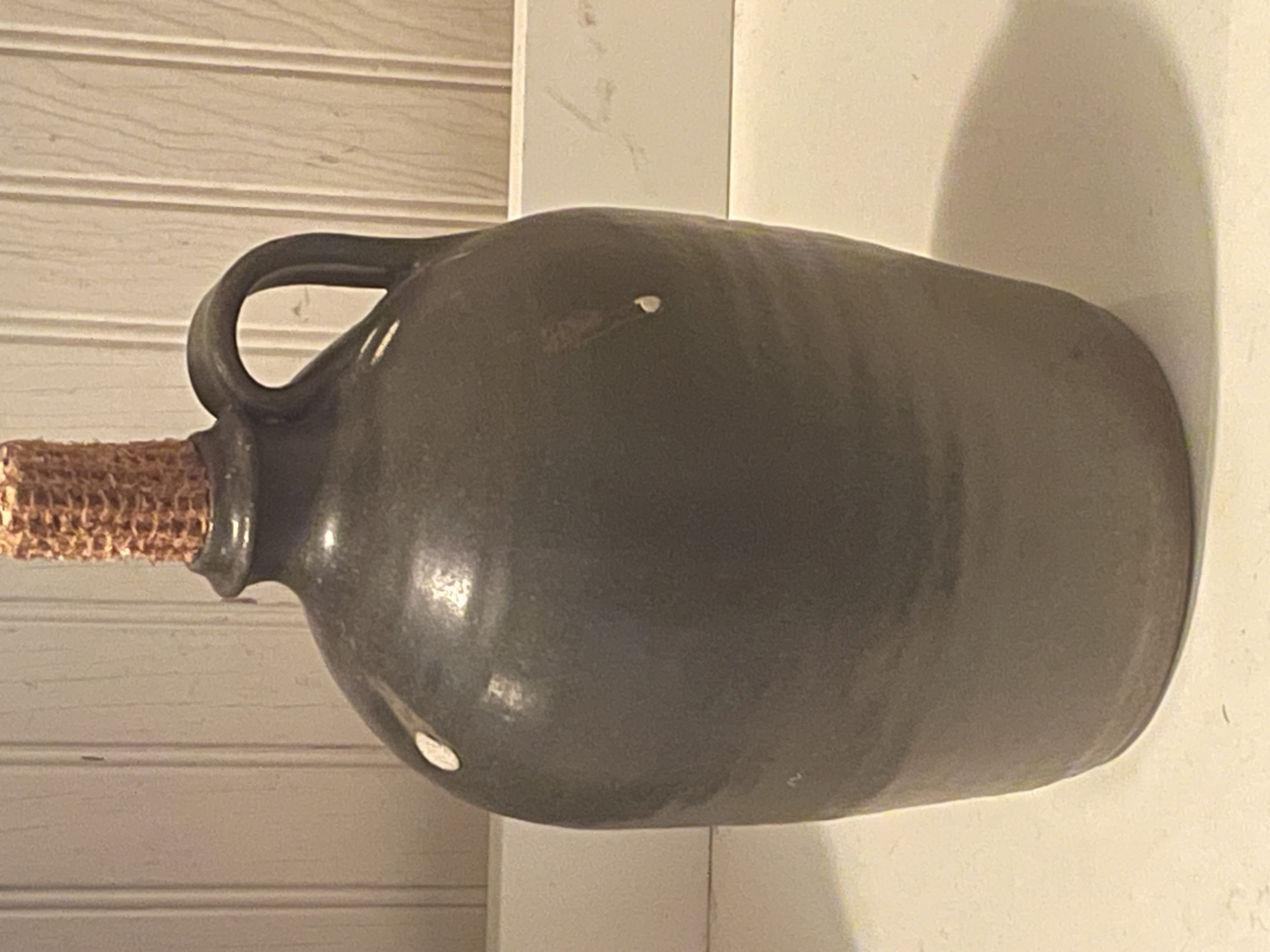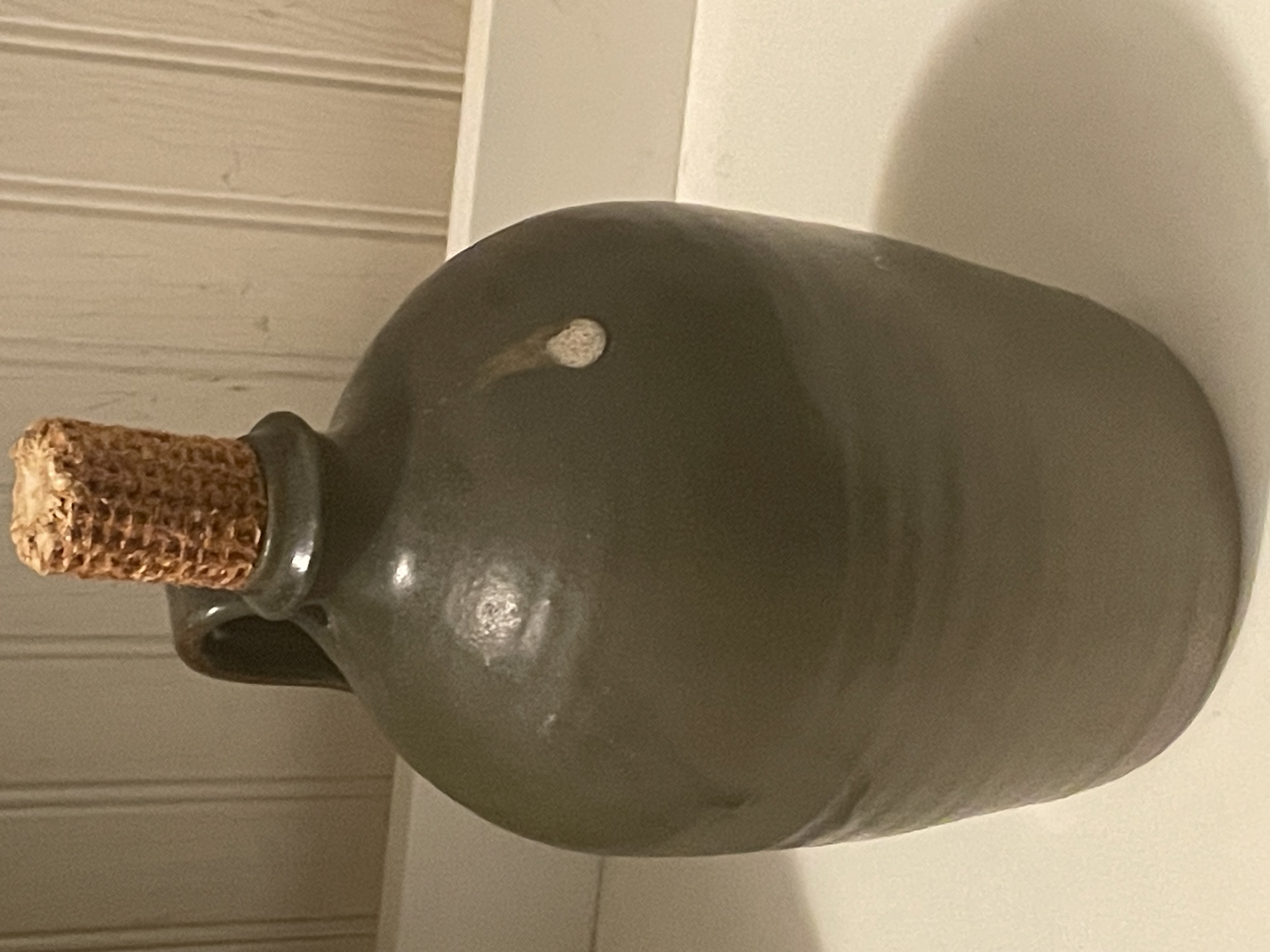 A piece of contemporary American folk pottery, specifically a stoneware storage jug, attributed to Sid Luck. The jug features a rounded body, a narrow spout, and a single strap handle. It is constructed from a reddish-brown clay body and finished in a dark olive-green alkaline glaze, which exhibits characteristic runs and pooling. The underside of the base is incised with the signature and date Sid Luck 1996. The opening is currently fitted with a corn cob stopper. Measures approximately 8.5″ tall.