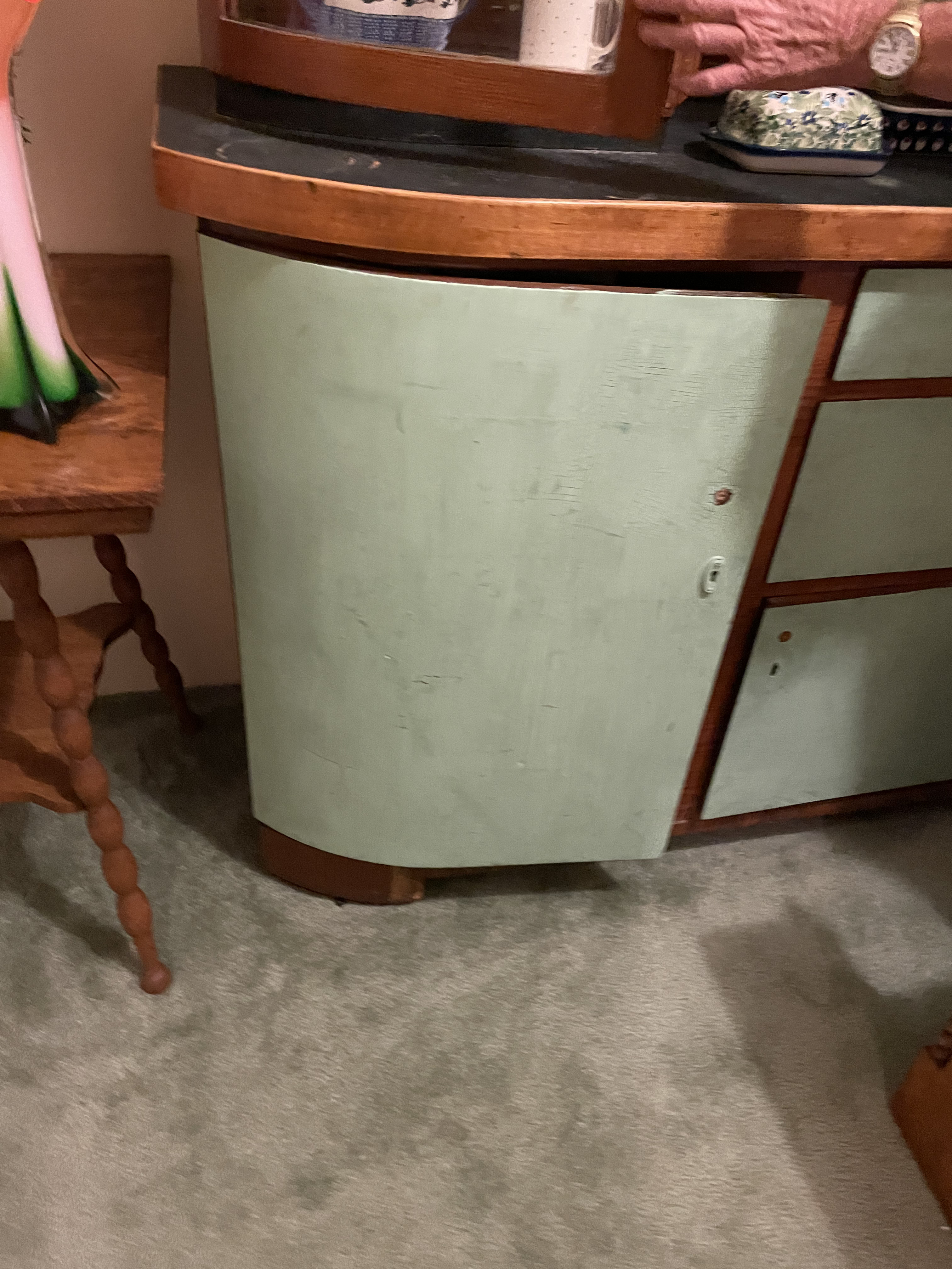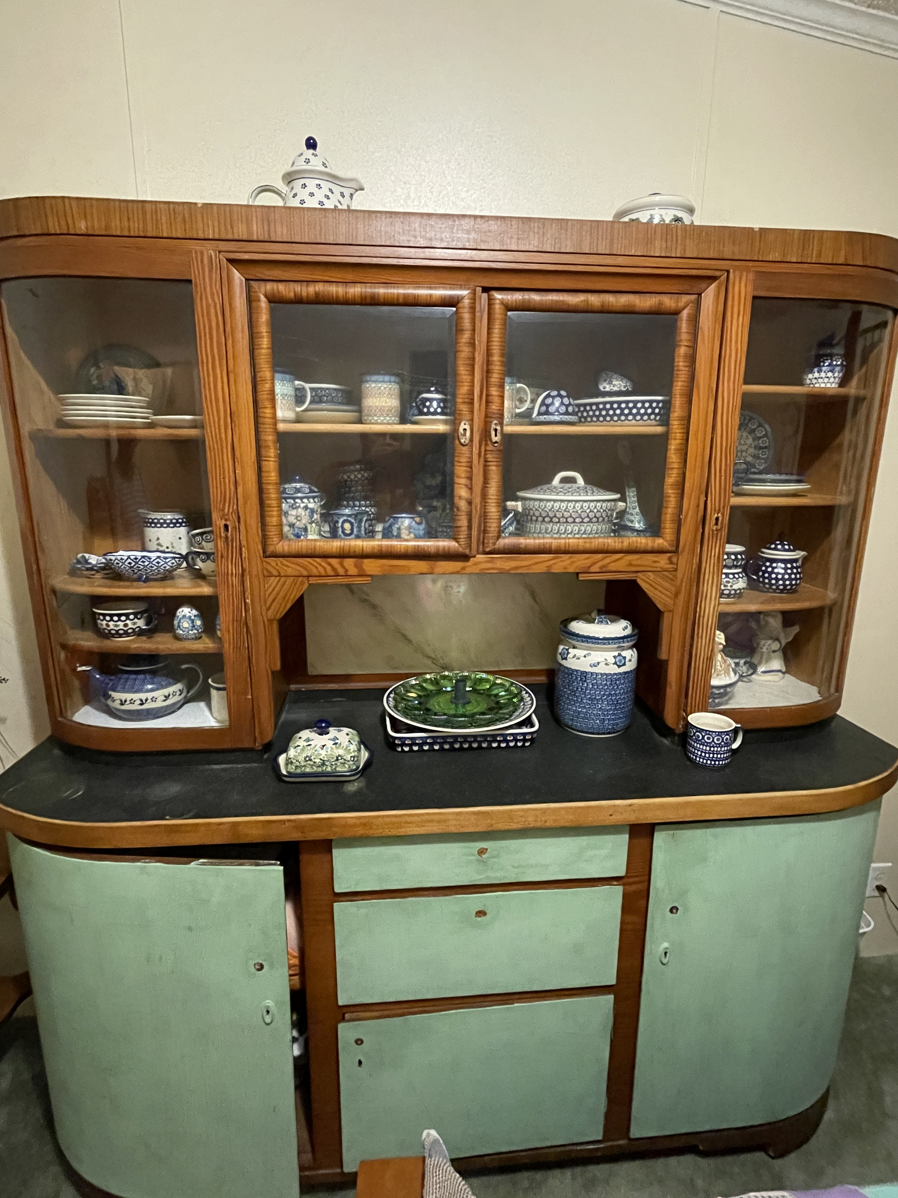 The primary lot consists of a large, two-part German Shrunk cabinet, dating to the Art Deco or Streamline Moderne period. The cabinet is constructed of wood and features a distinct two-tone finish. The upper hutch section is finished in a medium-brown wood tone, displaying visible graining, and features a central display compartment with curved glass side panels and two central glass doors. The base cabinet features a dark, contrasting countertop over a combination of storage elements, including three central drawers and flanking curved cupboard doors. The lower section is finished in a light mint green paint. The overall form of the shrunk cabinet emphasizes curved lines and geometric simplicity typical of the period. Contents of cabinet are not included. Cabinet only. Buyer is responsible for removal and loading from Homer, GA, within 10 days of close of auction, or other arrangement approved by seller.