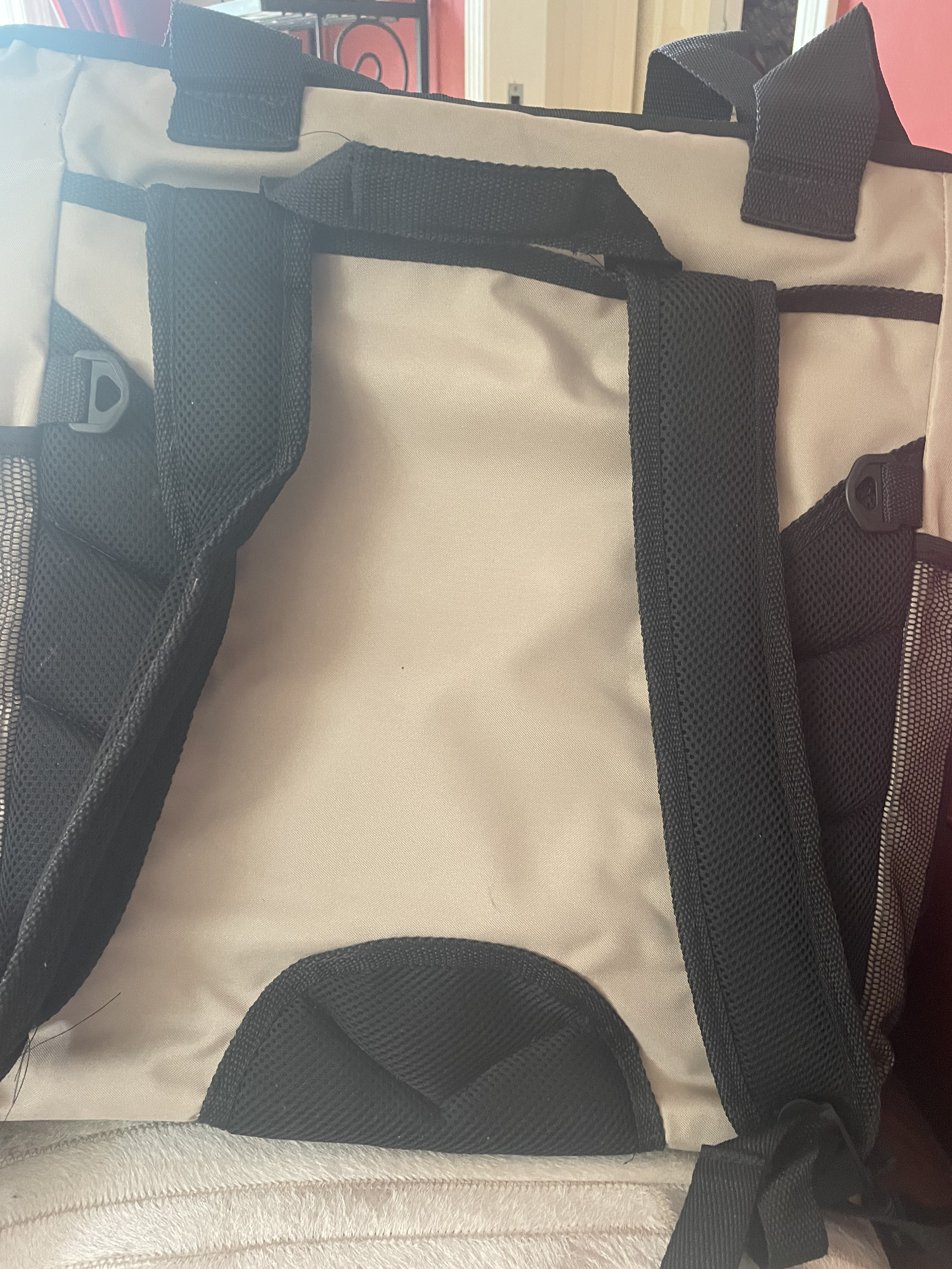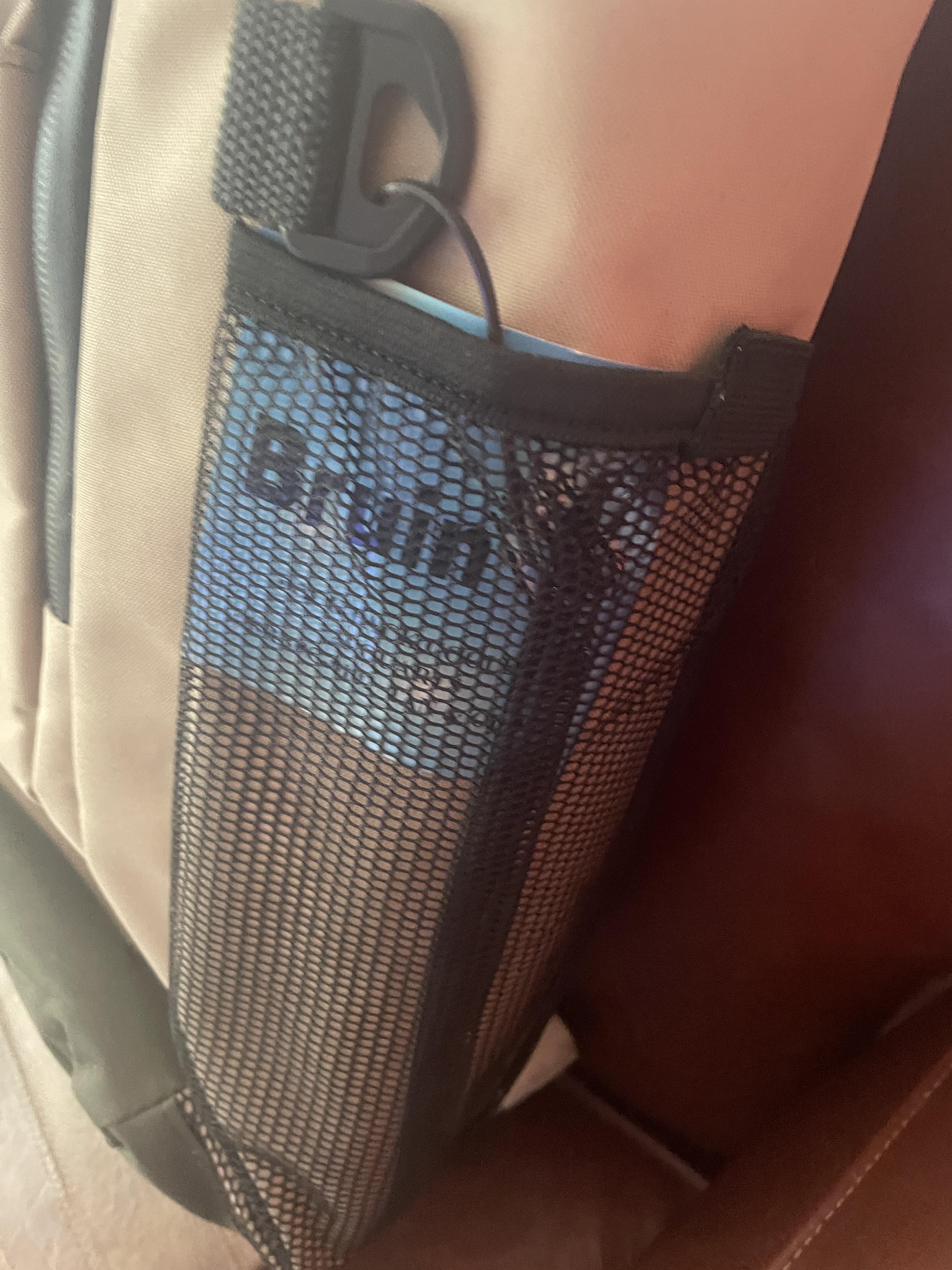 A single modern utility bag identified as a Bruin backpack cooler. Constructed primarily of tan/beige synthetic textile with black nylon webbing straps, mesh pockets, and trim. The bag features top carrying handles, zippered closures for the main compartment and front pocket, and padded, adjustable shoulder straps on the reverse. The front compartment is decorated with a graphic of five stylized red and black claw slashes centered above the text “Bruin” in black capital lettering. The base and structural accents utilize a dark olive green/khaki material. The branding “Bruin” is also faintly visible on an item placed within the mesh side pocket.