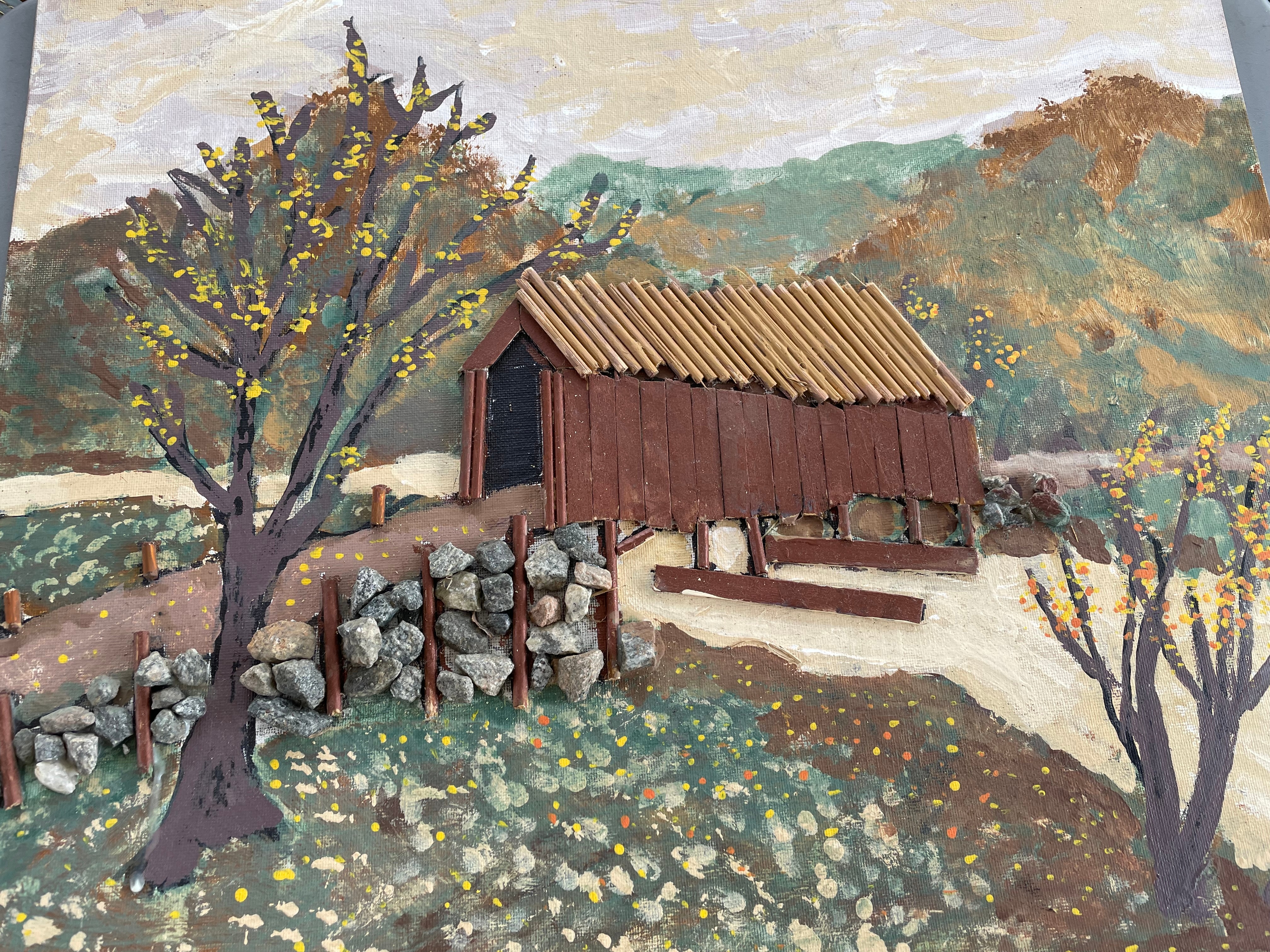 A single mixed media relief artwork executed on a canvas substrate, depicting a rustic autumn landscape. The scene features a brown covered structure, possibly a bridge or barn, set among trees and a stone wall. The piece is executed in a contemporary folk or outsider art style, combining painted elements (likely acrylic or oil) with three-dimensional collage materials. The stone wall is constructed using adhered grey stones or pebbles, providing significant texture. The structure and fencing utilize small cylindrical and flat wooden pieces adhered to the canvas, creating a relief effect for the façade and roof. The palette is dominated by browns, deep greens, and ochres with yellow and orange accents suggesting fall foliage. There are no visible markings or signatures present. Measures 16″x20″.