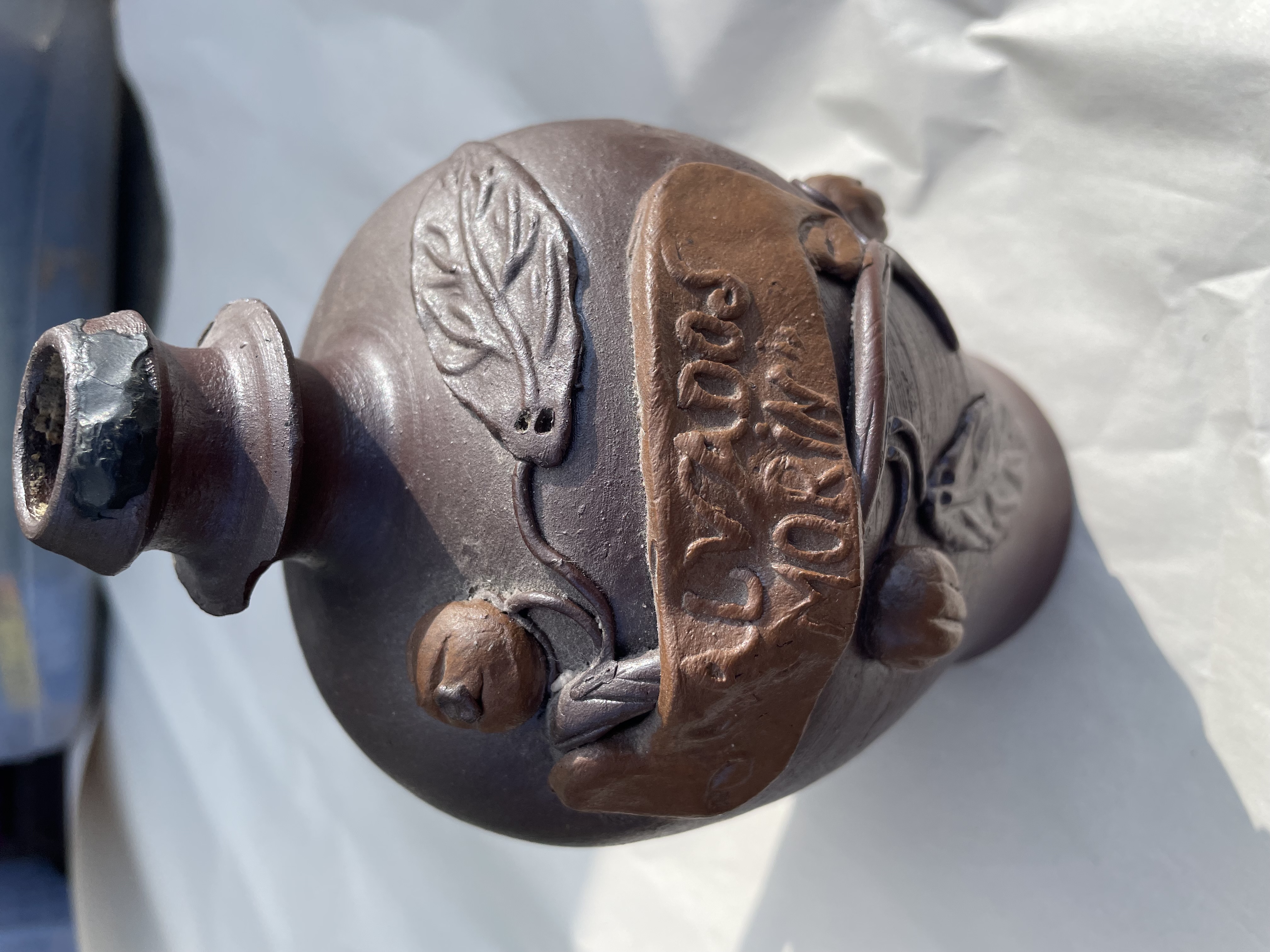 A single miniature globular ceramic bottle, likely a novelty spirit decanter associated with the Calvados Morin apple brandy producer. The body is constructed from matte, dark brown stoneware or terracotta. The surface features extensive bas-relief decoration depicting foliage and fruit, suggesting an apple motif, wrapped around the circumference. A central molded banner across the body displays the impressed capitalized text ALVADOS MORIN. The bottle has a short, flared neck which retains a partial application of a glossy black glaze. The base of the bottle is reported to bear a 70 marking. Measures approximately 7″ tall.