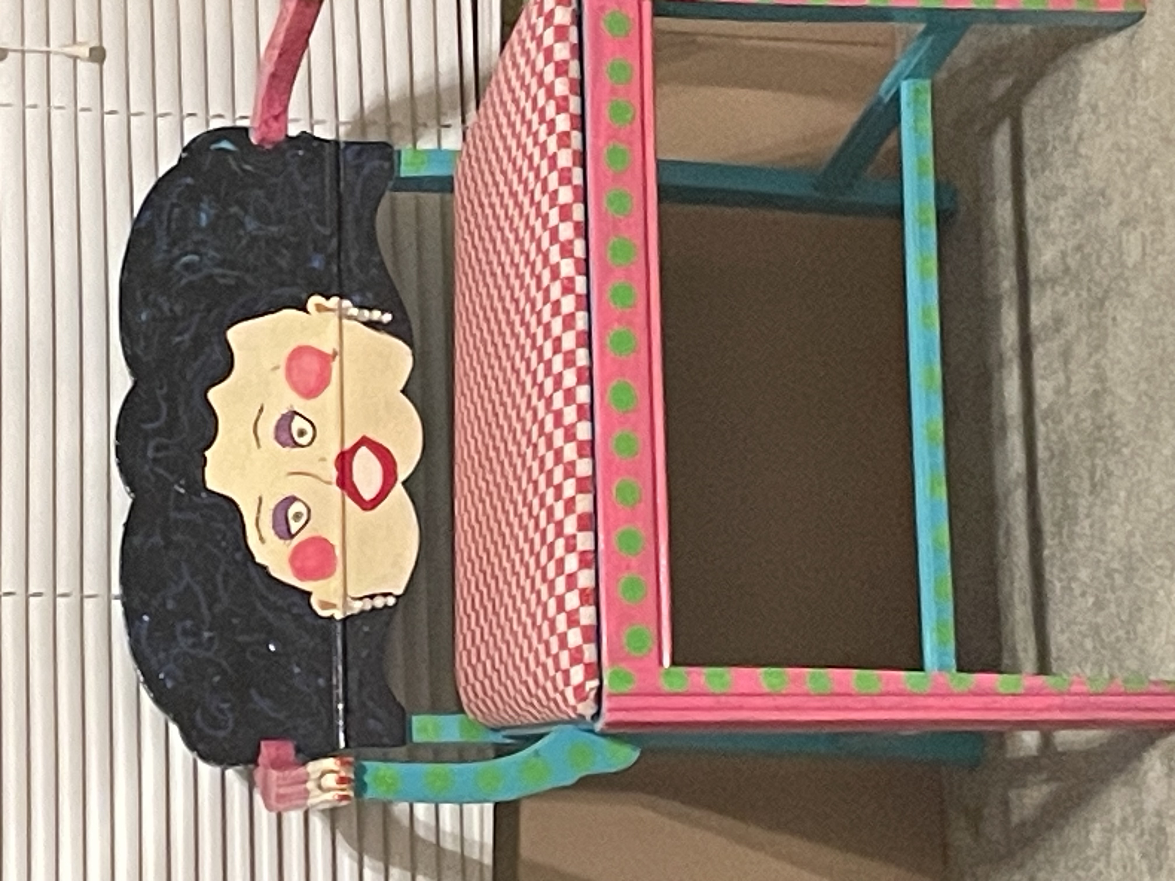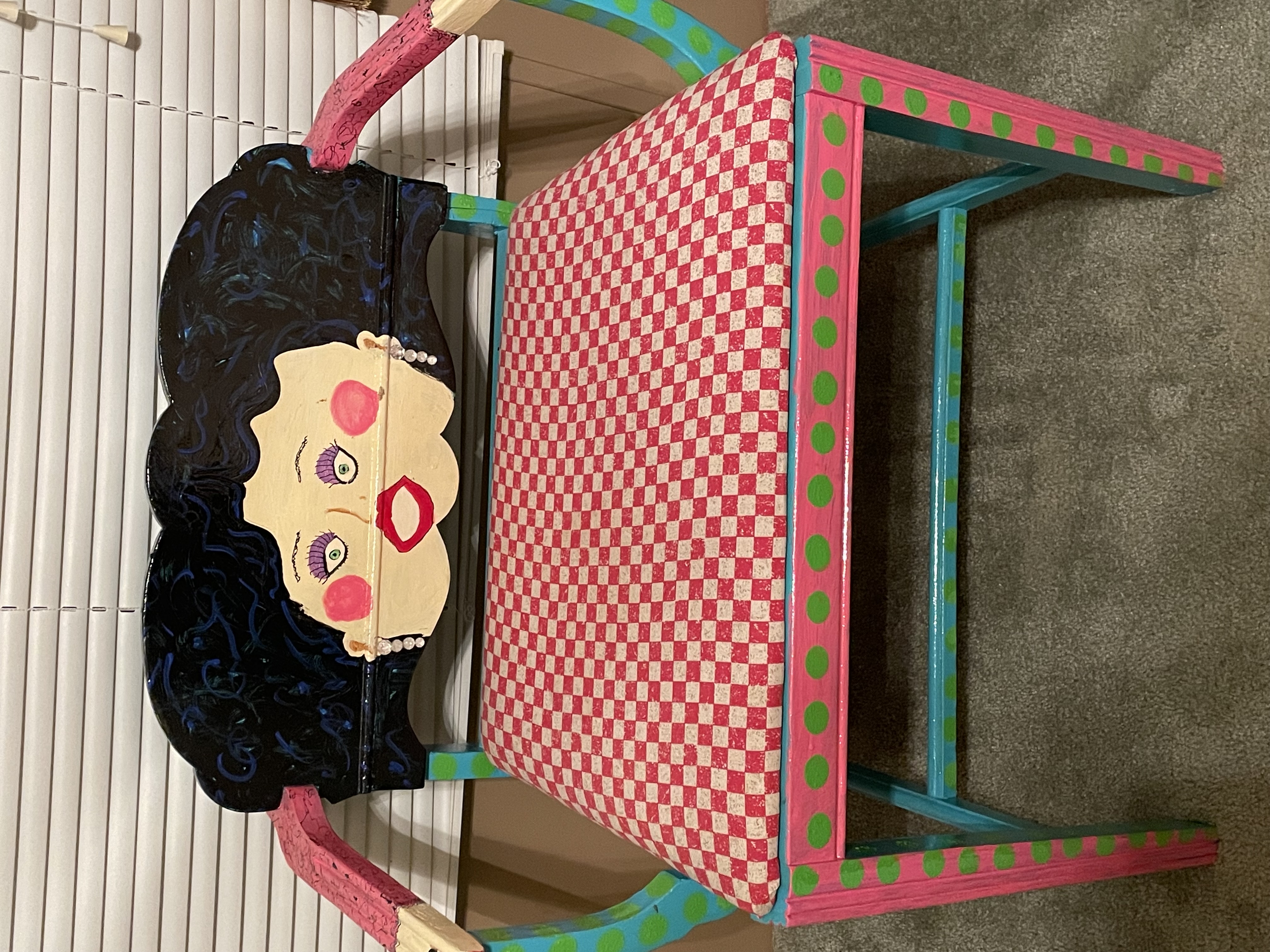 A single wooden armchair attributed to the Georgia Folk Artist Scott Peppers. The chair features a highly colorful, whimsical, and hand-painted aesthetic consistent with the Scott Peppers Folk Art style. The wooden frame is painted primarily in contrasting bright pink and teal/turquoise hues. The seat rail and legs are further detailed with lime green polka dots and striping. The backrest has a scalloped edge and is decorated with a stylized portrait of a woman’s face, featuring black hair, pale pink skin tones, dramatic eye makeup, bright pink cheeks, red lips, and painted white teardrop earrings. The seat cushion is upholstered in a red and white small-scale checkered or gingham pattern fabric.