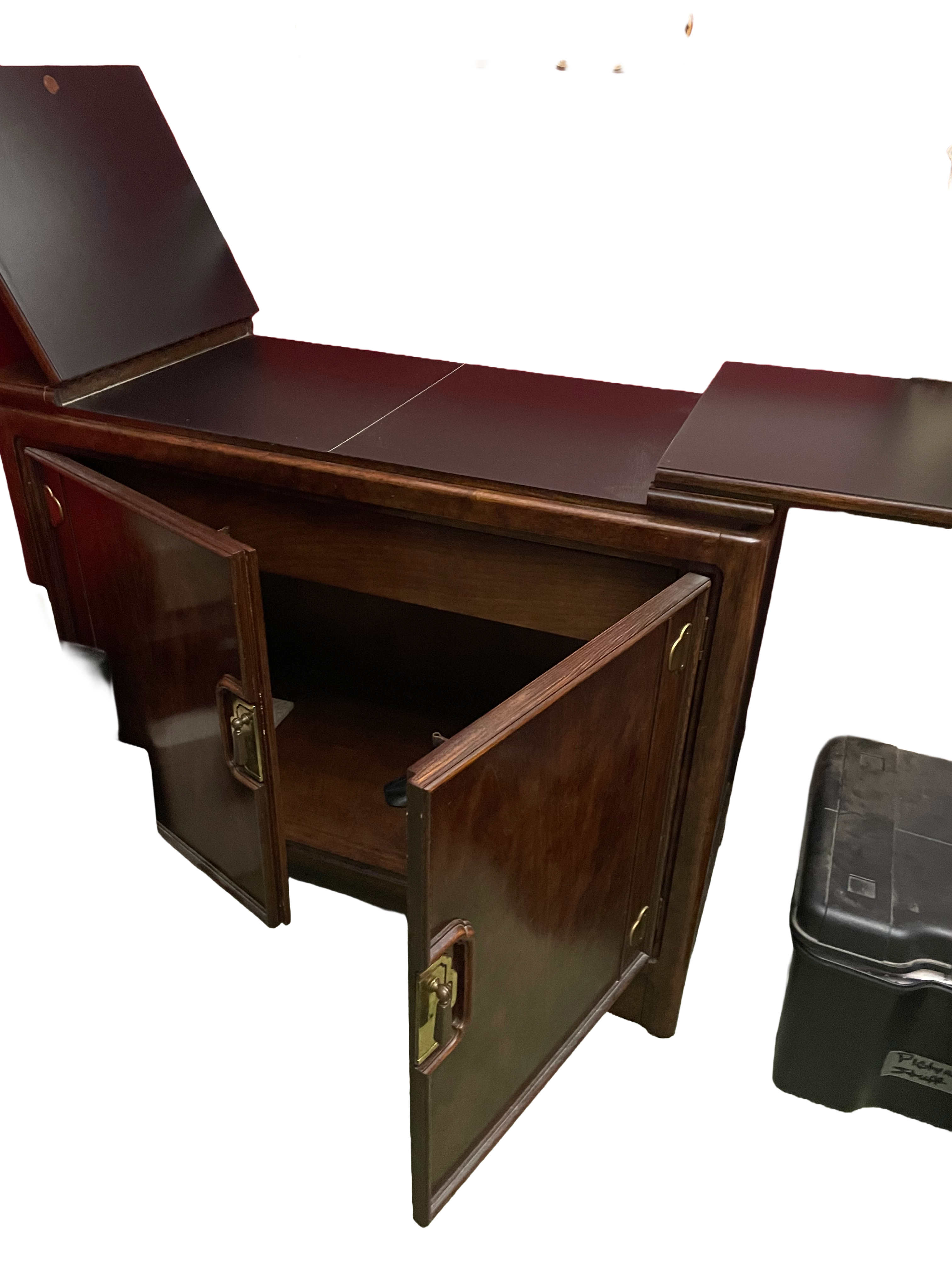 The buffet is constructed of dark wood, likely mahogany or a similarly stained hardwood, featuring a high-gloss reddish-brown finish consistent with Campaign or Asian-style furniture design popular in the mid to late 20th century. The top surface of the buffet is multi-functional, featuring a hinged flap open to the far left and an extended panel pulled out to the right, suggesting use as a server or bar cabinet. The central body features two cabinet doors secured by decorative brass-toned metal escutcheons and pulls, opening to reveal an empty storage compartment with a single internal shelf.