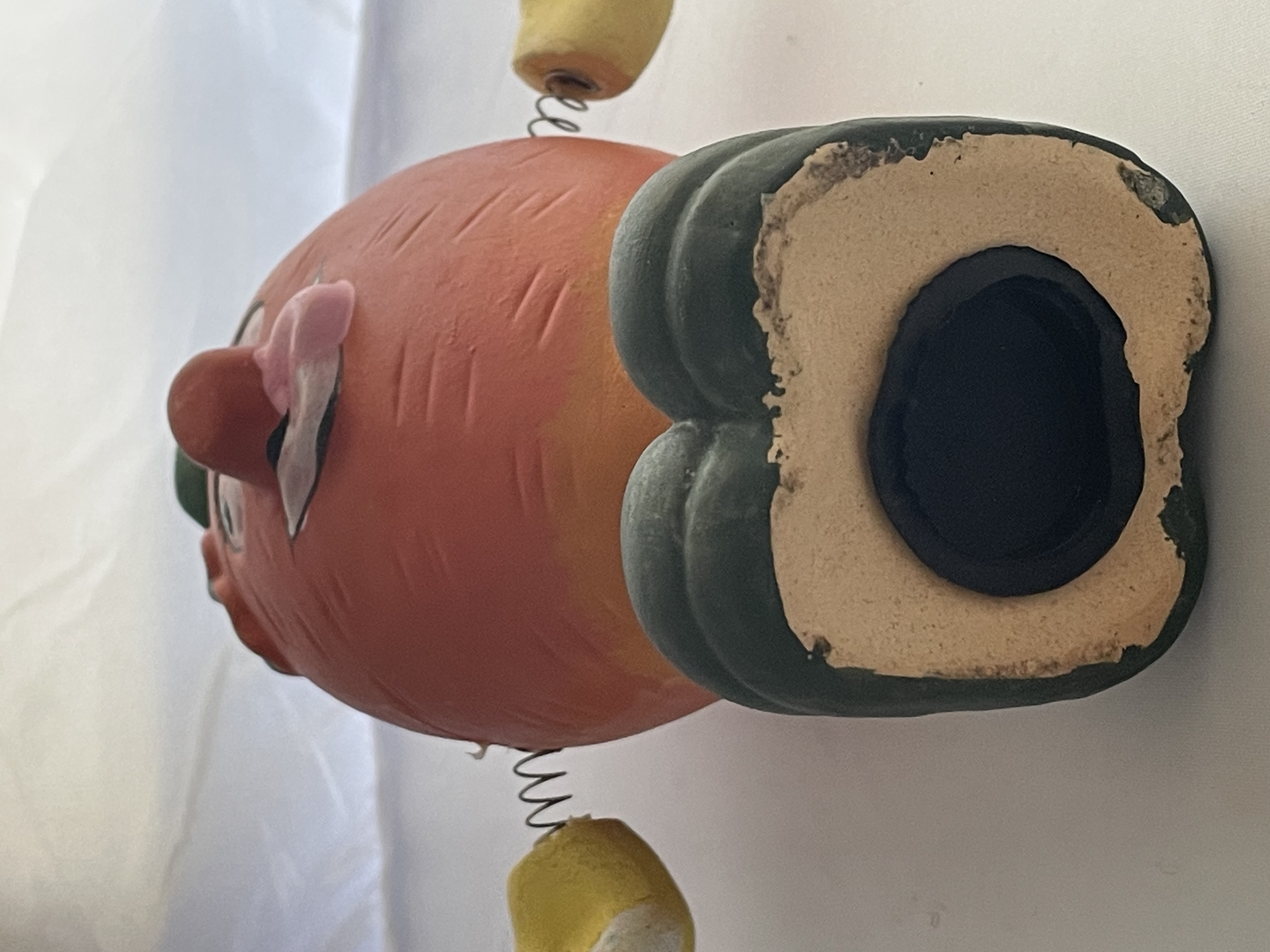 A single ceramic figural coin bank, styled as an anthropomorphic root vegetable, consistent with market descriptions of a kitschy carrot cartoon figure coin bank. The earthenware object is painted in matte colors, predominantly orange for the body, dark green for the foliage cap and base/shoes. The front features a detailed cartoon face with large eyes and a protruding tongue. Small yellow fist-shaped hands are attached to the body via thin metal springs. A rectangular coin slot is located on the back of the figure’s head. The unglazed terracotta base features a large circular opening for coin removal. No manufacturer’s markings or inscriptions are visible. Measures approximately 8.5″ tall.