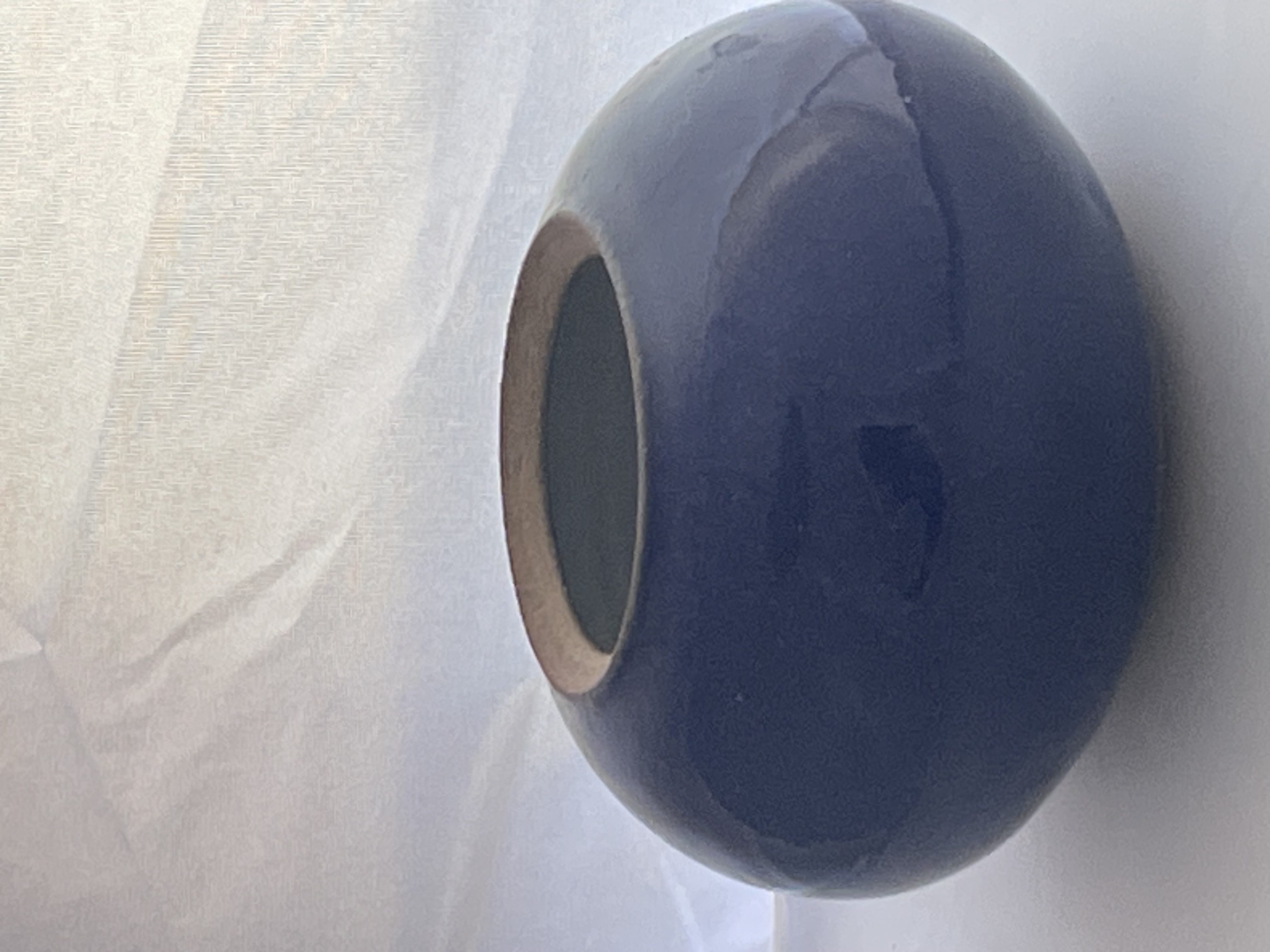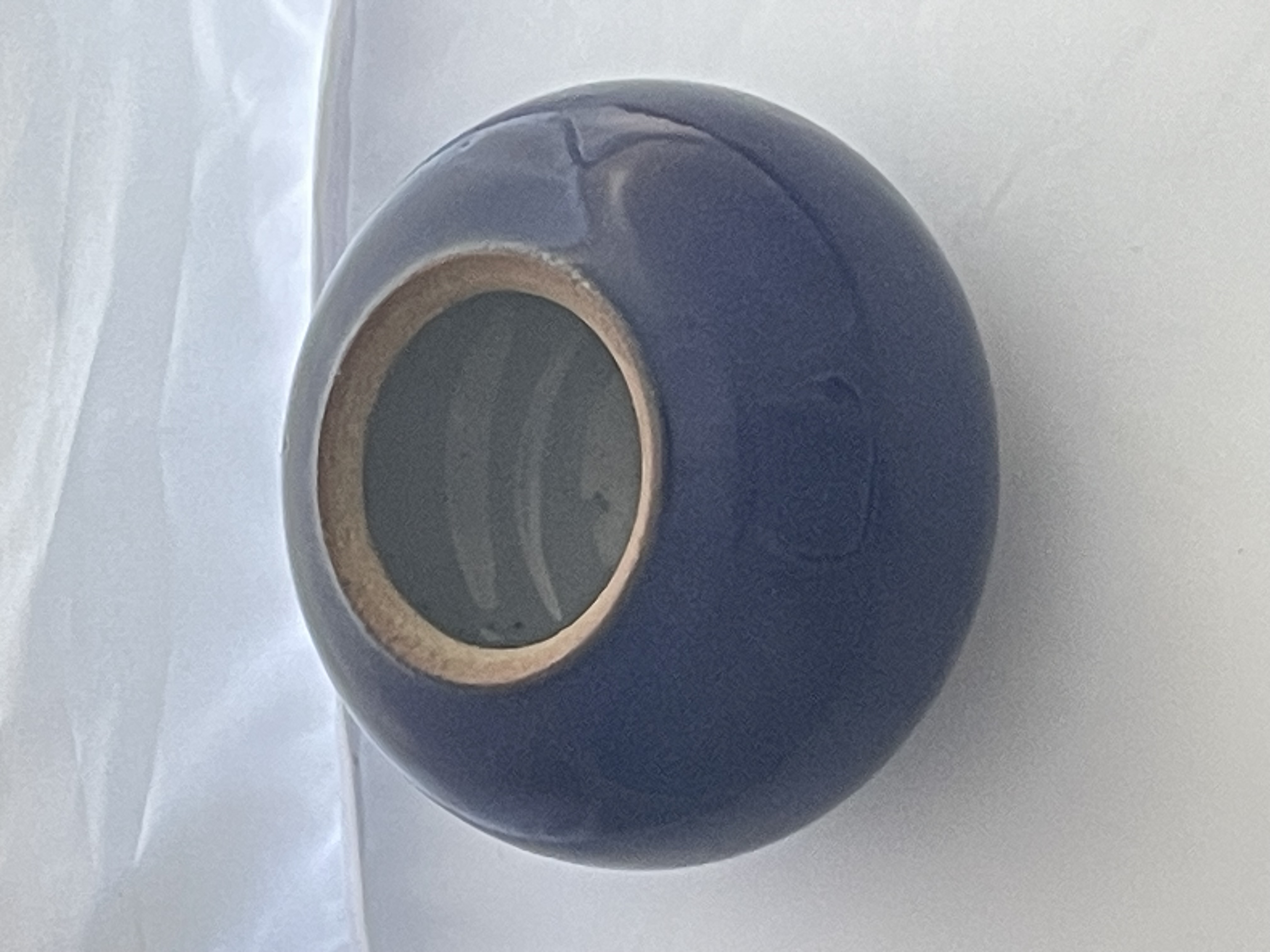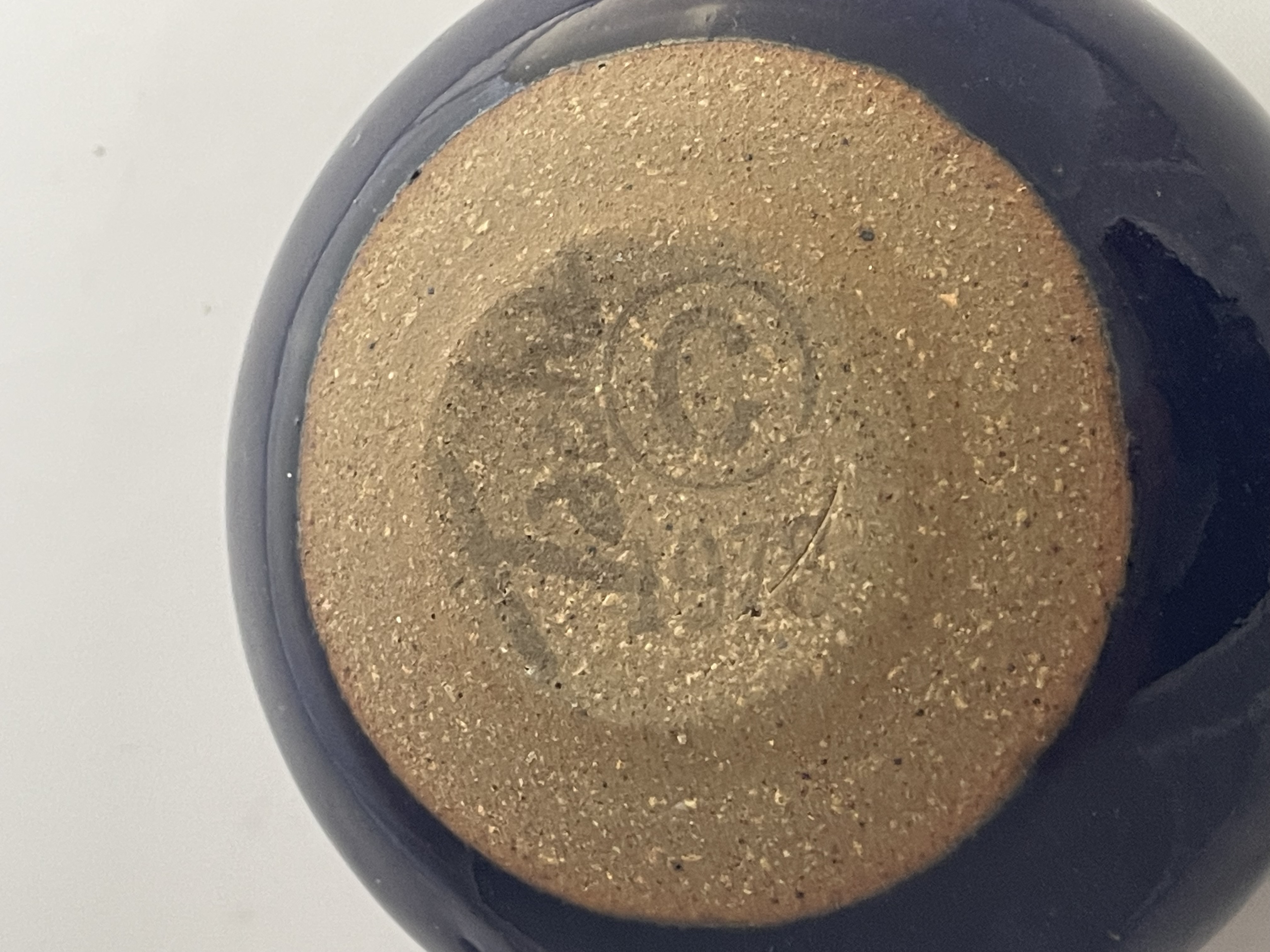 A single studio pottery vessel of globular, compressed spherical form, constructed of speckled tan stoneware. The piece features a narrow, circular aperture and is covered in a deep, glossy, monochrome dark blue glaze. The glaze stops cleanly at the unglazed rim and the recessed, unglazed base. The unglazed base reveals the speckled tan stoneware body and an indistinct, circular or spiral impressed mark, consistent with a potter’s seal or studio identification. This piece is attributed to Tachi and dated 1978, based on the impressed mark and associated information. The minimalist style is characteristic of contemporary studio ceramics. Measures approximately 3.5″ diameter.