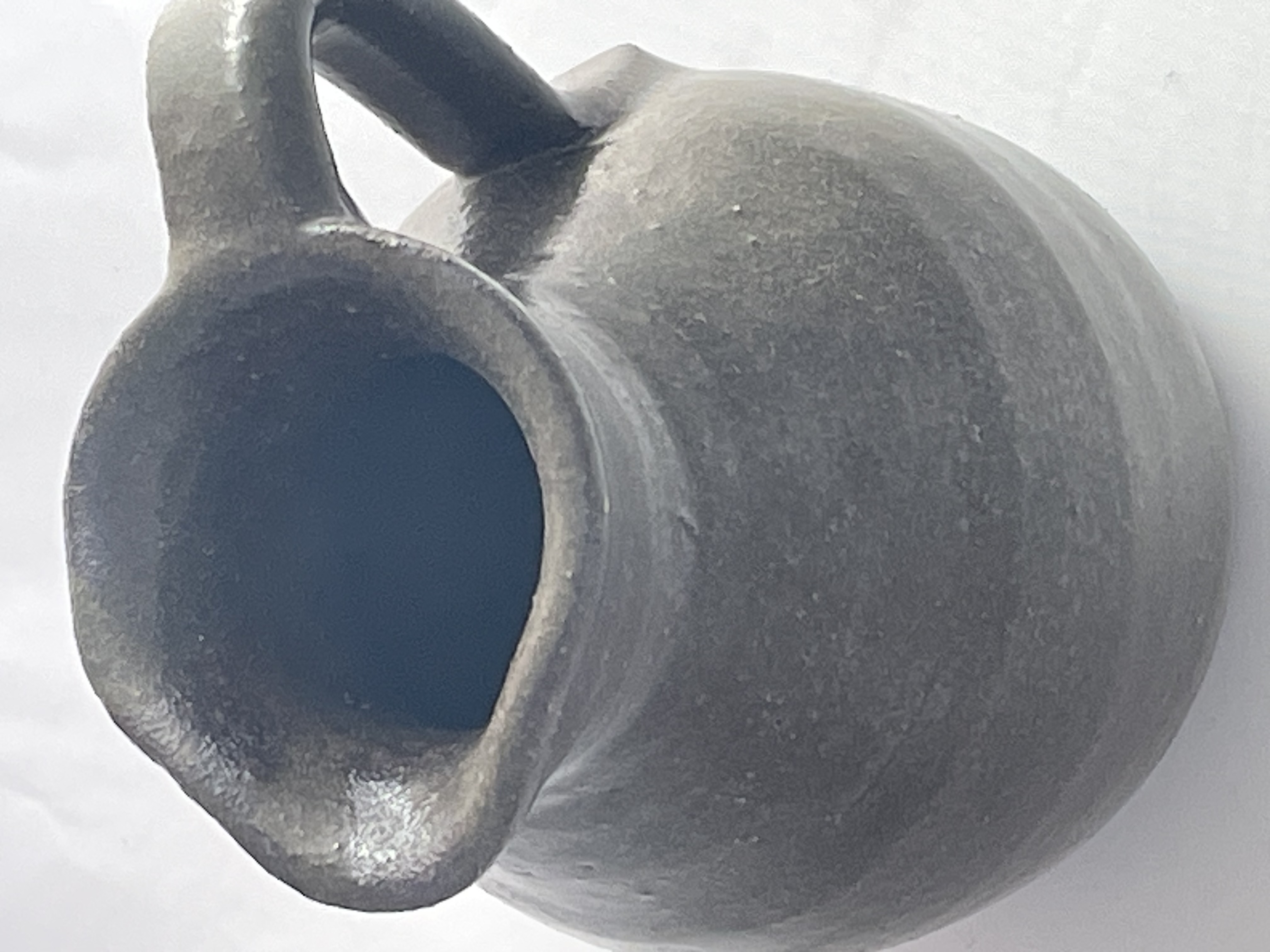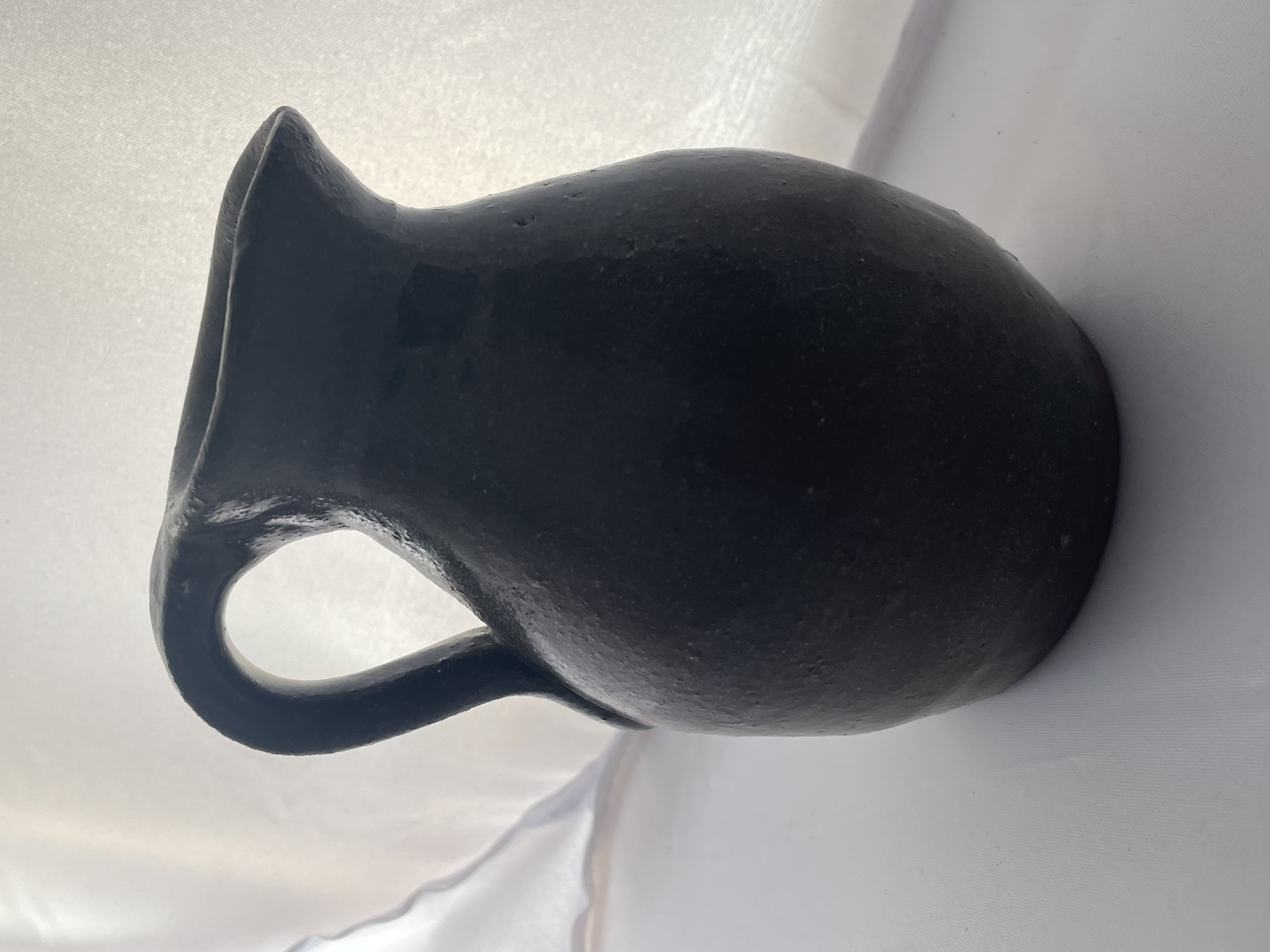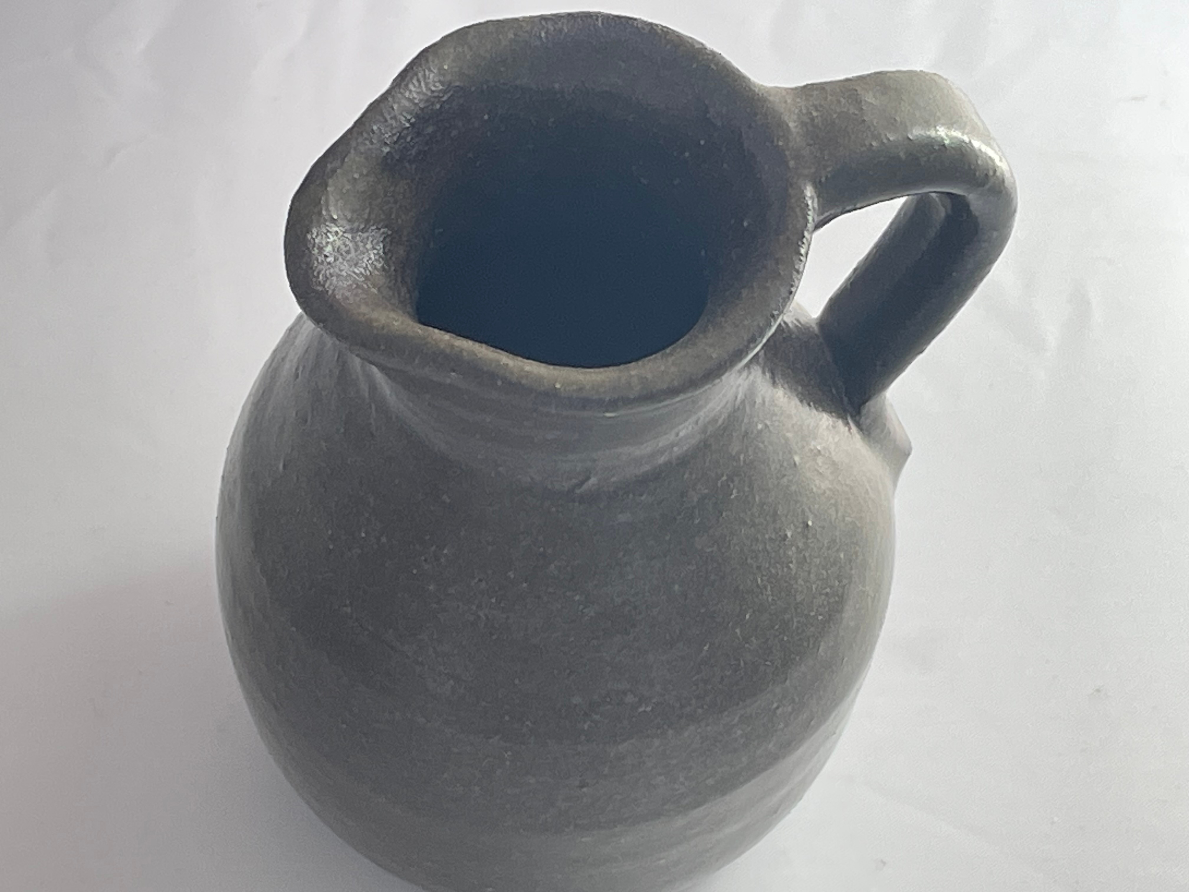 A hand-thrown folk art pottery pitcher attributed to the Georgia potter Grace Nell Hewell (1933-2016). The vessel features a globular body, a pronounced pinched pouring spout, and a sturdy applied loop handle. It is constructed from dark earthenware and finished with a speckled, semi-glossy dark brown/black glaze, consistent with Southern utilitarian pottery. The base is deeply impressed with stylized cursive script, confirming the maker as Grace Nell Hewell and the manufacture date. The vessel exhibits a visible texture to the clay body and is representative of the Southern folk art pottery tradition. Approximately 5″ tall.