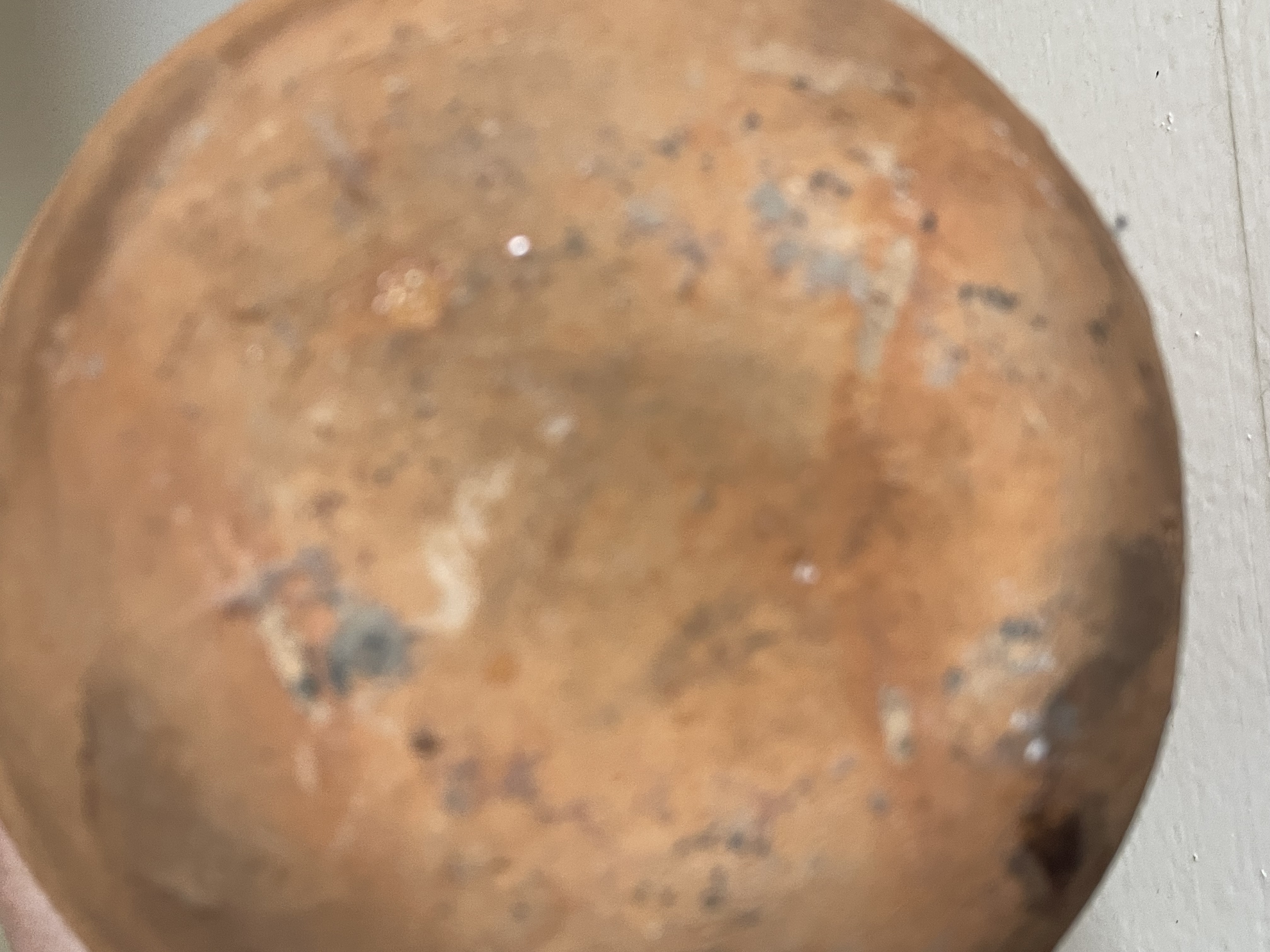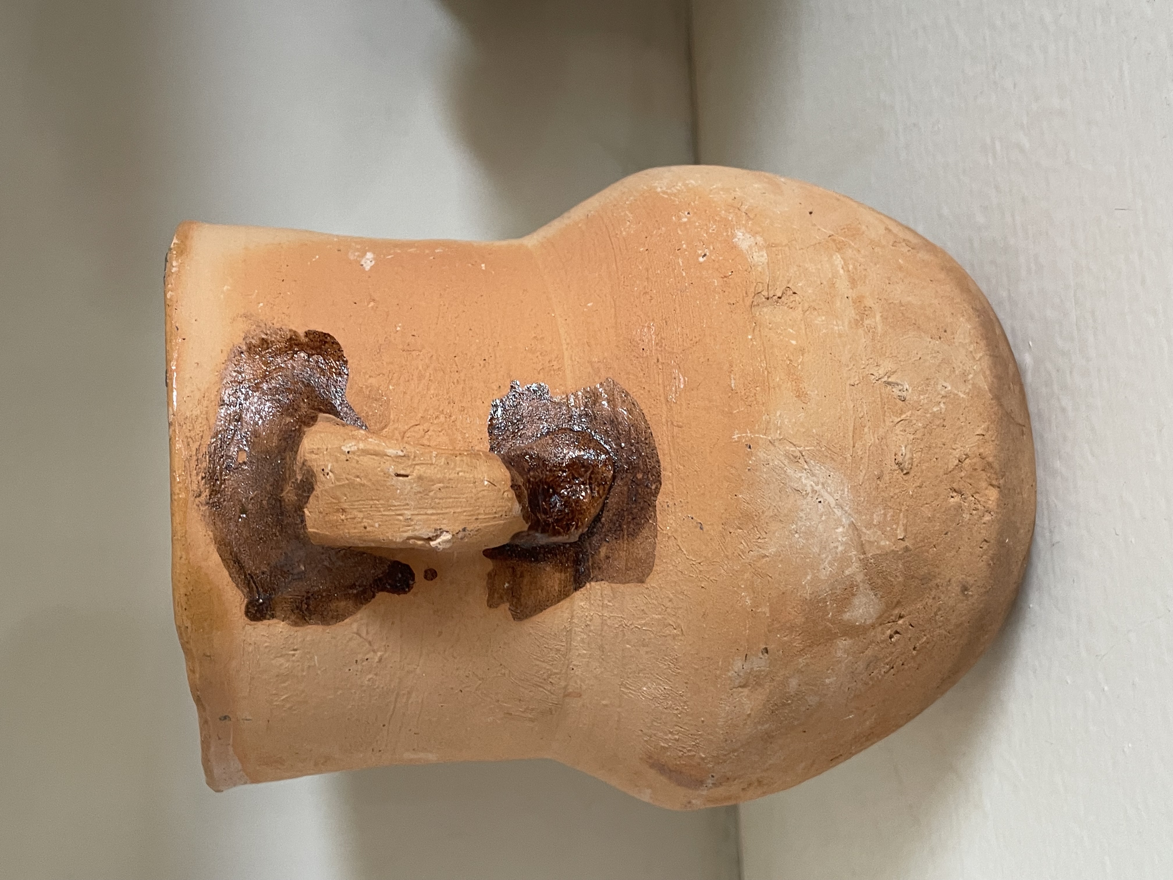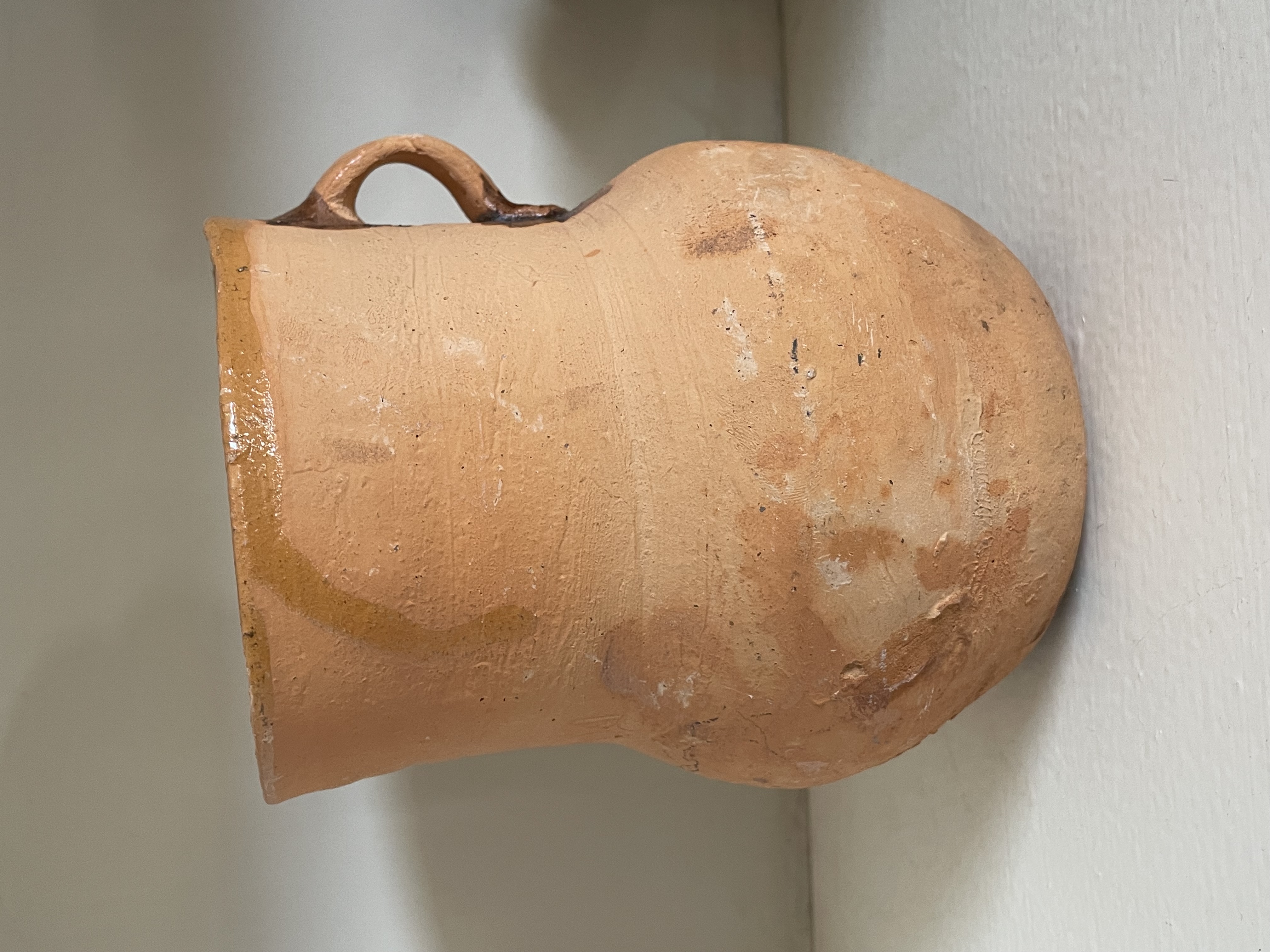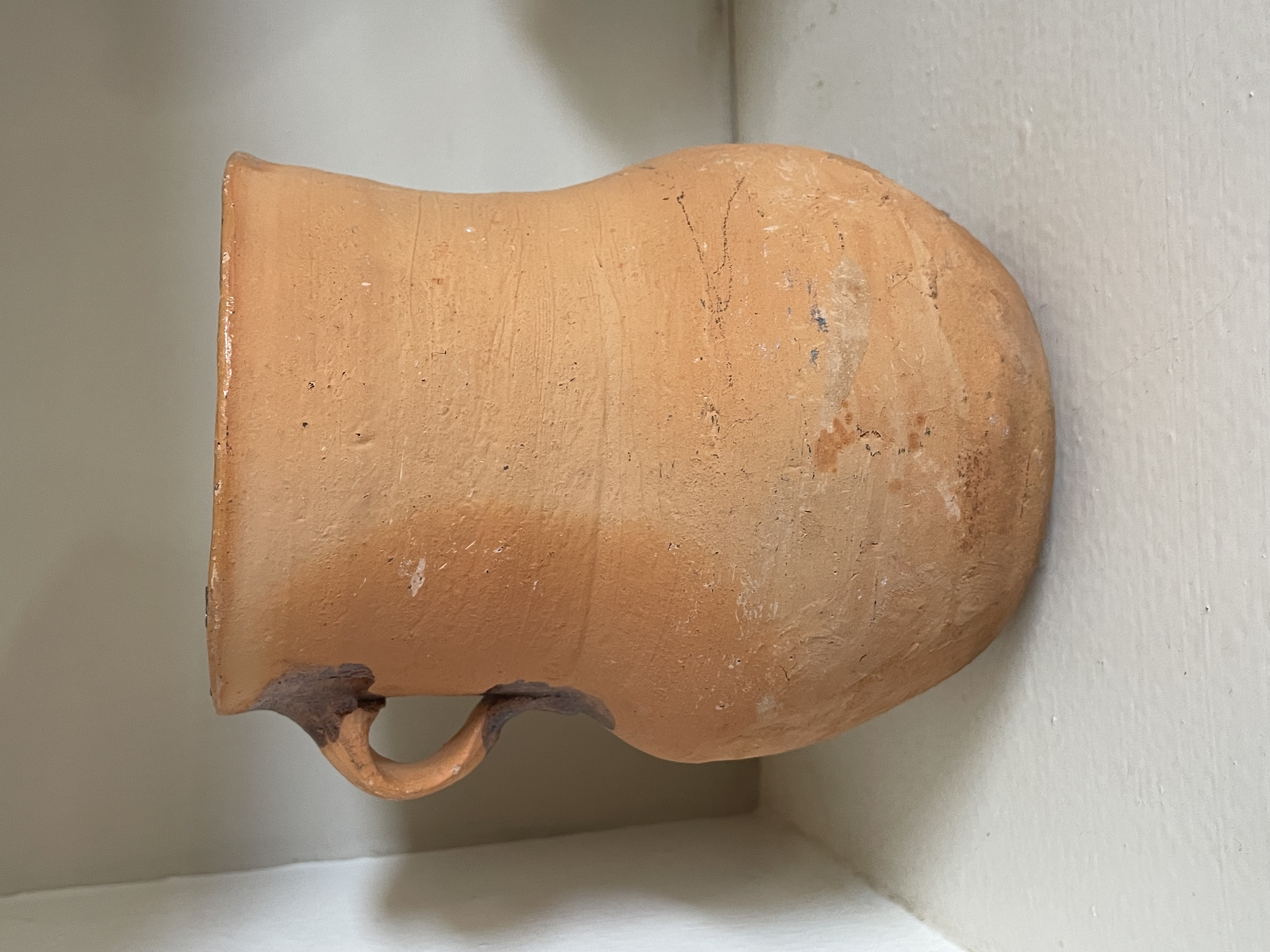 A single archaic or folk art pitcher or jar constructed from reddish-orange earthenware, possibly of Native American origin. The vessel displays a hand-thrown technique, evidenced by visible horizontal striations across the body. The form consists of a rounded, globular base supporting a slightly waisted cylindrical neck, featuring a single applied strap handle affixed to the shoulder and neck. The surface is predominantly unglazed, though localized, uneven applications of dark brown and amber-hued glaze or residue are present near the rim and around the handle attachment points. The piece exhibits characteristics consistent with traditional utilitarian pottery. No maker’s marks, stamps, or textual inscriptions are visible. Measures approximately 6.5″ tall.