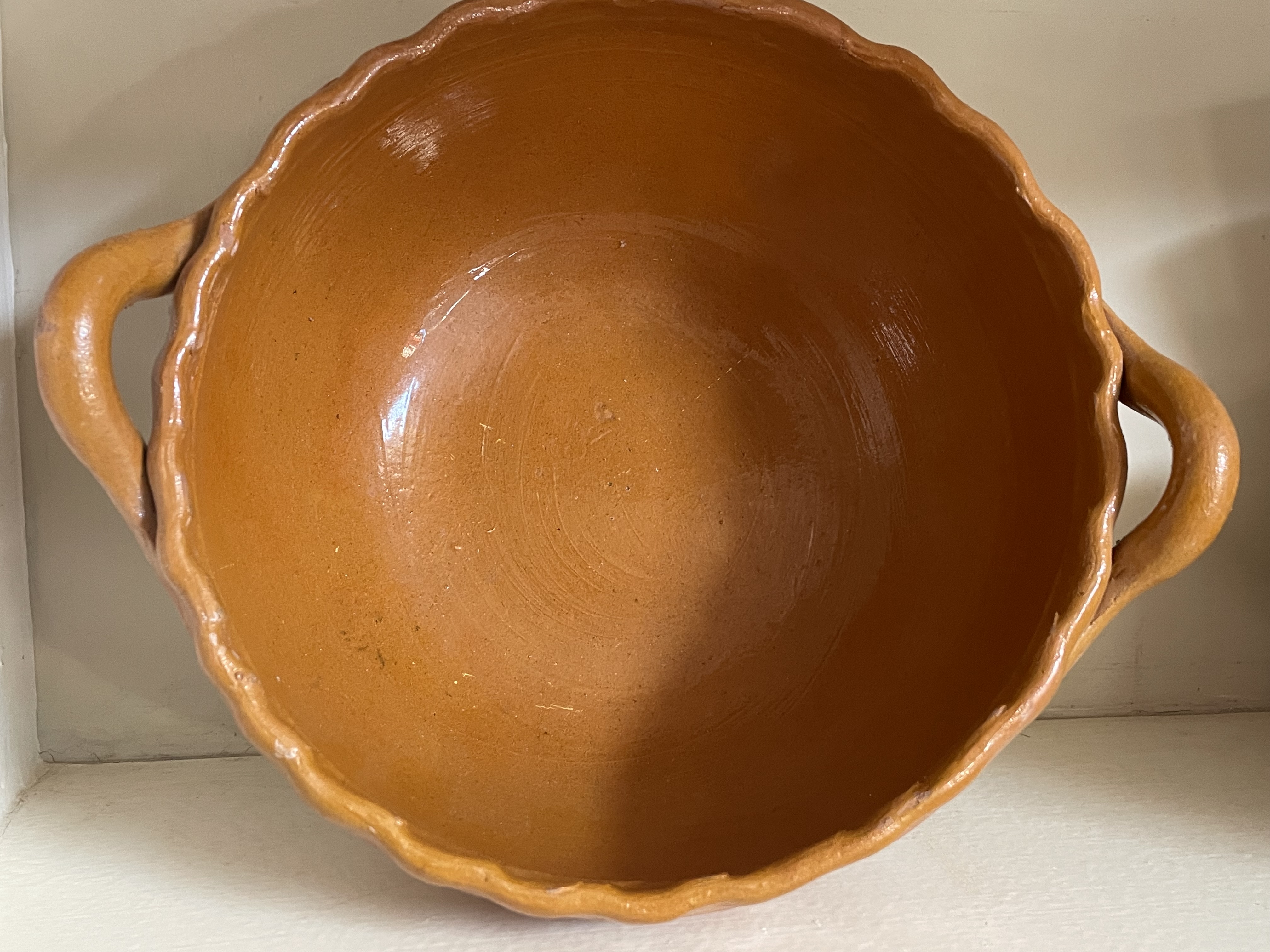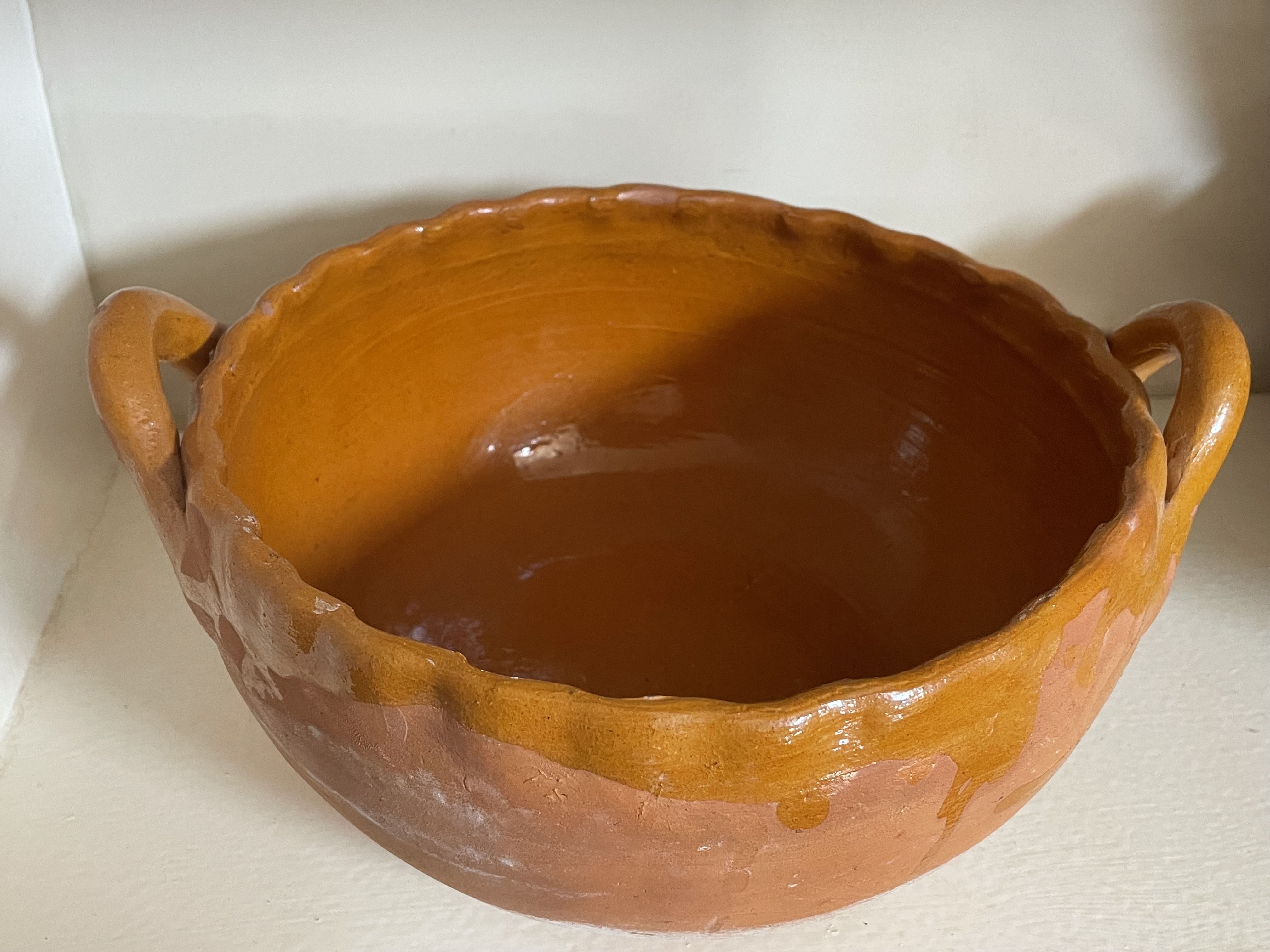 A single rustic earthenware bowl, consistent with Mexican folk pottery or traditional *cazuela* style cookware. The vessel is constructed of reddish-brown terracotta, featuring a deep, round body, a distinctive wavy or scalloped rim, and two applied looped handles. The interior surface and the upper exterior sections, including the handles and rim, are coated in an uneven, glossy amber-colored lead glaze, typical of utilitarian barro pottery. The lower exterior and base are unglazed. There are no visible manufacturer’s marks, signatures, or inscriptions. Measures approximately 10″ across.