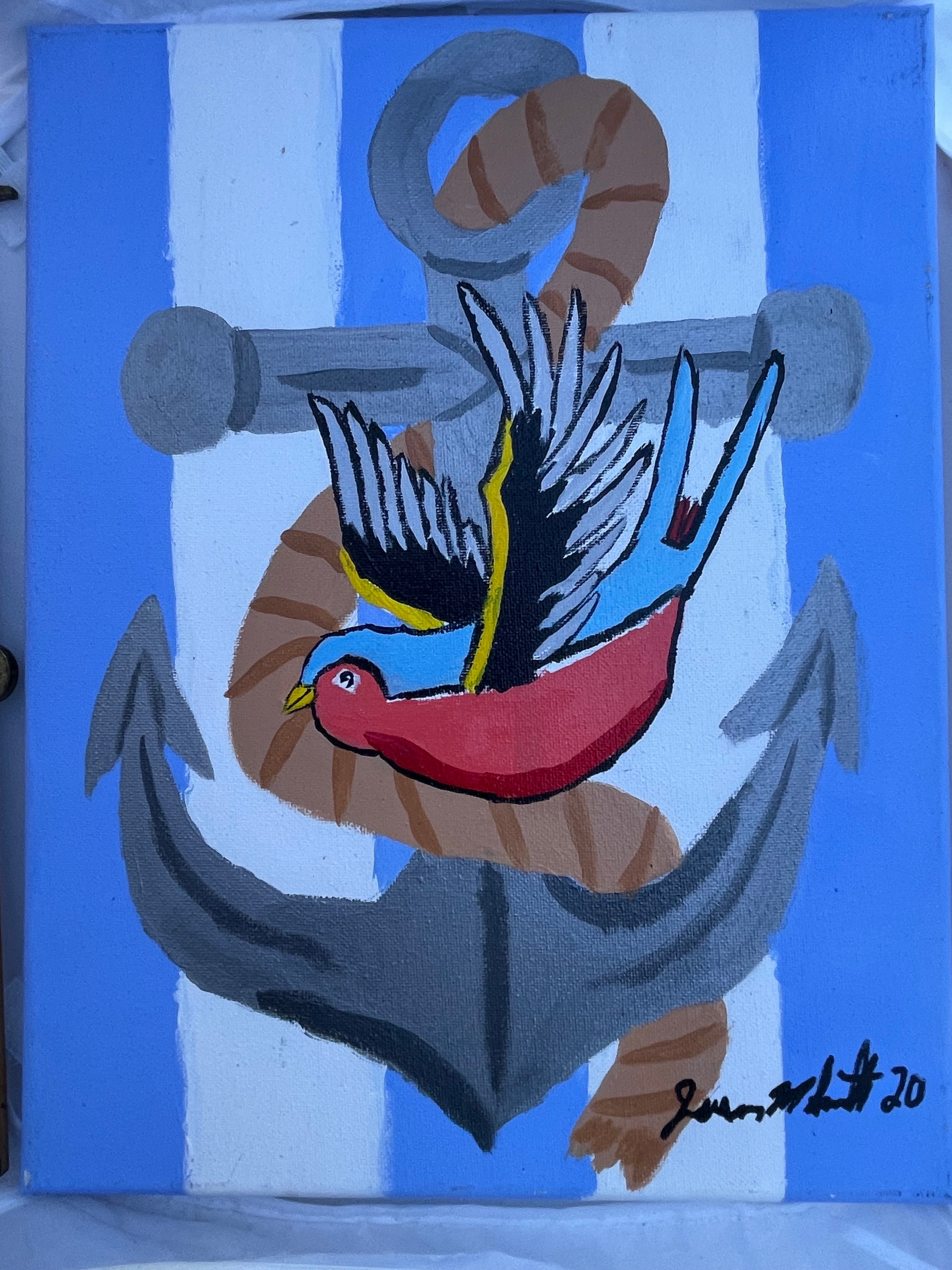 A modern painting executed in the American Traditional tattoo flash style, signed by the artist Jason M. Smith and dated 2020. The work is executed on a wood panel, utilizing acrylic or oil paints. The composition features a central nautical motif: a brightly colored, stylized swallow or sparrow rendered primarily in red, light blue, black, and yellow, positioned over a large gray anchor. The anchor is entwined with a coiled brown rope. The background consists of alternating vertical stripes of light blue and white. The signature “Jason M. Smith” followed by “20” is visible in black paint in the lower right corner.