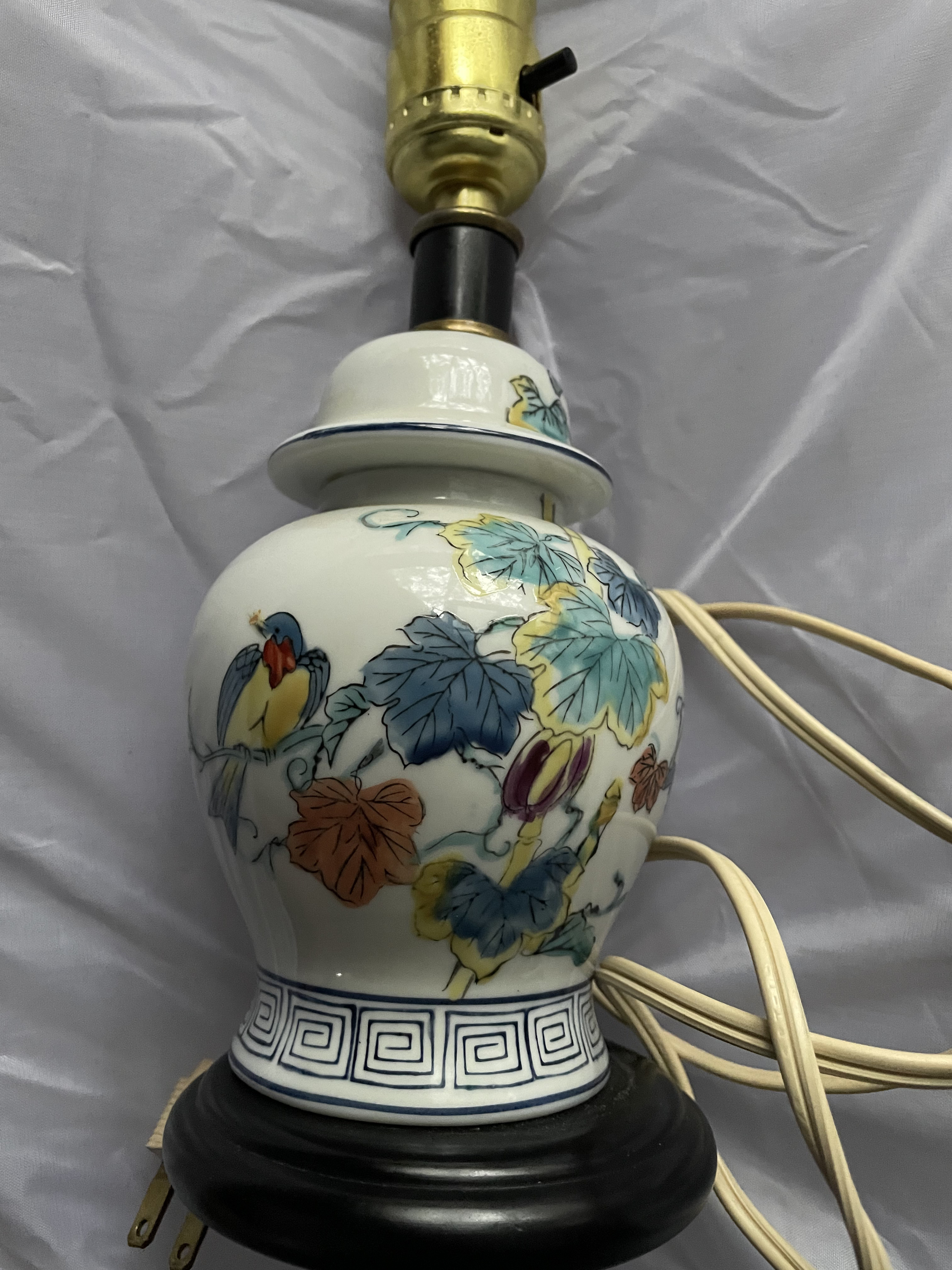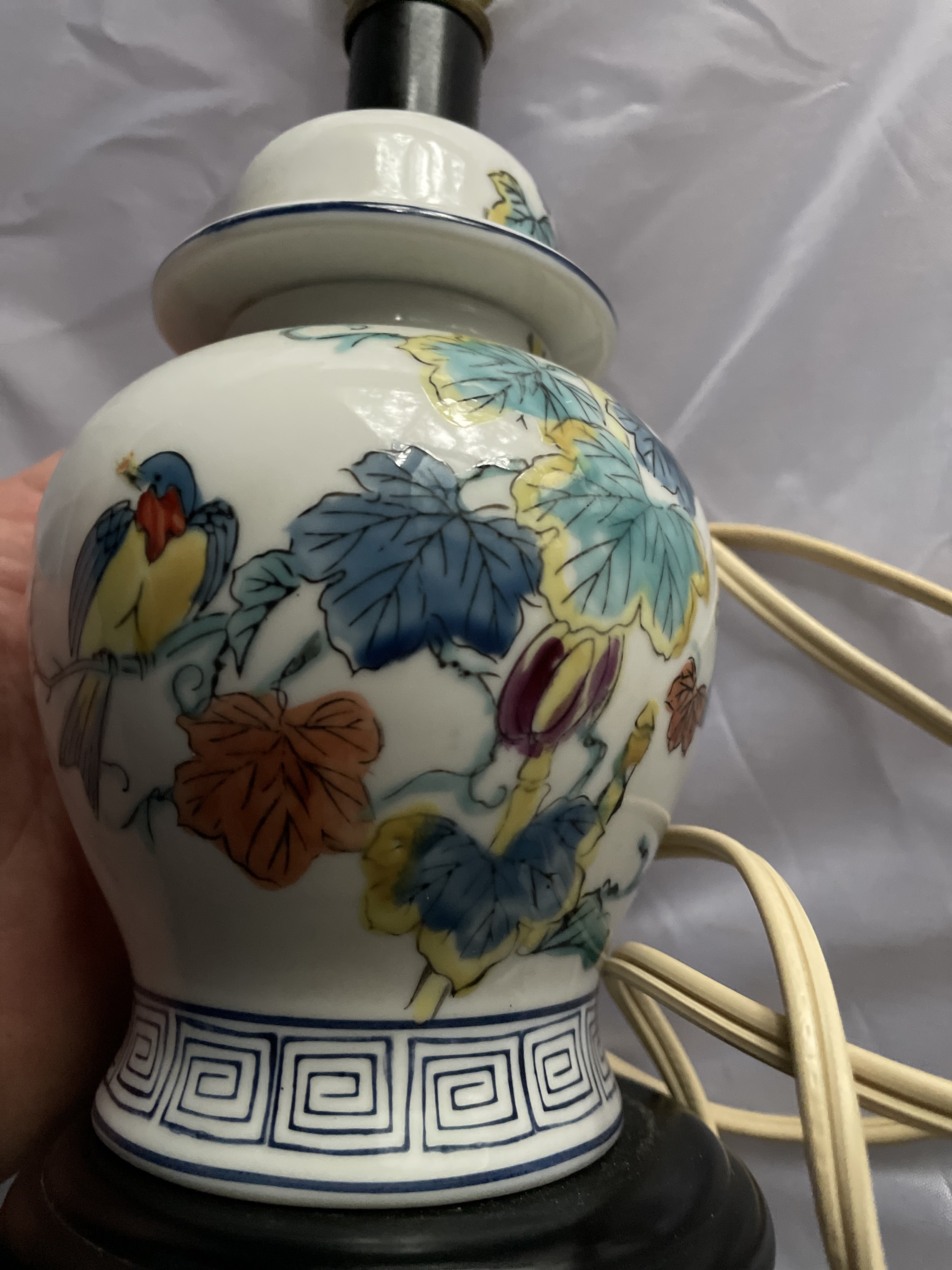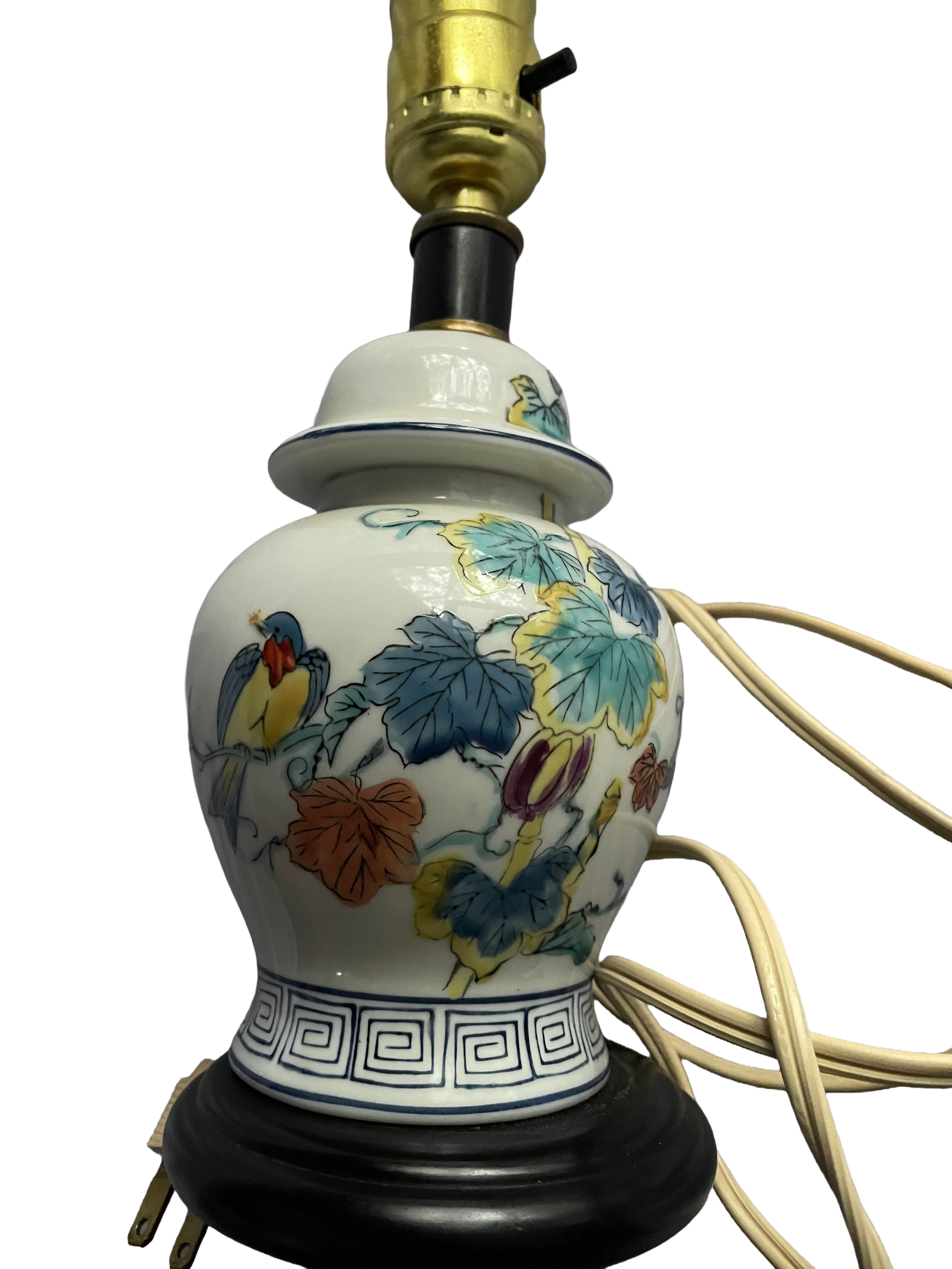 A single Chinoiserie style porcelain table lamp, likely dating to the Mid-20th Century. The lamp features a vase or ginger jar form body constructed from white glazed porcelain. The body is decorated in polychrome enamels in a style often associated with the ‘Tobacco Leaf’ pattern, featuring a detailed bird perched among large, stylized leaves and floral motifs. The palette includes vibrant tones of blue, teal, yellow, orange, red, and purple. The foot of the porcelain body is encircled by a continuous blue and white geometric key or fret border. The porcelain is mounted on a dark circular base, possibly wood or composite material, and is topped with a brass-toned socket assembly. A coiled beige electrical cord is attached. From base to socket is 10″.