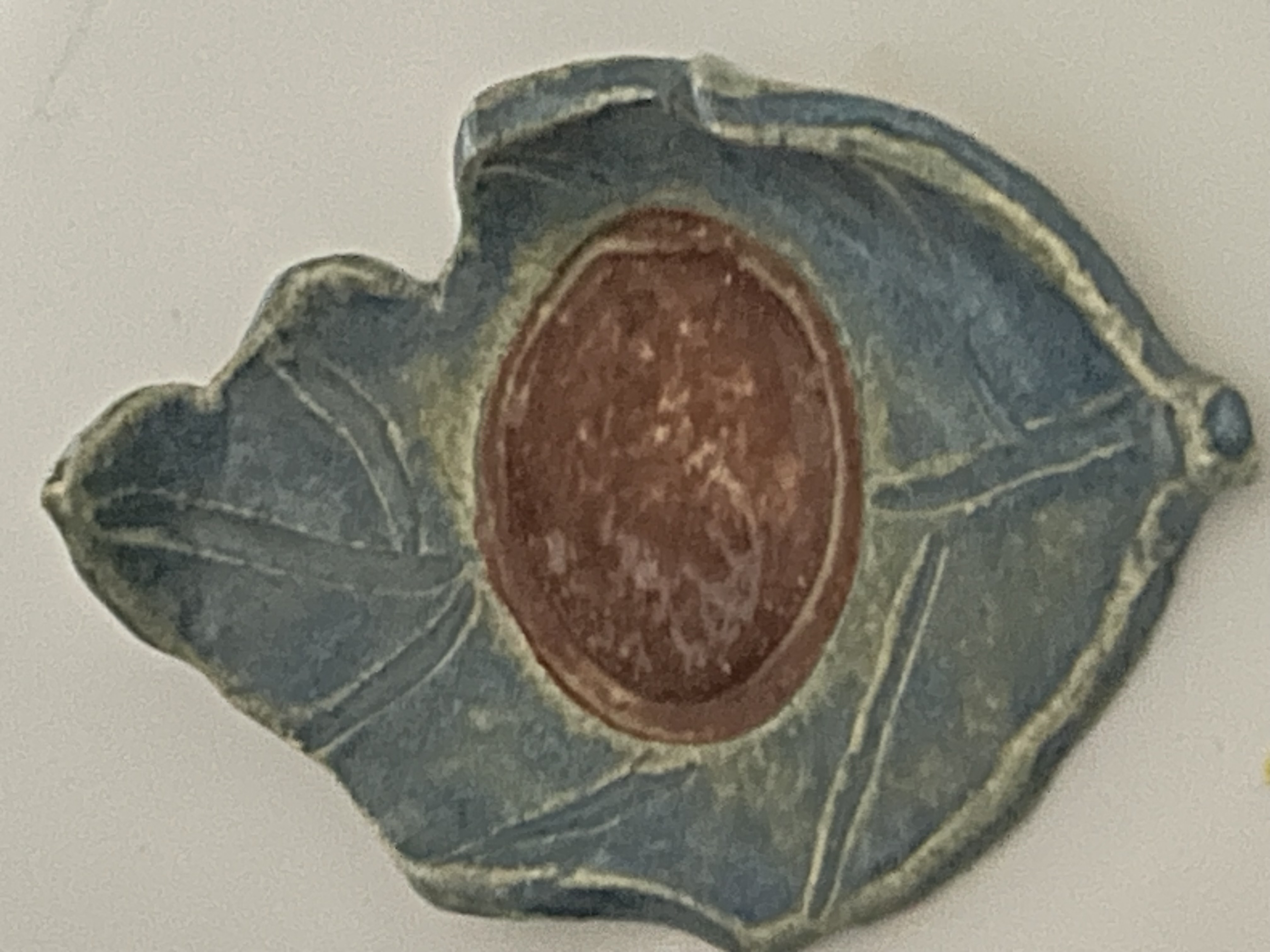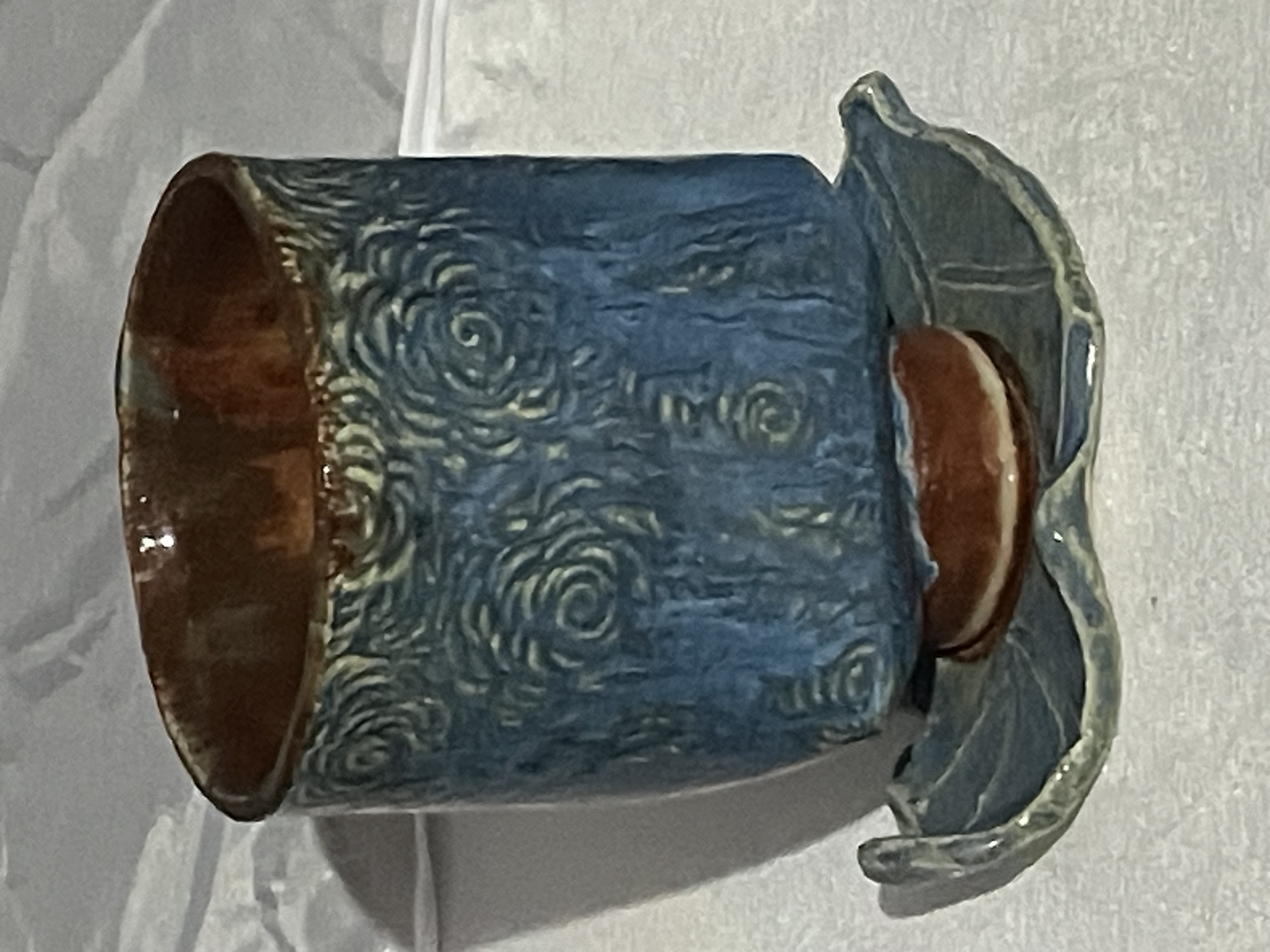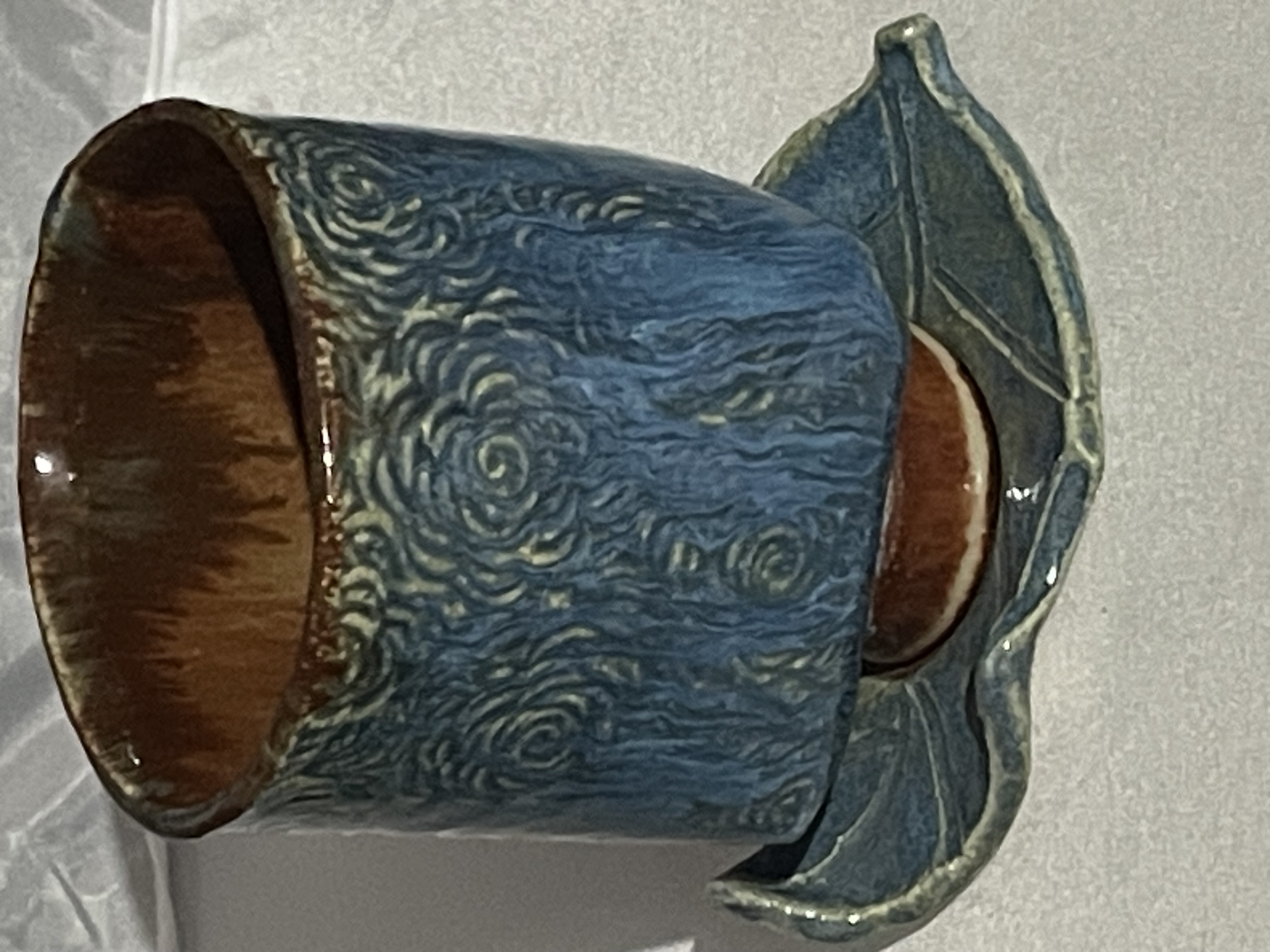 A pair of contemporary studio pottery items comprising a cylindrical drinking vessel (cup or beaker) and a complementary leaf-form saucer. The vessel features an impressed surface texture of swirling, rose-like motifs beneath a mottled, highly reactive blue glaze. The interior and the exposed base ring are finished in a glossy reddish-brown glaze. The accompanying saucer is molded into a stylized leaf shape, finished primarily in blue/green glazes with a contrasting reddish-brown oval well matching the cup’s interior. The unglazed base of the vessel is inscribed in dark pigment with the initials SH above the numerals 09. Measures approximately 4″ tall.