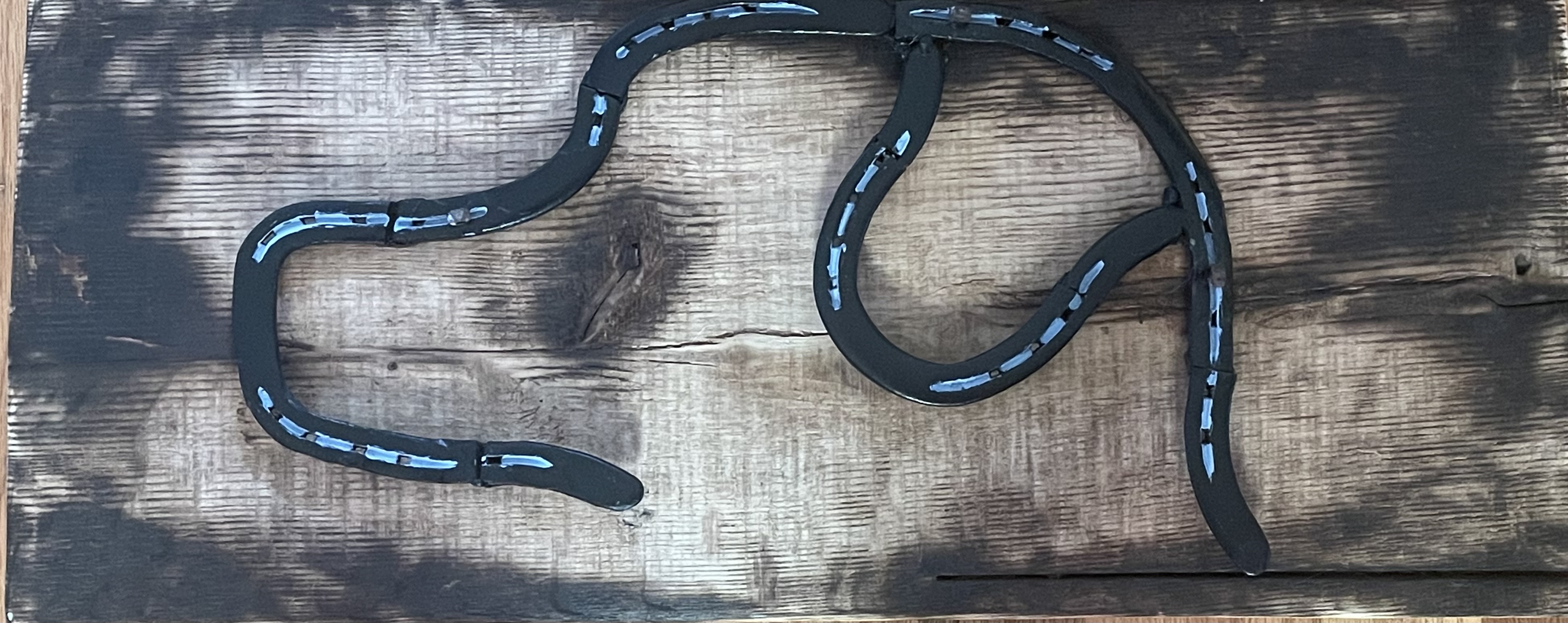 A single piece of contemporary folk art wall decor constructed from segmented, repurposed horseshoes mounted onto a horizontal wooden plank. The metal elements are finished in black paint and arranged in a stylized, abstract serpentine or snake-like design. The characteristic rectangular nail slots of the horseshoes are filled with a bright, light blue reflective material, likely resin or enamel, providing a contrasting accent. The wooden backing exhibits a pronounced grain and a dark, weathered finish consistent with the Shou Sugi Ban technique, enhancing the rustic aesthetic of the piece. This item utilizes the material of horseshoes, often associated with traditional folk art. Measures approximately 25″x 10″.
