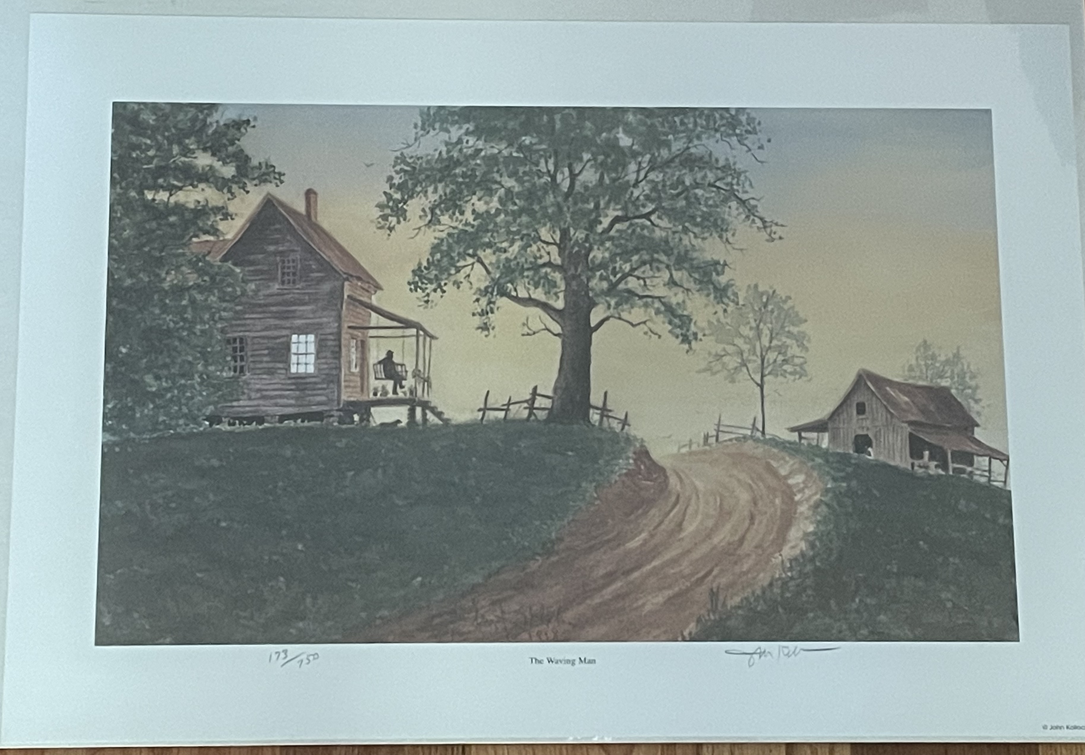 A single limited edition print on paper by artist John Kollock, titled “The Waving Man.” The print is executed in a realist folk-art style, depicting a rustic rural landscape scene. The composition features a wooden cabin situated on a hill to the left with a figure seated on the porch, a large central tree, and a winding dirt road leading towards a barn structure on the right. The print is hand-numbered in pencil in the lower left margin as 173/750. The title “The Waving Man” is centered below the image. It bears a corresponding handwritten signature in pencil in the lower right margin, consistent with the artist John Kollock. The artist’s copyright is faintly visible in the lower right corner of the image area. Measures approximately 19″x 13″.