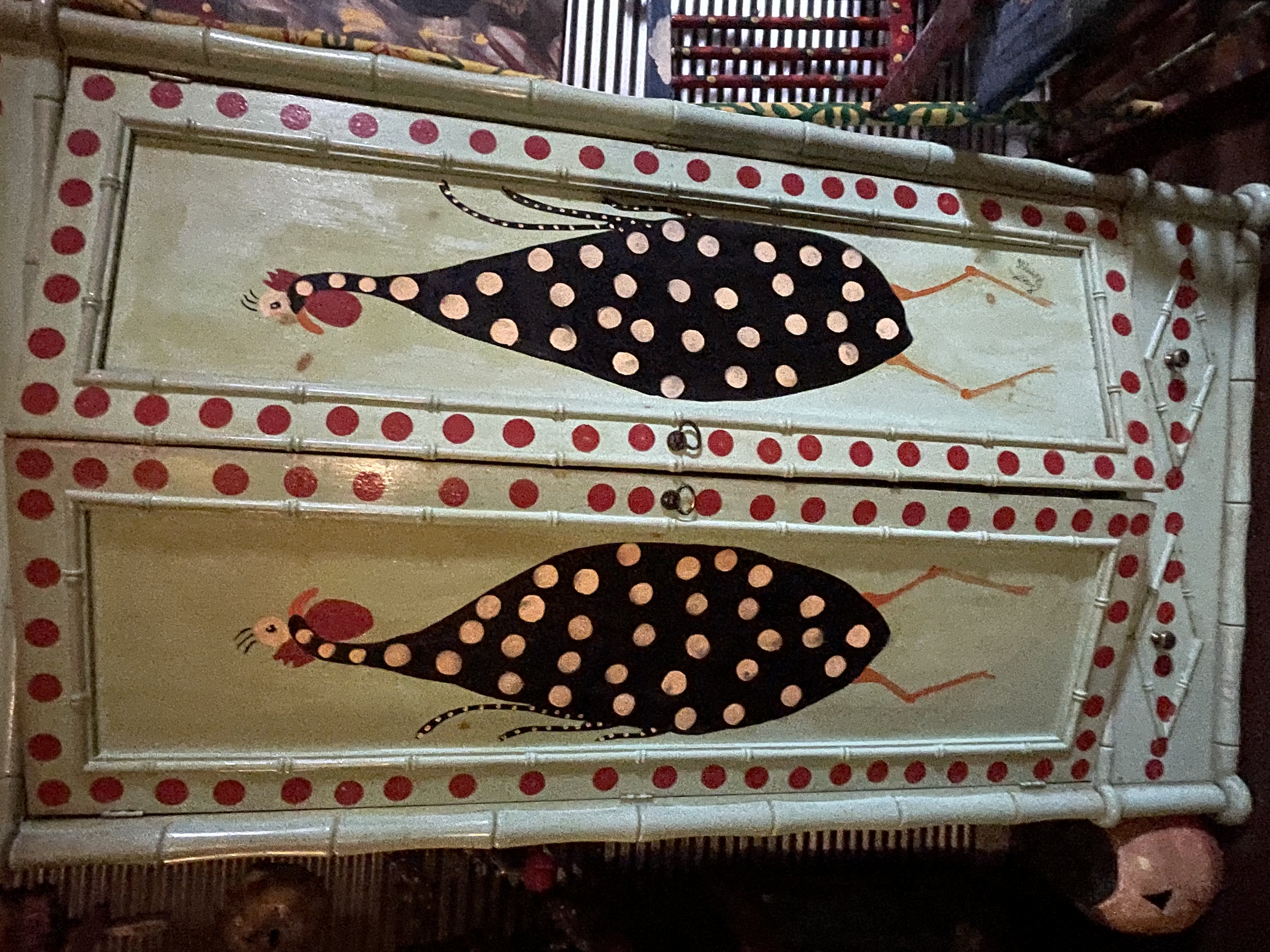A large painted wood armoire or cabinet executed in the Scott Peppers folk art style, consistent with Georgia folk art traditions. The cabinet features a light sage green painted finish. The structure is accented by faux bamboo molded trim along the vertical edges, painted with red polka dots. The two front doors are decorated with large, stylized black birds, resembling Guinea fowl or roosters, detailed with gold polka dots. The piece is fitted with two metal ring pulls. The interior is configured for contemporary media storage, featuring a large upper shelf, an open central storage area, and three functional drawers below.