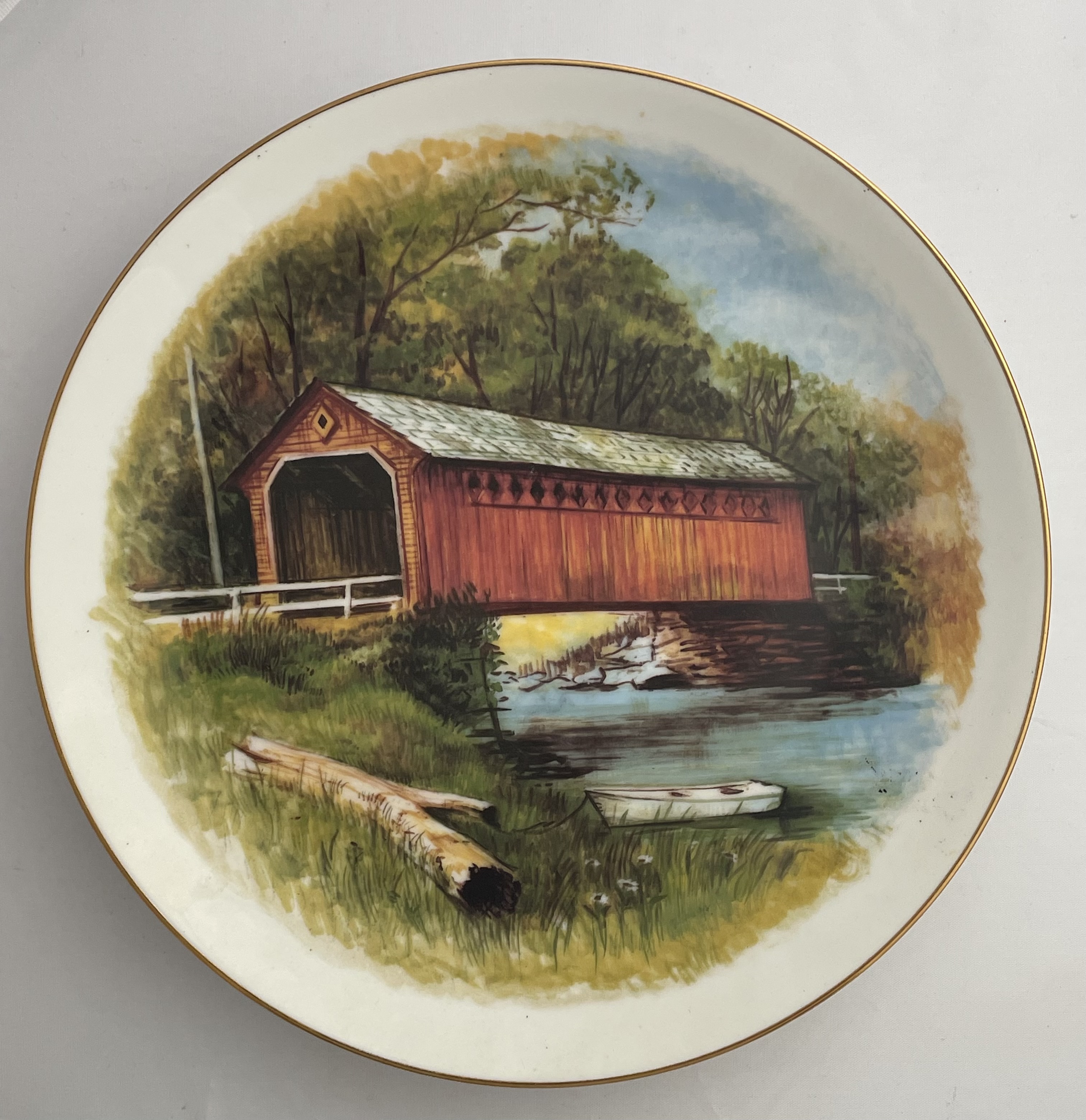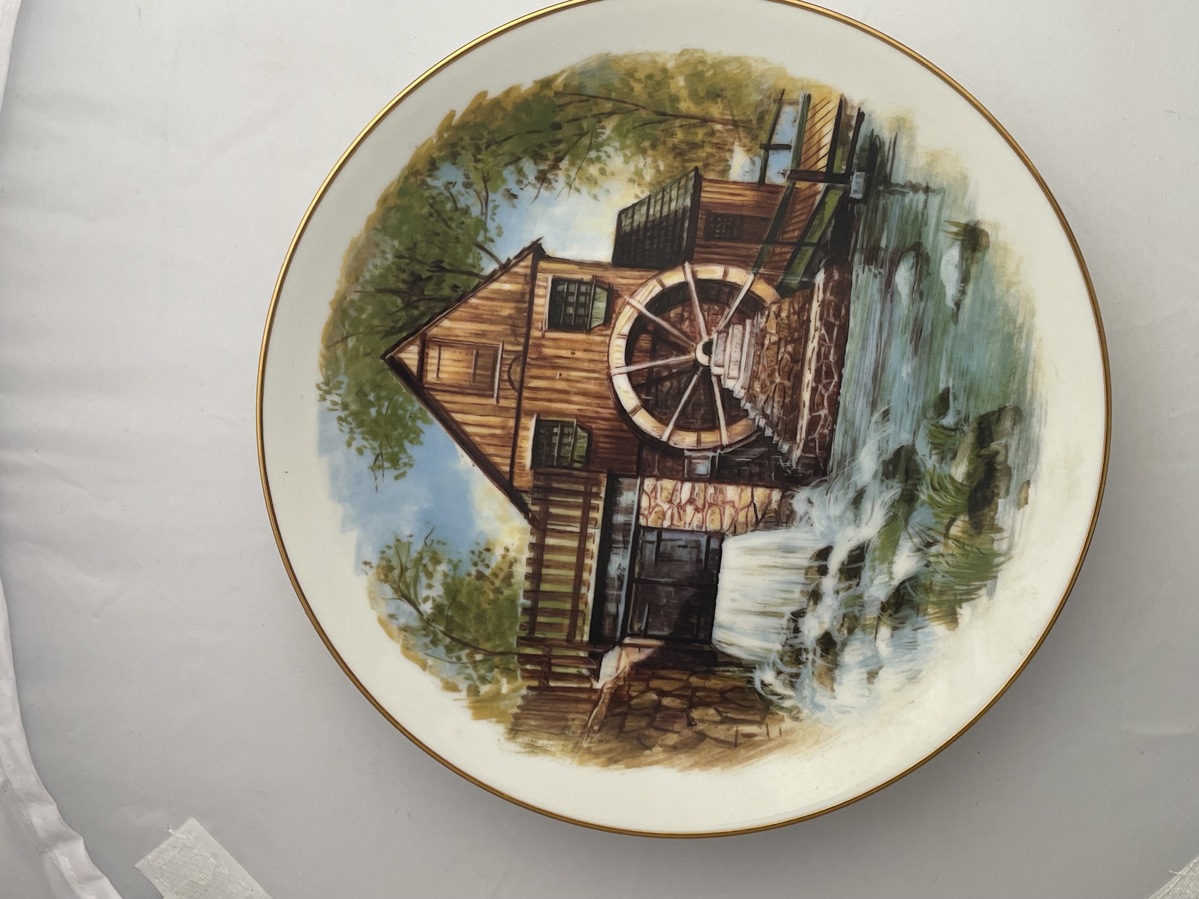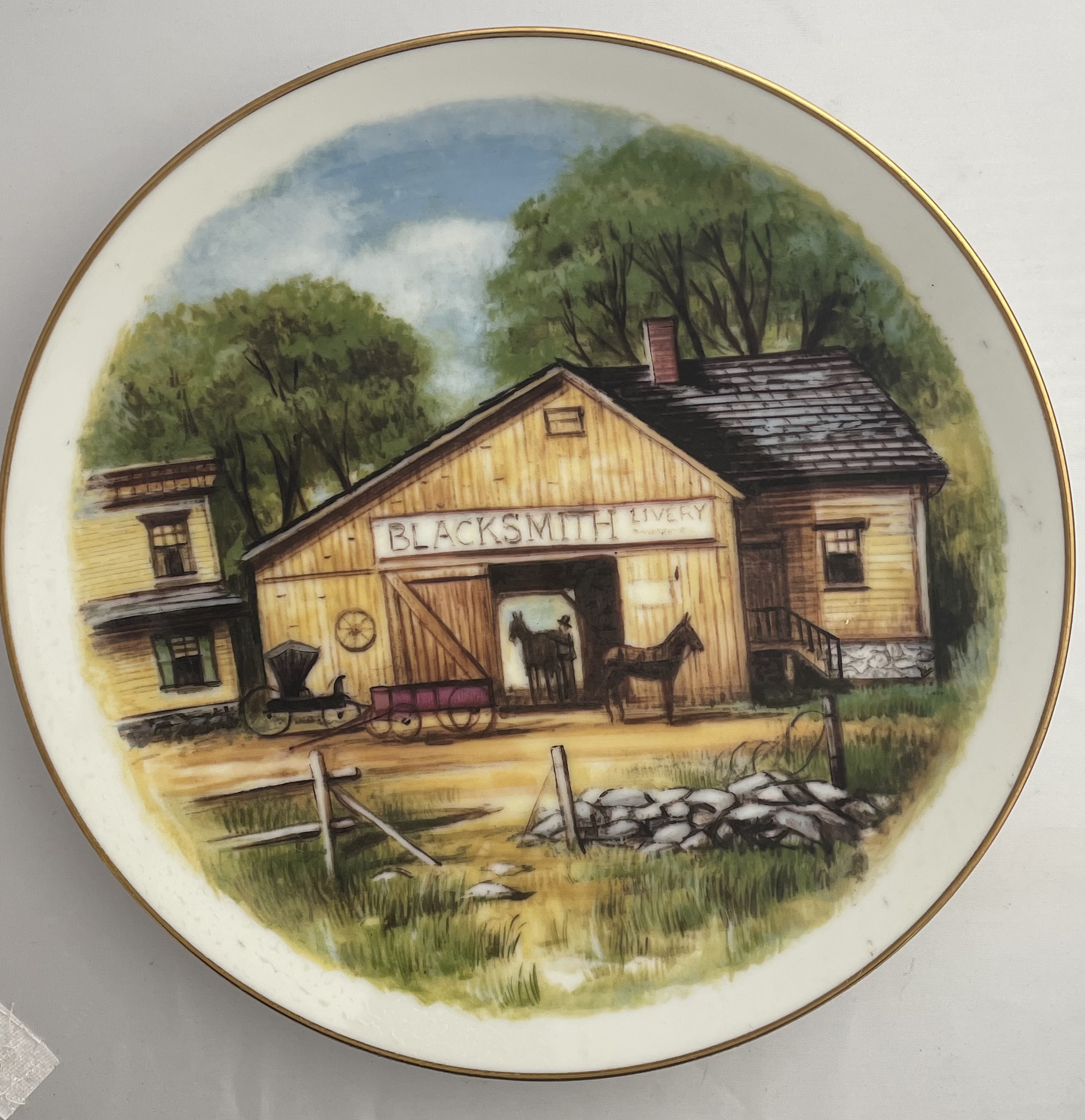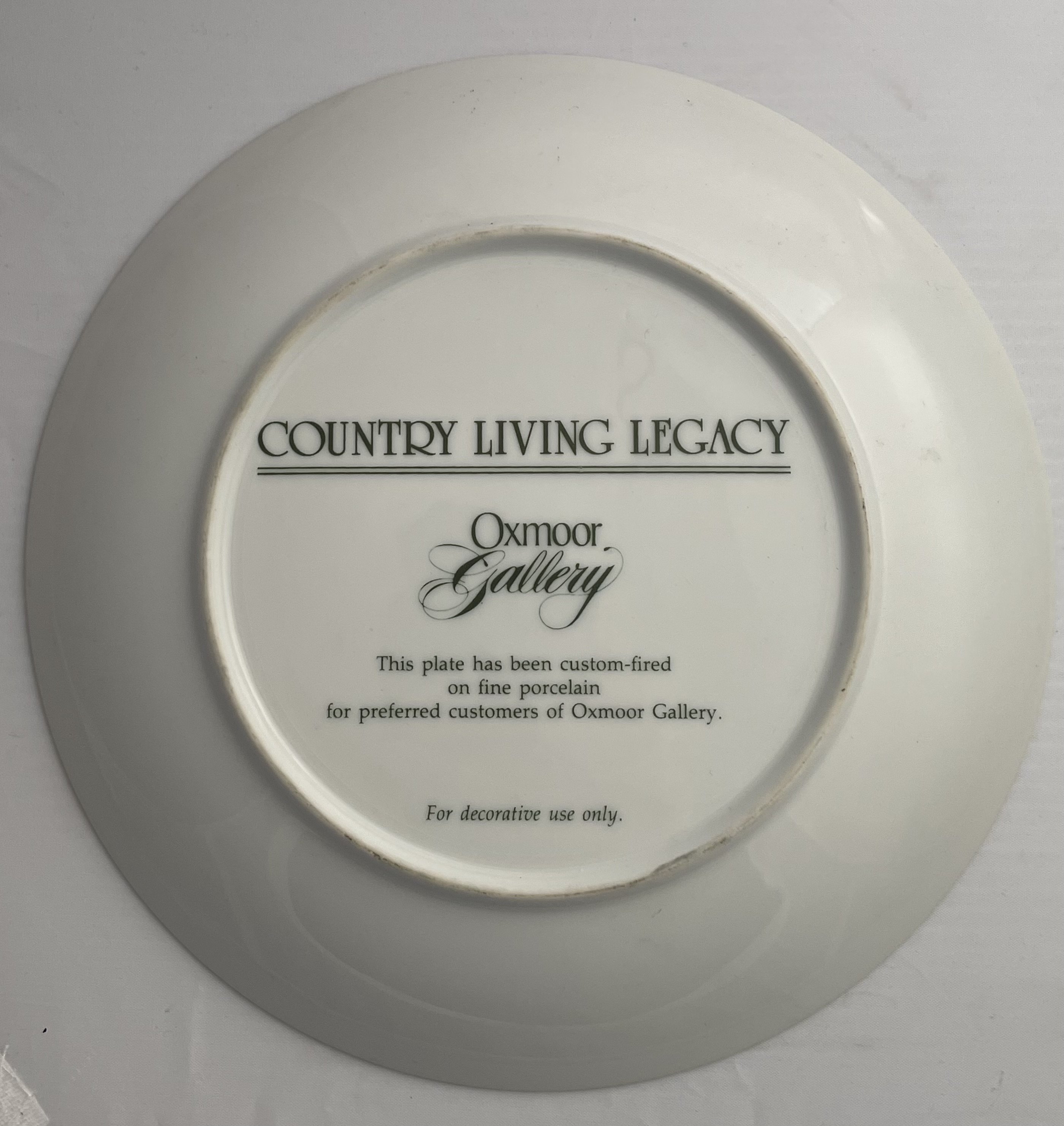 The lot consists of three matching decorative collector plates from the “Country Living Legacy” series, custom-fired for the Oxmoor Gallery. Each plate is crafted from fine white porcelain and features a thin gold-toned rim. The decoration is applied via transfer print, depicting historic rural architecture and pastoral scenes. The three distinct scenes include a building labeled “BLACKSMITH LIVERY,” a functioning water mill with a large wooden wheel, and a traditional red covered bridge. The reverse of the plates is marked in black with the series title “COUNTRY LIVING LEGACY,” the name “Oxmoor Gallery,” and explanatory text stating: “This plate has been custom-fired on fine porcelain for preferred customers of Oxmoor Gallery. For decorative use only.”