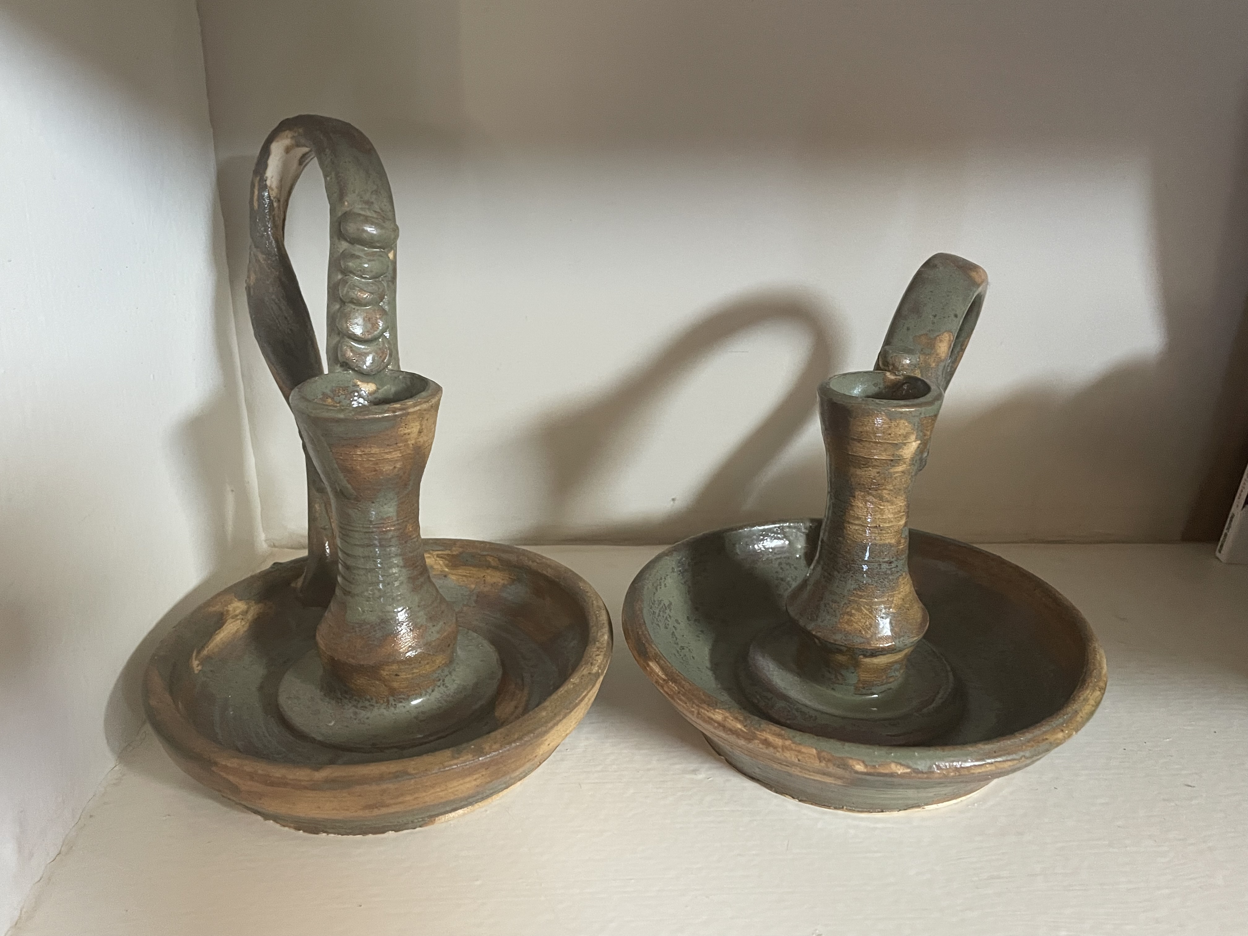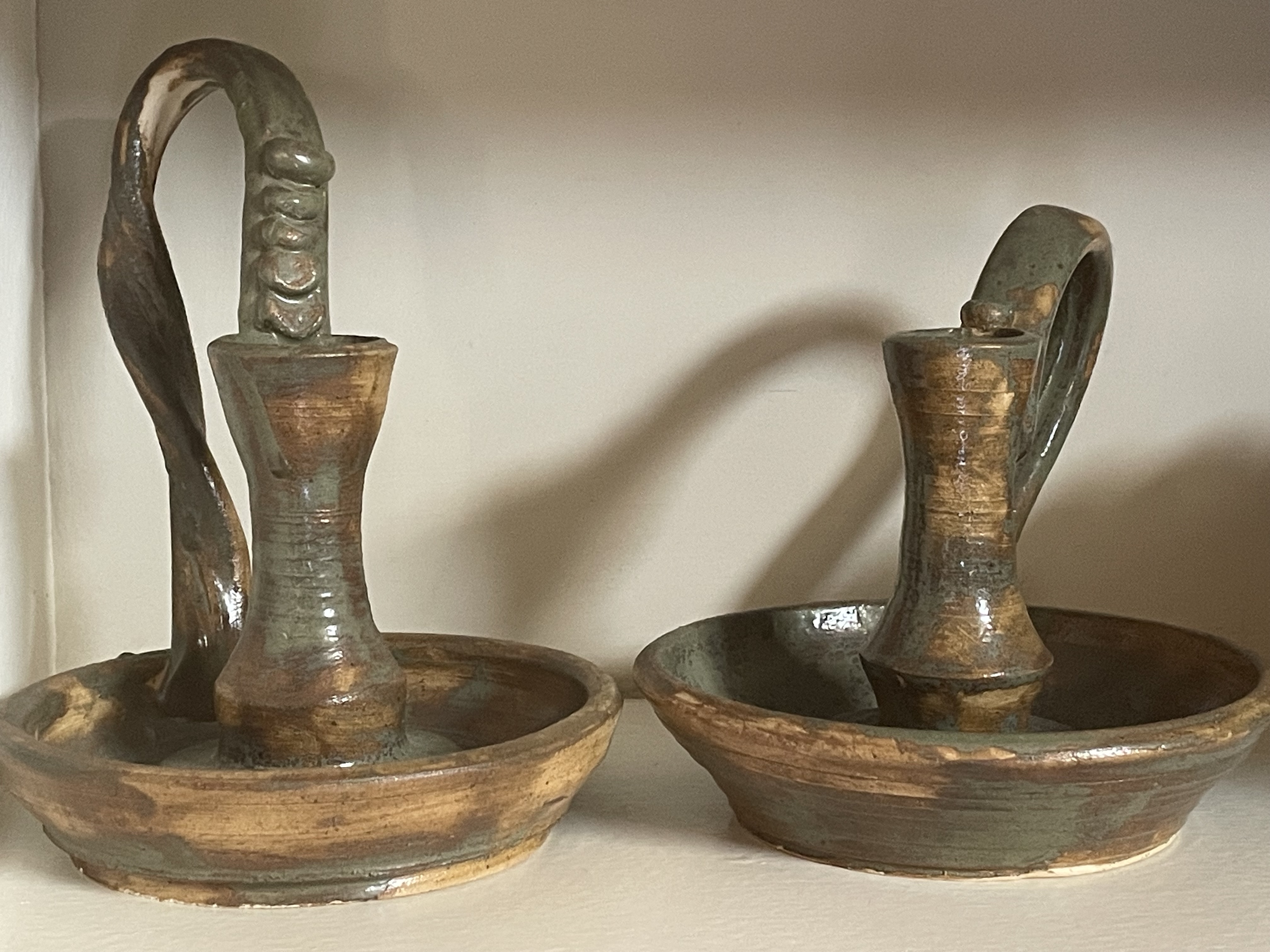 A pair of contemporary studio pottery chambersticks crafted by Brad Abernathy, dated 2005. The hand-thrown earthenware pieces feature a rustic, high-fired, variegated glaze combining earthy tans and browns with an opaque, mottled grayish-green glaze. Each piece is formed with a wide, shallow drip pan base, a central tapered candle socket, and a tall, looping strap handle. The handle of the left stick is decorated with applied ridges. The base of one item is incised with the artist’s signature and date, reading BRAD Abernathy 2005, along with a stylized mark.