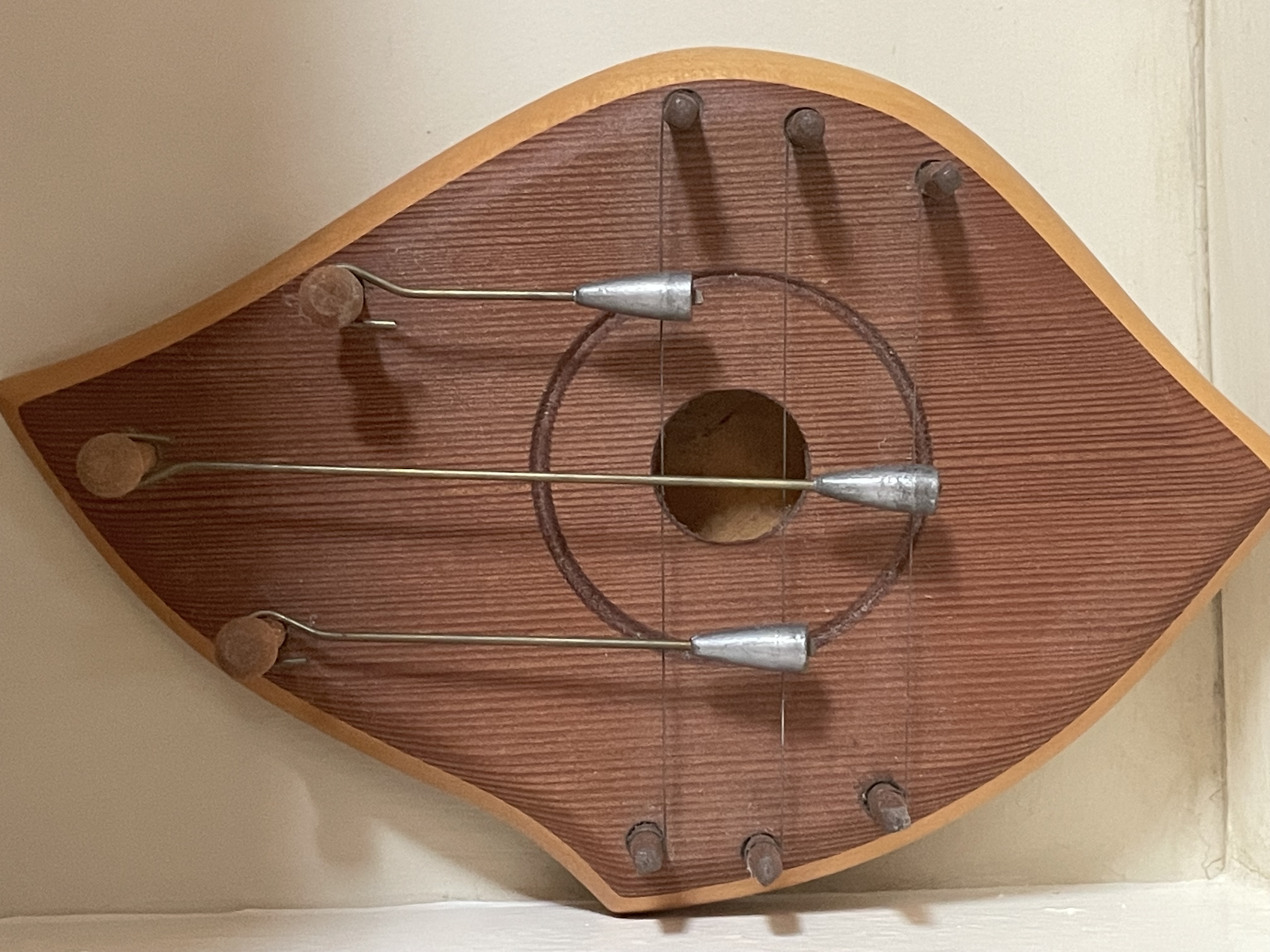 This is a vintage door harp manufactured by Two Sisters Musical Instruments, dated 1985. The instrument is constructed of two-toned wood, featuring a distinctive teardrop or leaf shape. The central panel displays a vertically ribbed texture surrounding a circular sound hole and an incised decorative ring. The instrument is fitted with six wooden tuning pegs and currently strung with three taut metal strings. Attached are three conical metal striker weights suspended from brass rods with wooden handles, designed to chime when the door is opened or closed. Comes with original instruction manual. The back of the instrument is stamped with the identifying text: Two Sisters Musical Instruments ©1985 Edwards. Approximately 8″ tall.